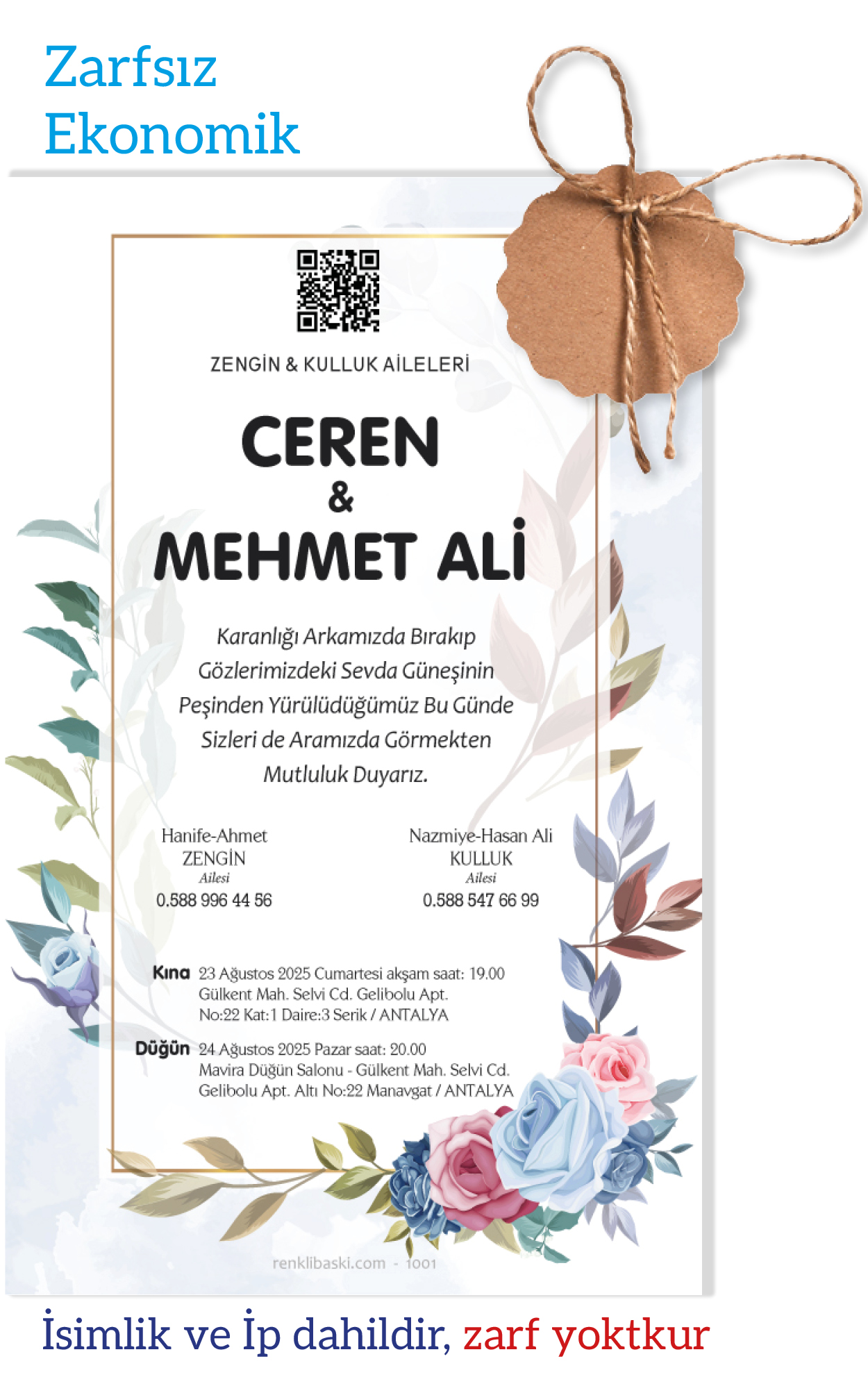 Tasarımda bulunan tüm yazı alanlarının değiştirilmesini talep edebilirsiniz. Hazırlanan davetiye tasarımının onayı alınmadan baskısı yapılmaz. Kargo içerisinde seçtiğiniz adet kadar davetiye kartı, isimlik ve ip gönderilir. İp ile isimliklerin bağlanma işlemi size aittir.