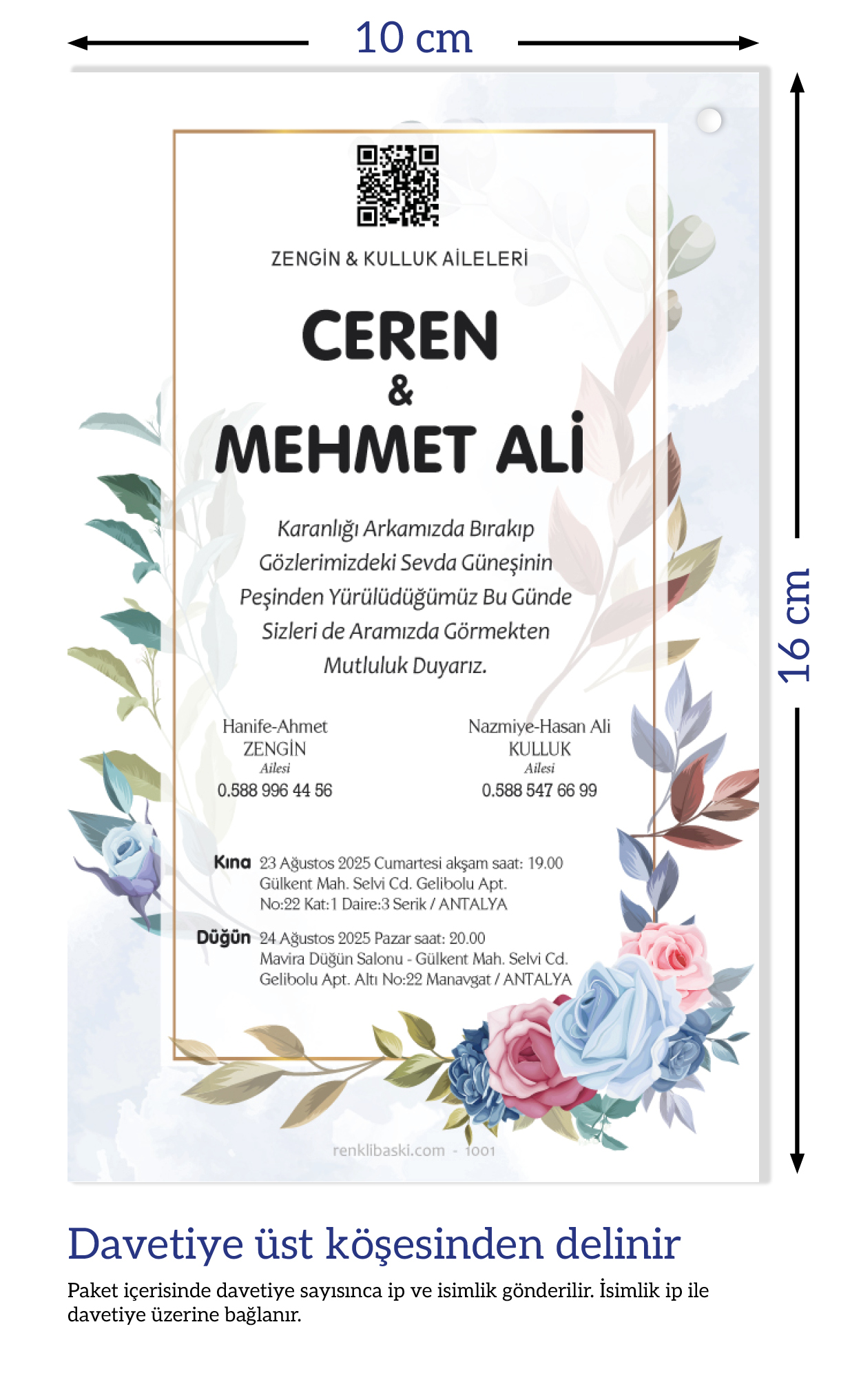 Davetiyemiz 10x16 cm ölçülerinde, dikey tasarıma sahiptir ve üst köşesinden delinerek isimlik ip ile bağlanmaktadır.