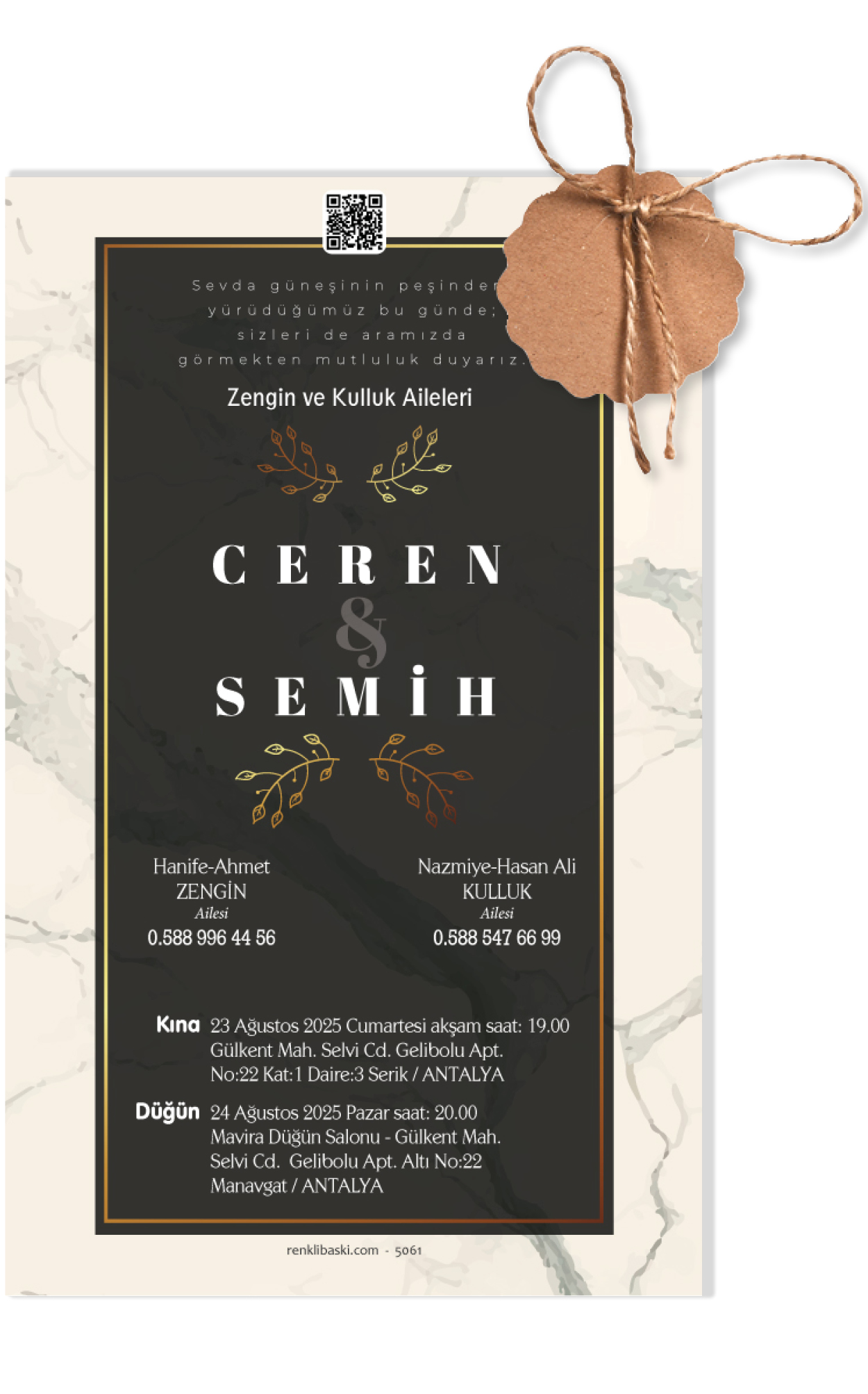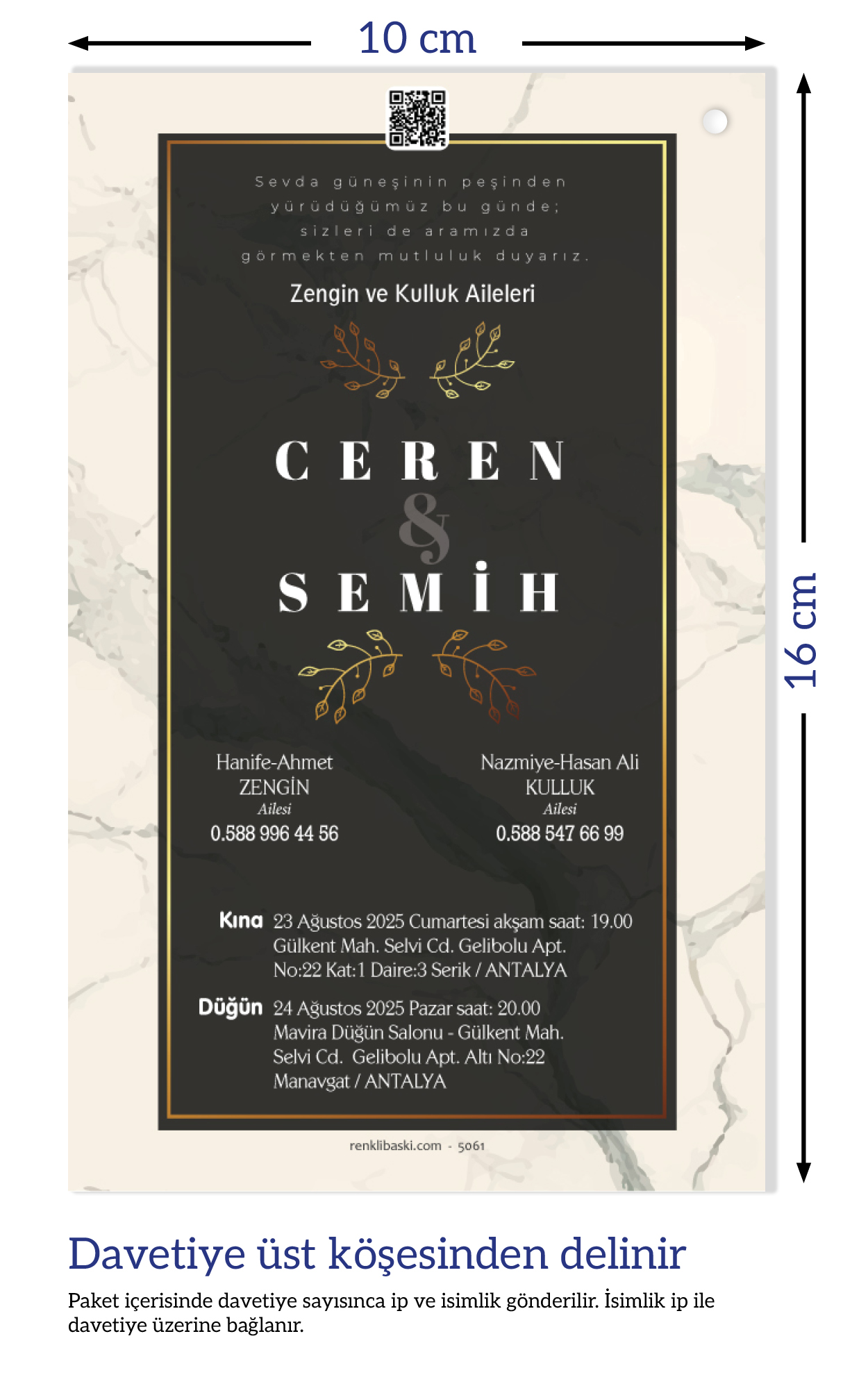 Davetiyemiz 10x16 cm ölçülerinde, dikey tasarıma sahiptir ve üst köşesinden delinerek isimlik ip ile bağlanmaktadır.