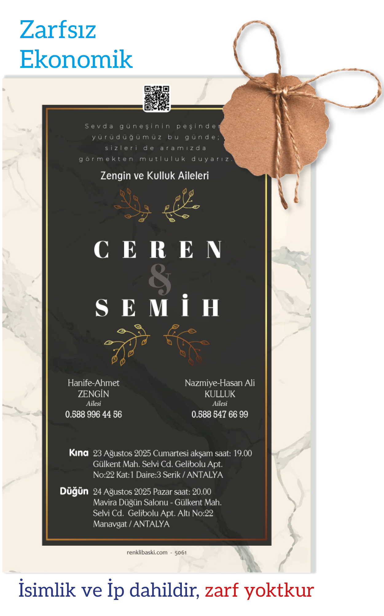Ekonomik davetiye modelimizin düğün, nişan, kına gibi etkinlikleriniz için tasarlanmasını isteyebilirsiniz. Tasarım ücretsizdir. Tasarım hazırlatmak için 0555 190 02 00 numaralı WhatsApp hattımızla iletişime geçebilirsiniz.