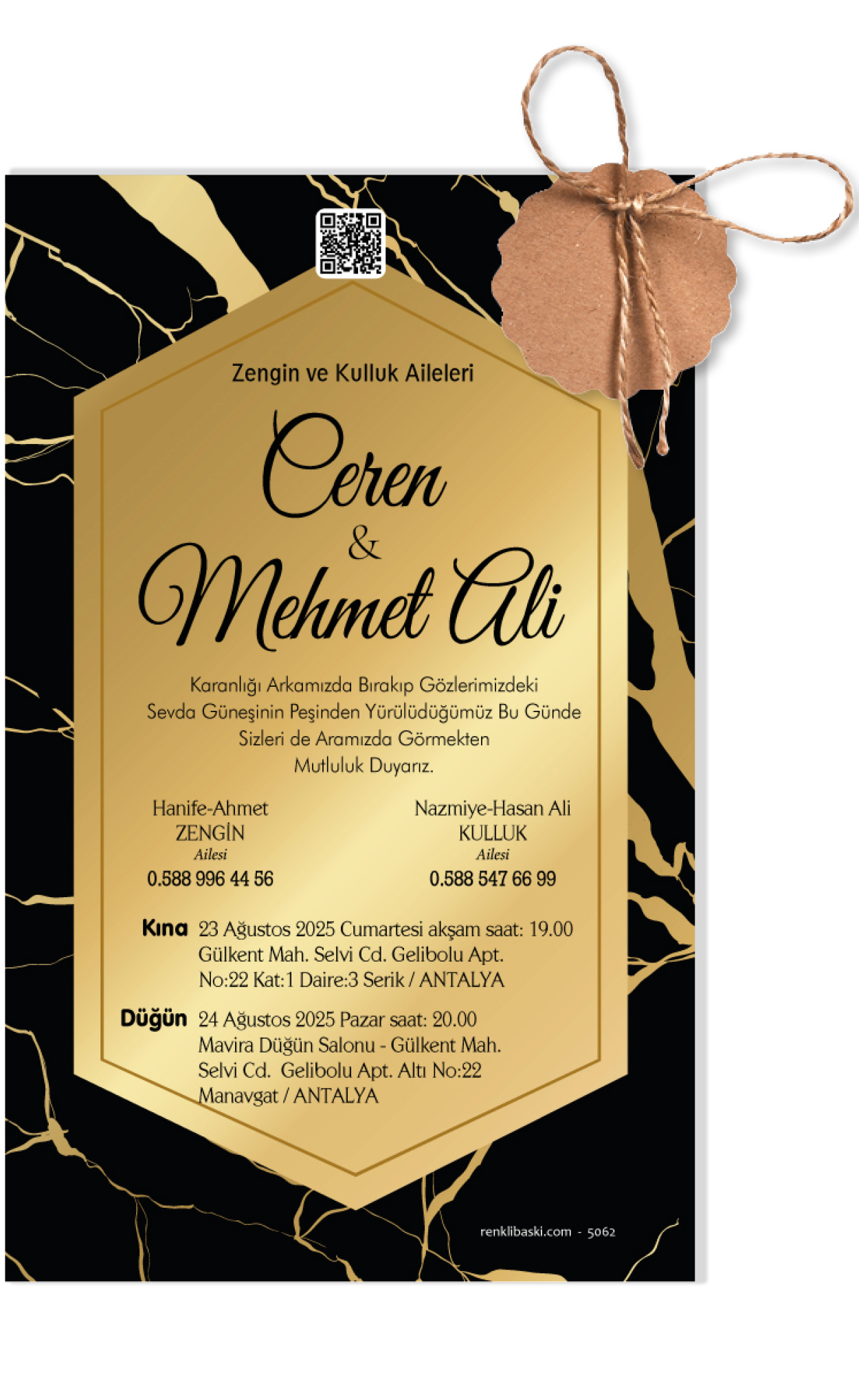 Tasarımda bulunan tüm yazı alanlarının değiştirilmesini talep edebilirsiniz. Hazırlanan davetiye tasarımının onayı alınmadan baskısı yapılmaz. Kargo içerisinde seçtiğiniz adet kadar davetiye kartı, isimlik ve ip gönderilir. İp ile isimliklerin bağlanma işlemi size aittir.