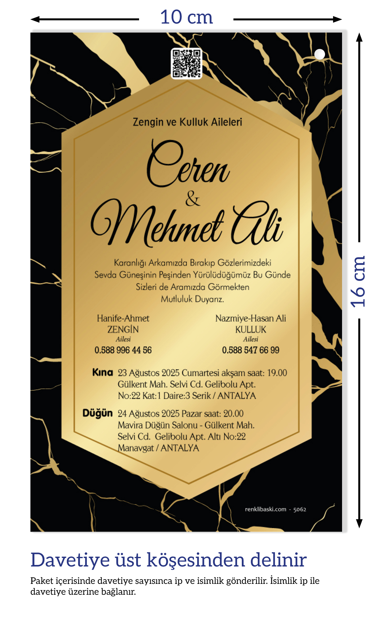 Davetiyemiz 10x16 cm ölçülerinde, dikey tasarıma sahiptir ve üst köşesinden delinerek isimlik ip ile bağlanmaktadır.