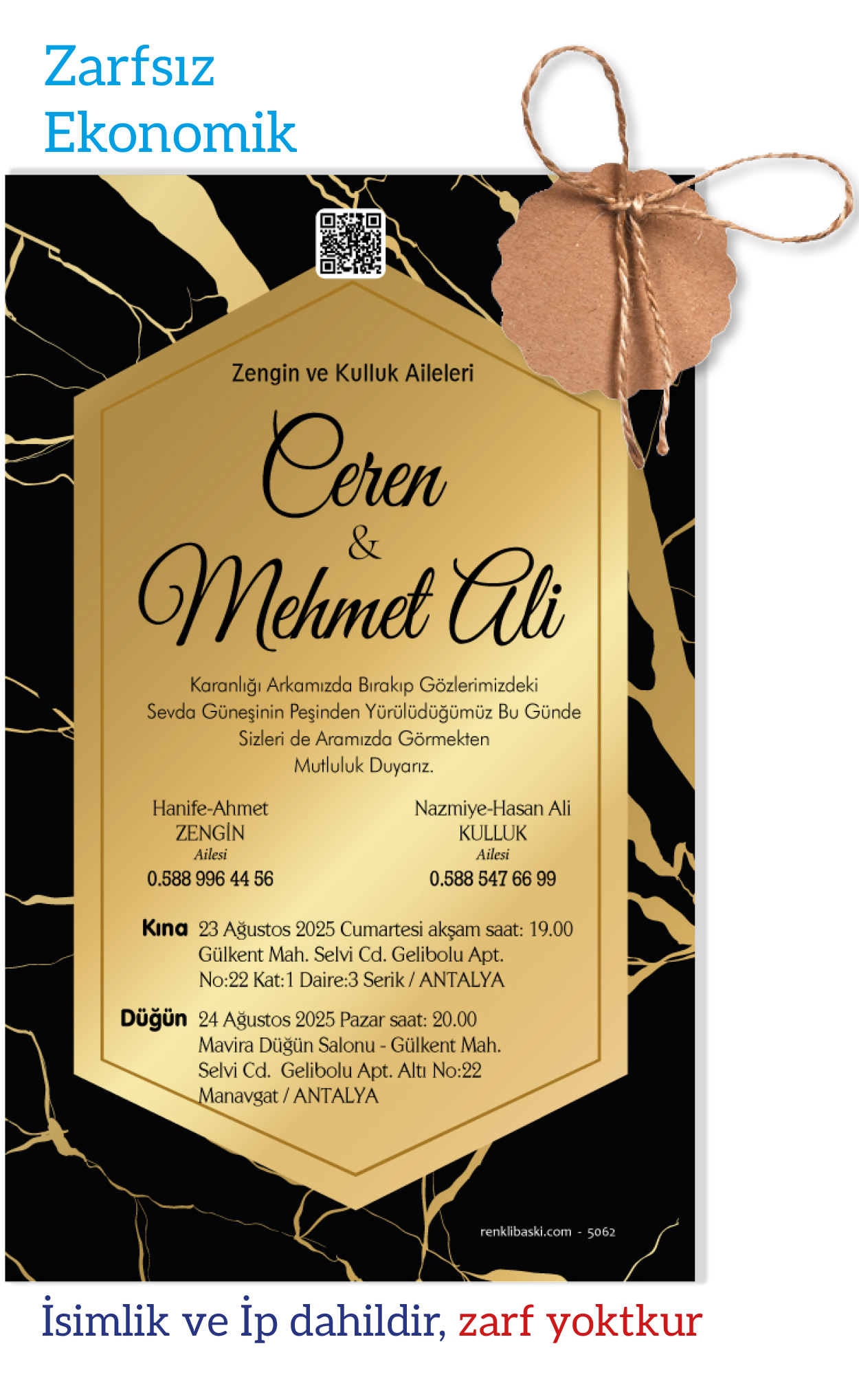 Ekonomik davetiye modelimizin düğün, nişan, kına gibi etkinlikleriniz için tasarlanmasını isteyebilirsiniz. Tasarım ücretsizdir. Tasarım hazırlatmak için 0555 190 02 00 numaralı WhatsApp hattımızla iletişime geçebilirsiniz.