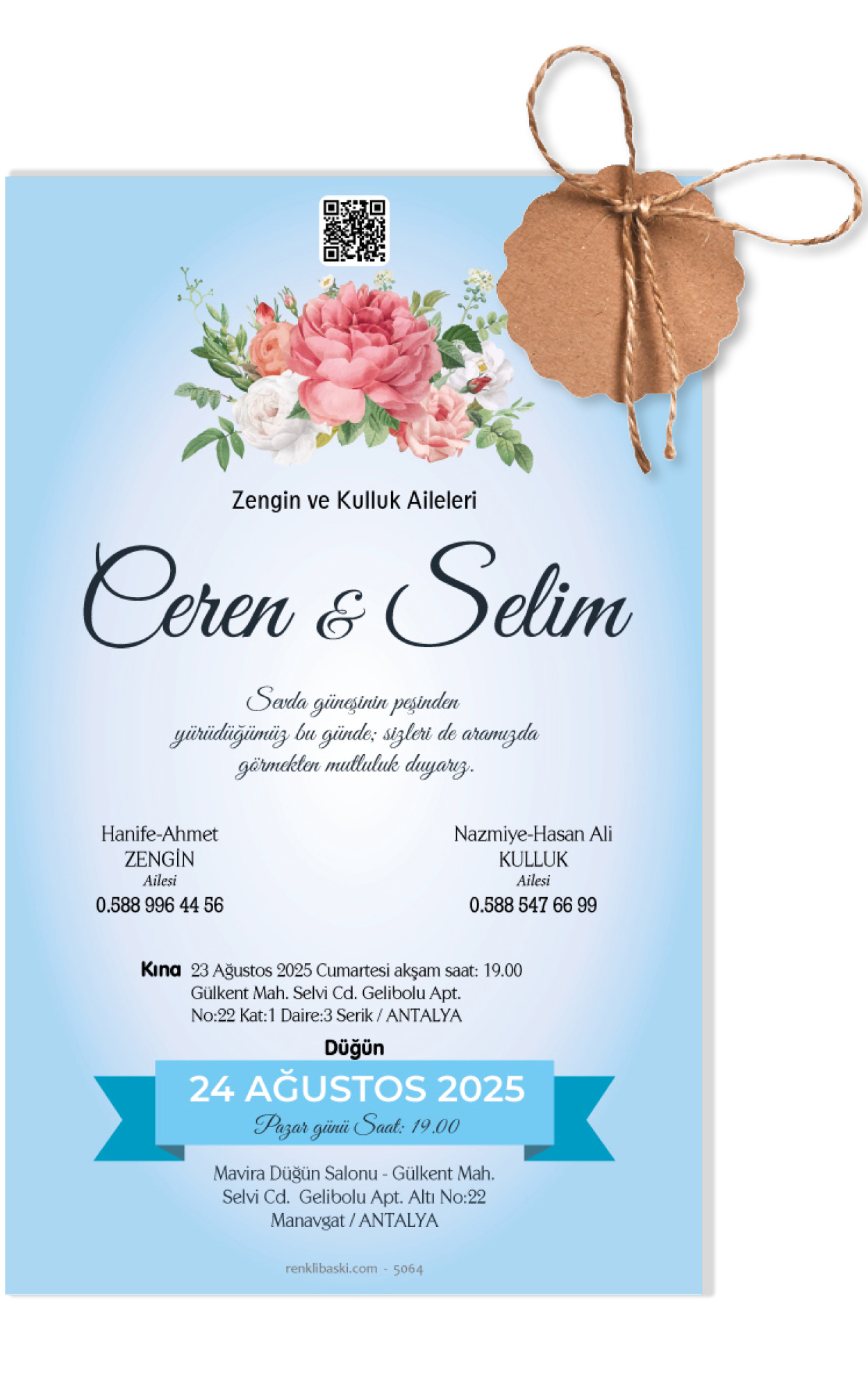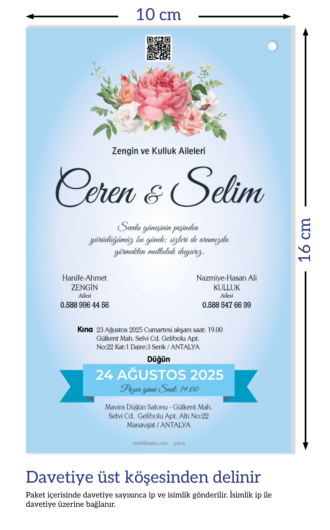 Davetiyemiz 10x16 cm ölçülerinde, dikey tasarıma sahiptir ve üst köşesinden delinerek isimlik ip ile bağlanmaktadır.