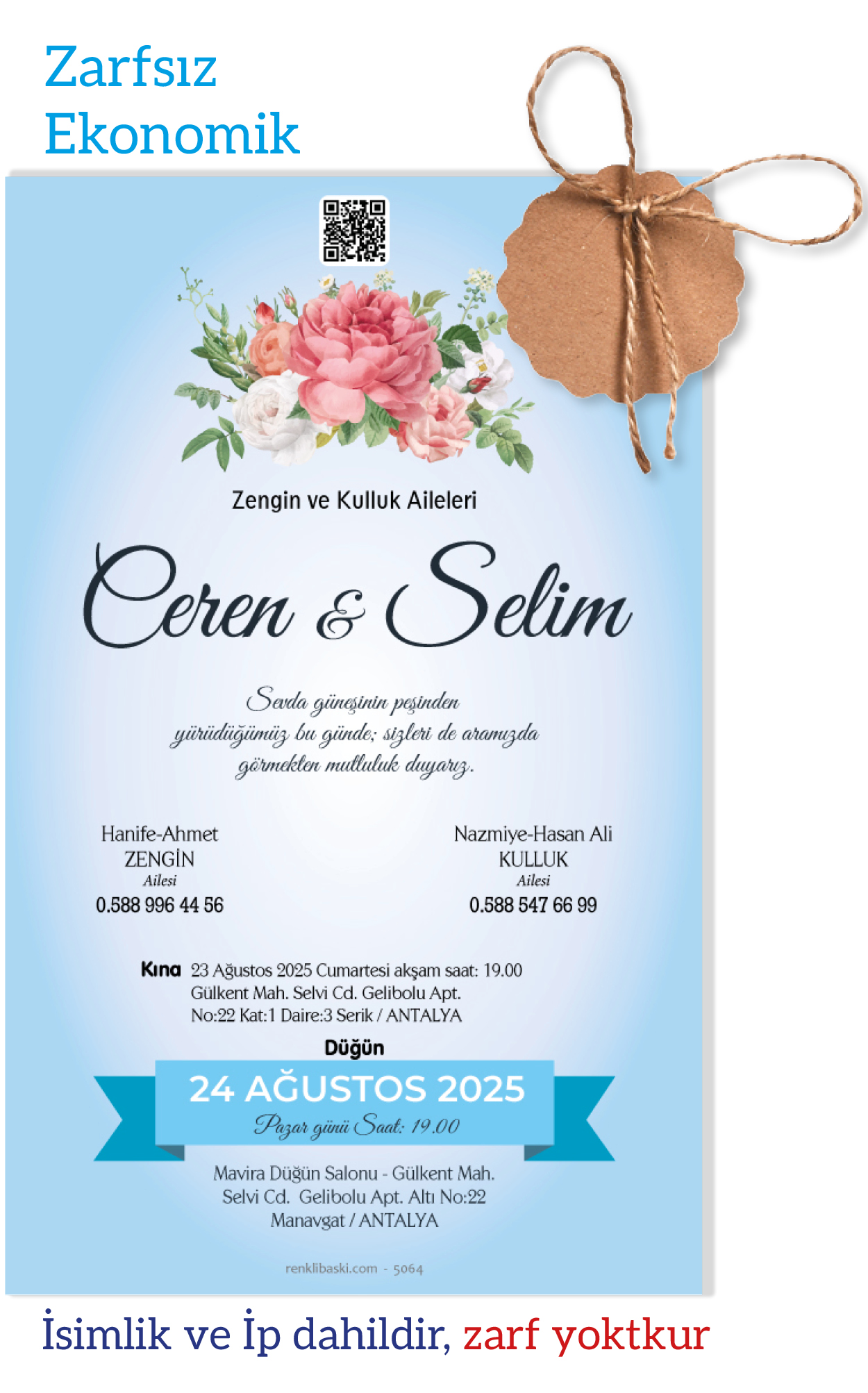 Tasarımda bulunan tüm yazı alanlarının değiştirilmesini talep edebilirsiniz. Hazırlanan davetiye tasarımının onayı alınmadan baskısı yapılmaz. Kargo içerisinde seçtiğiniz adet kadar davetiye kartı, isimlik ve ip gönderilir. İp ile isimliklerin bağlanma işlemi size aittir.