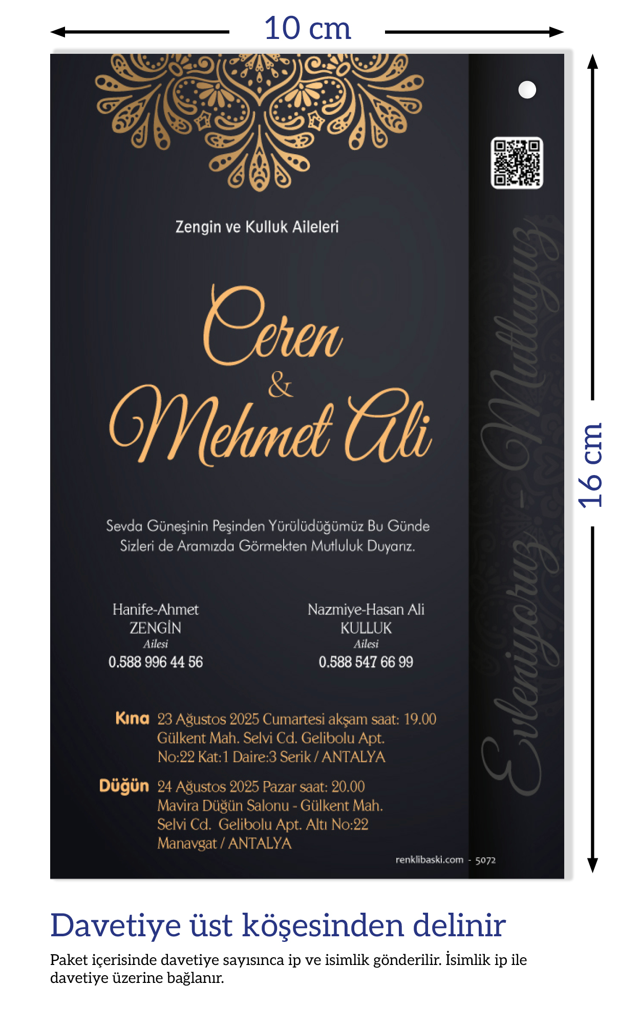 Davetiyemiz 10x16 cm ölçülerinde, dikey tasarıma sahiptir ve üst köşesinden delinerek isimlik ip ile bağlanmaktadır.