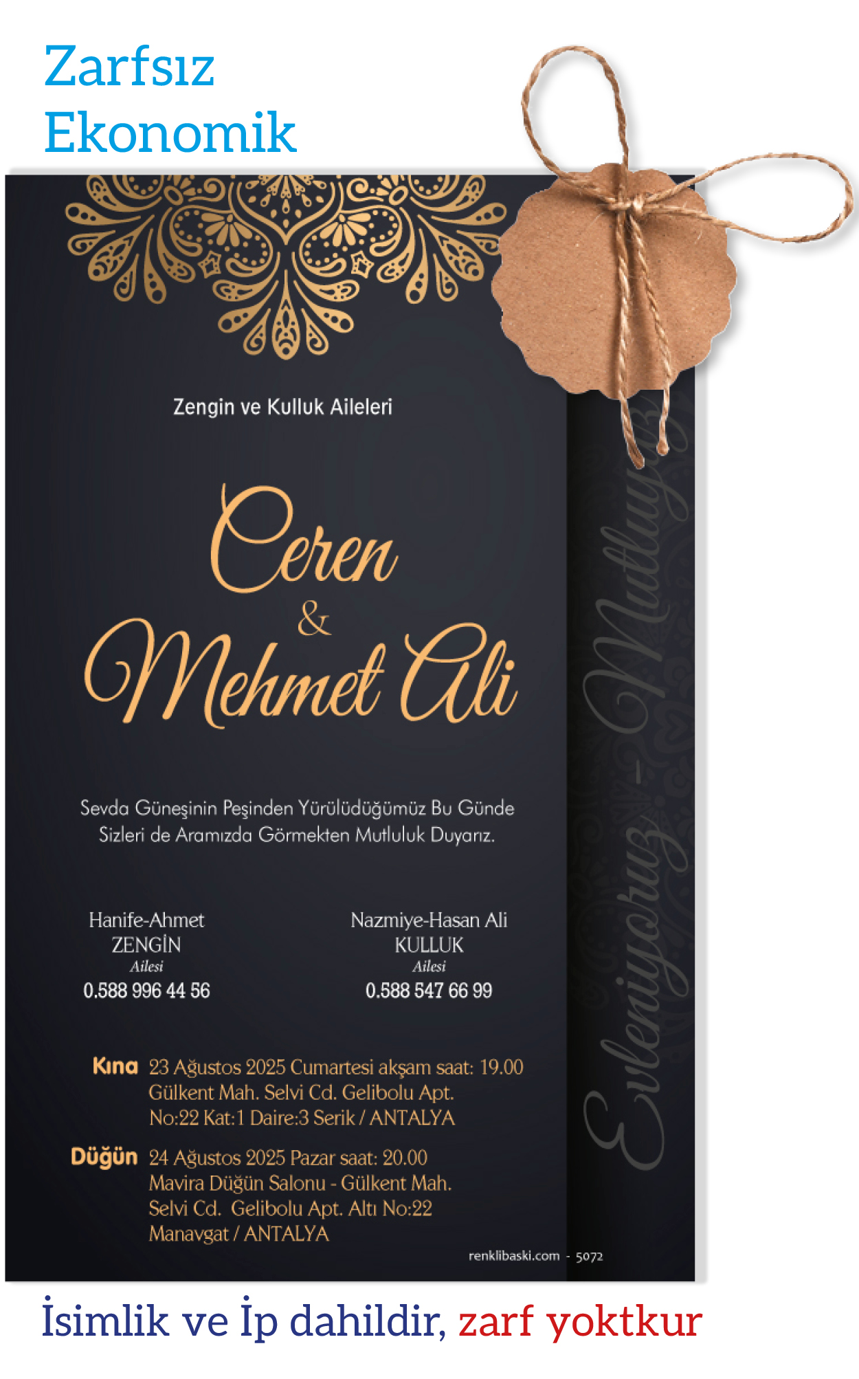 Tasarımda bulunan tüm yazı alanlarının değiştirilmesini talep edebilirsiniz. Hazırlanan davetiye tasarımının onayı alınmadan baskısı yapılmaz. Kargo içerisinde seçtiğiniz adet kadar davetiye kartı, isimlik ve ip gönderilir. İp ile isimliklerin bağlanma işlemi size aittir.