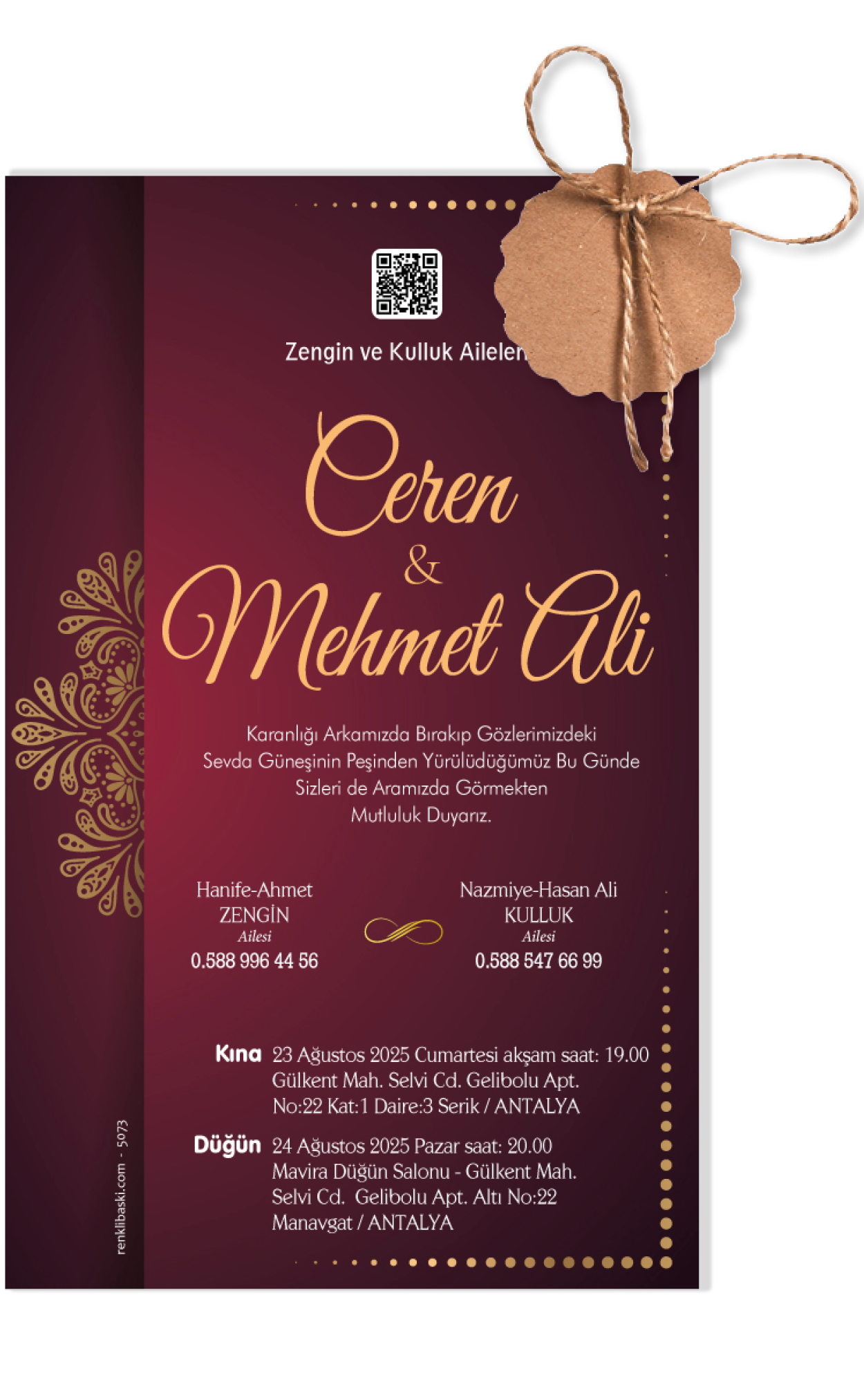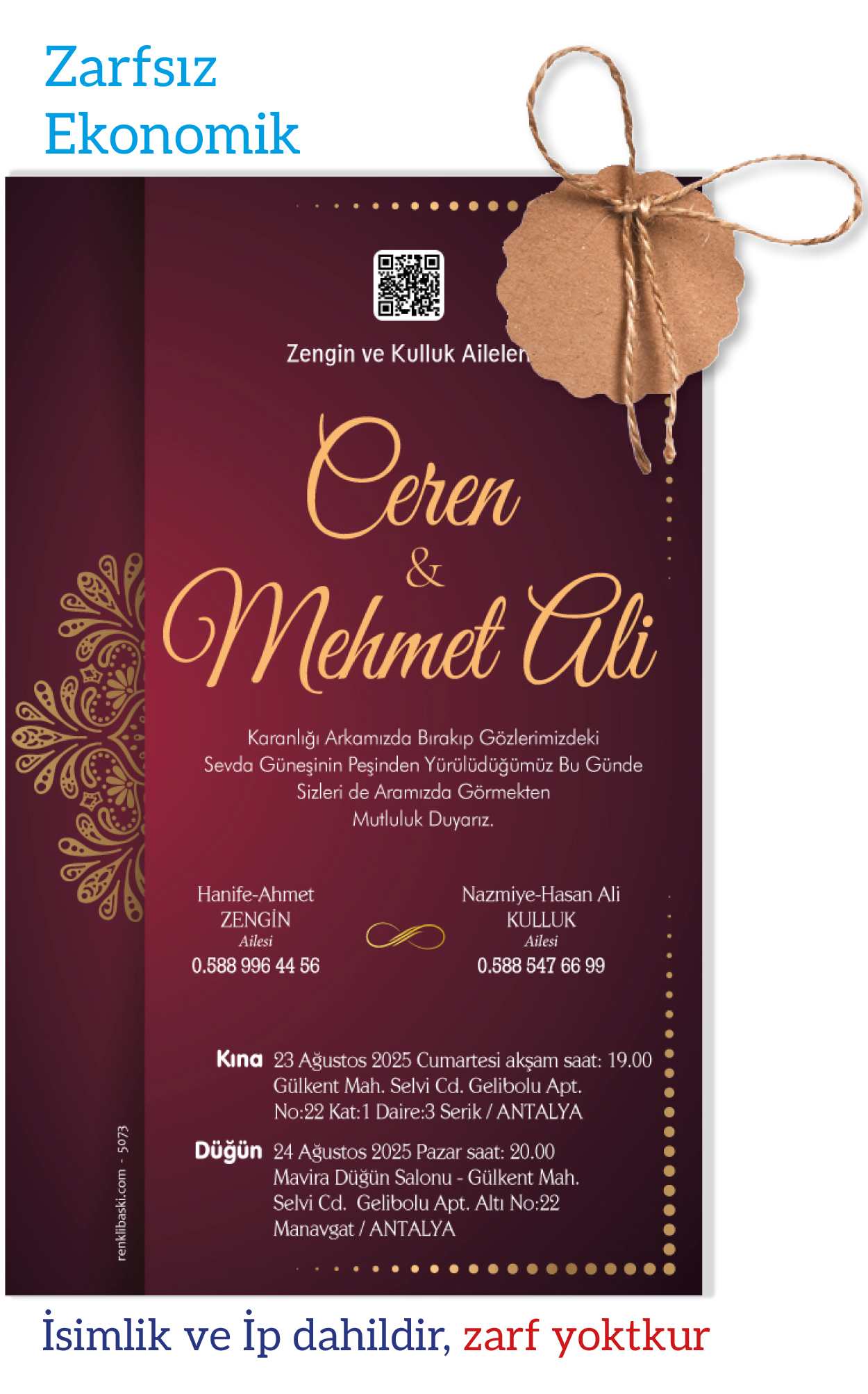Tasarımda bulunan tüm yazı alanlarının değiştirilmesini talep edebilirsiniz. Hazırlanan davetiye tasarımının onayı alınmadan baskısı yapılmaz. Kargo içerisinde seçtiğiniz adet kadar davetiye kartı, isimlik ve ip gönderilir. İp ile isimliklerin bağlanma işlemi size aittir.