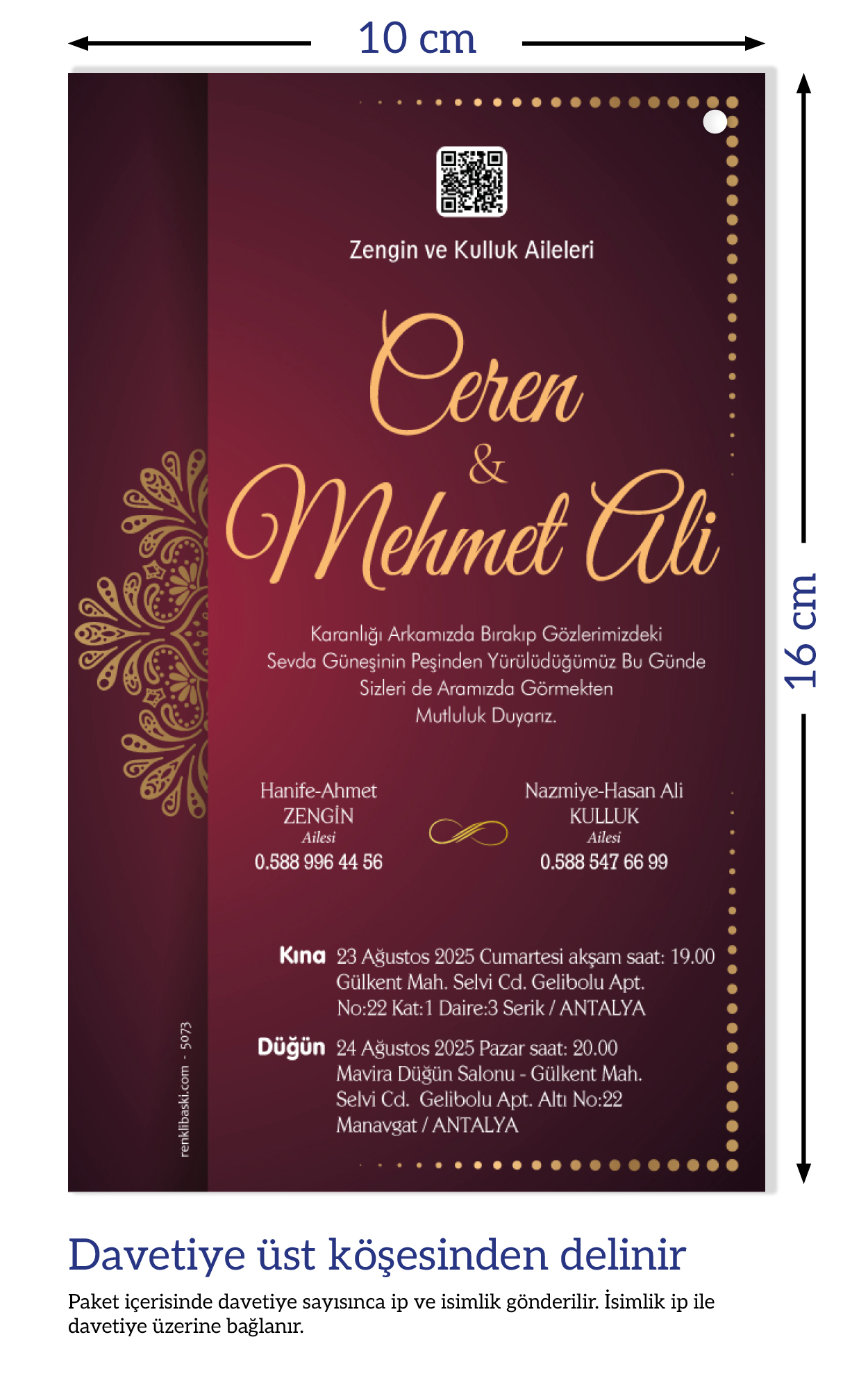 Davetiyemiz 10x16 cm ölçülerinde, dikey tasarıma sahiptir ve üst köşesinden delinerek isimlik ip ile bağlanmaktadır.