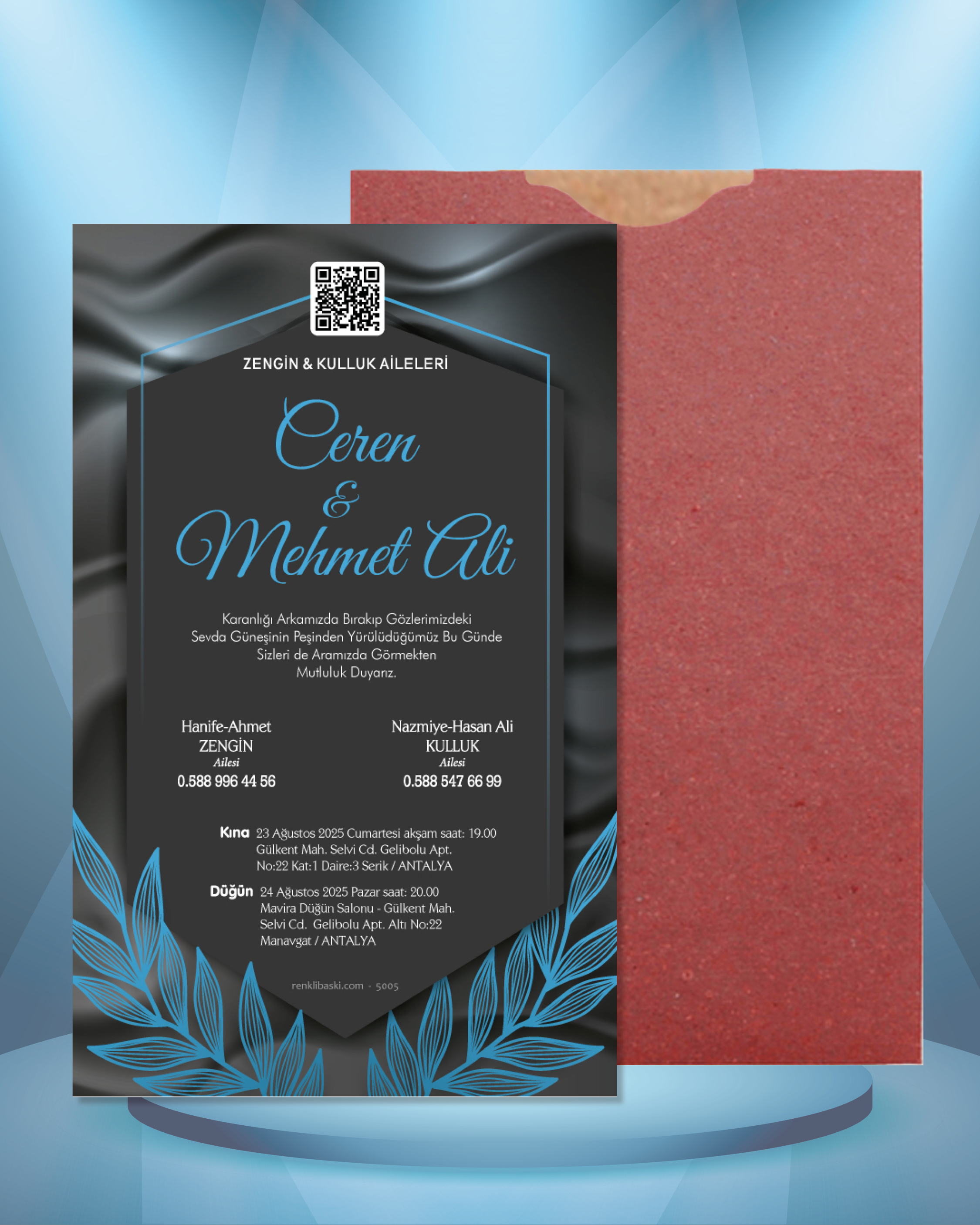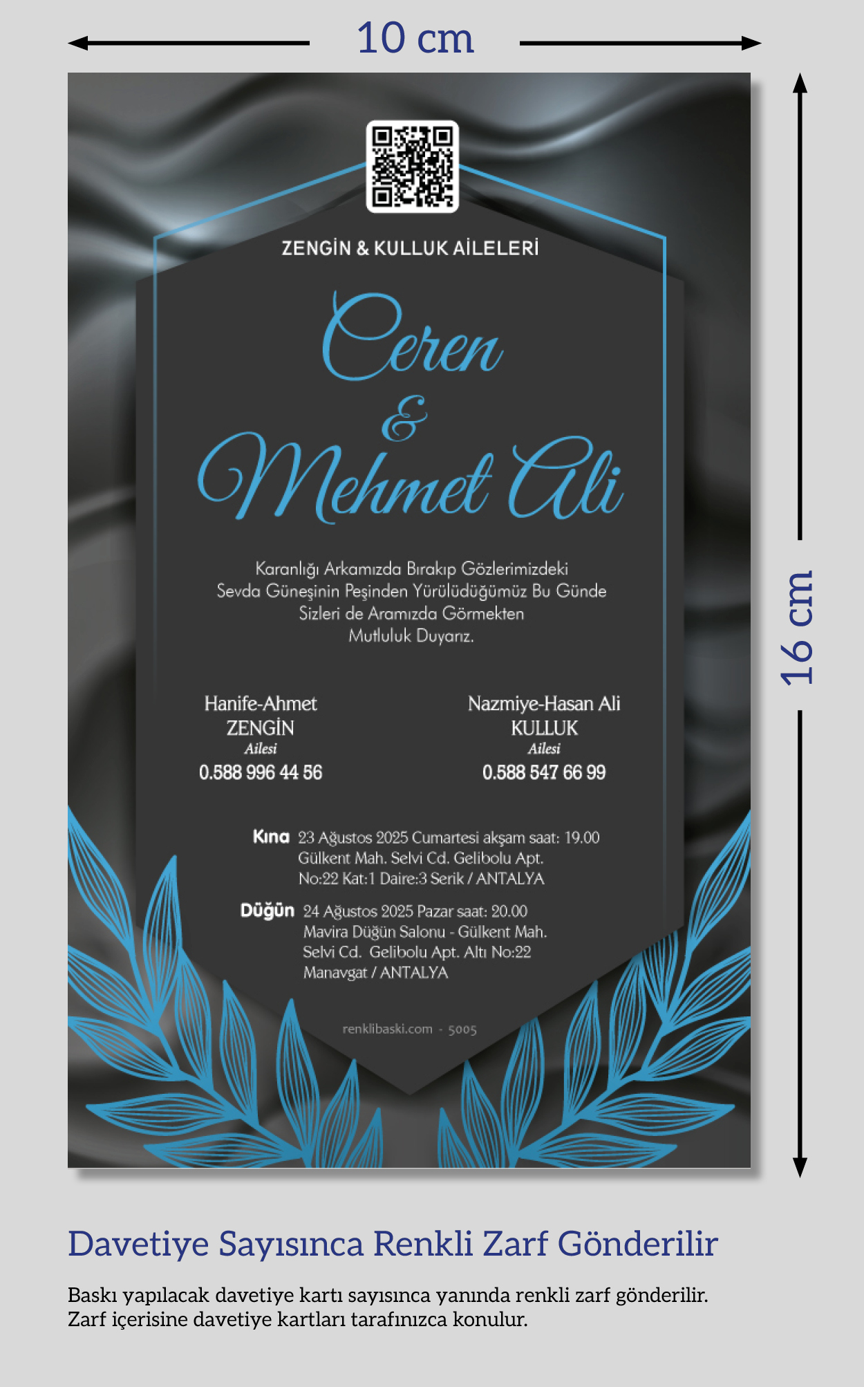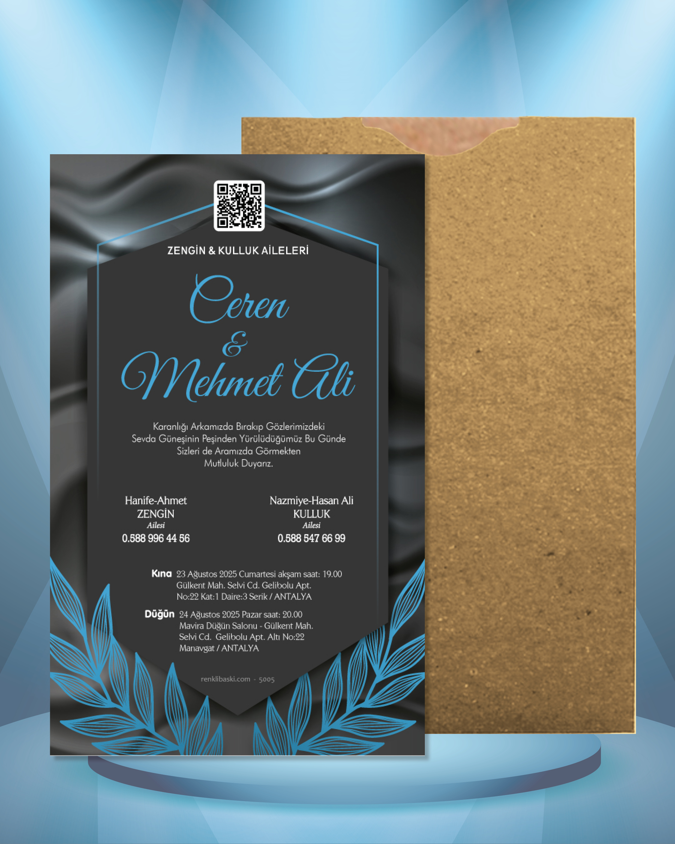 Ekonomik davetiye modelimizin düğün, nişan, kına gibi etkinlikleriniz için tasarlanmasını isteyebilirsiniz. Tasarım ücretsizdir. Tasarım hazırlatmak için 0555 190 02 00 numaralı WhatsApp hattımızla iletişime geçebilirsiniz.