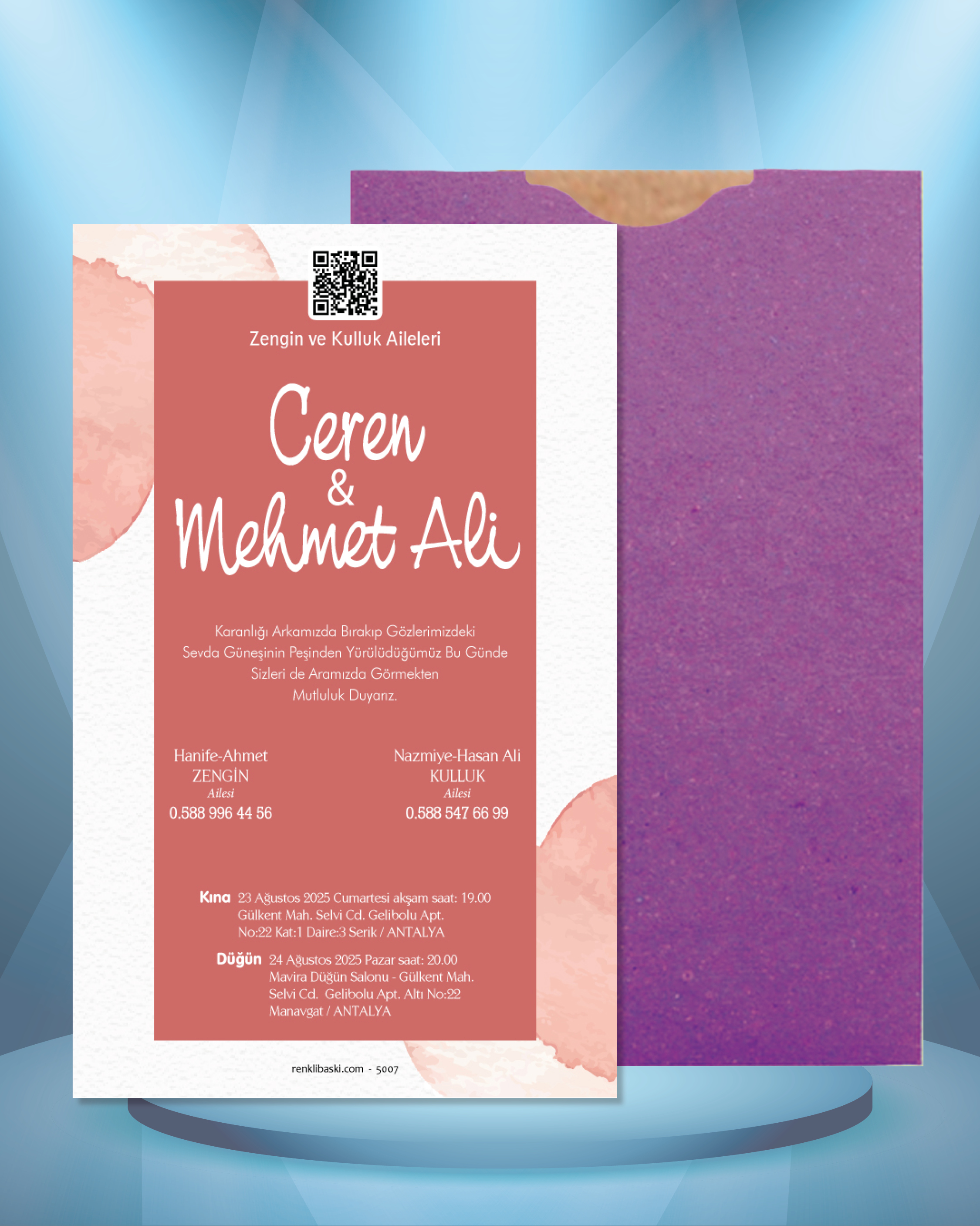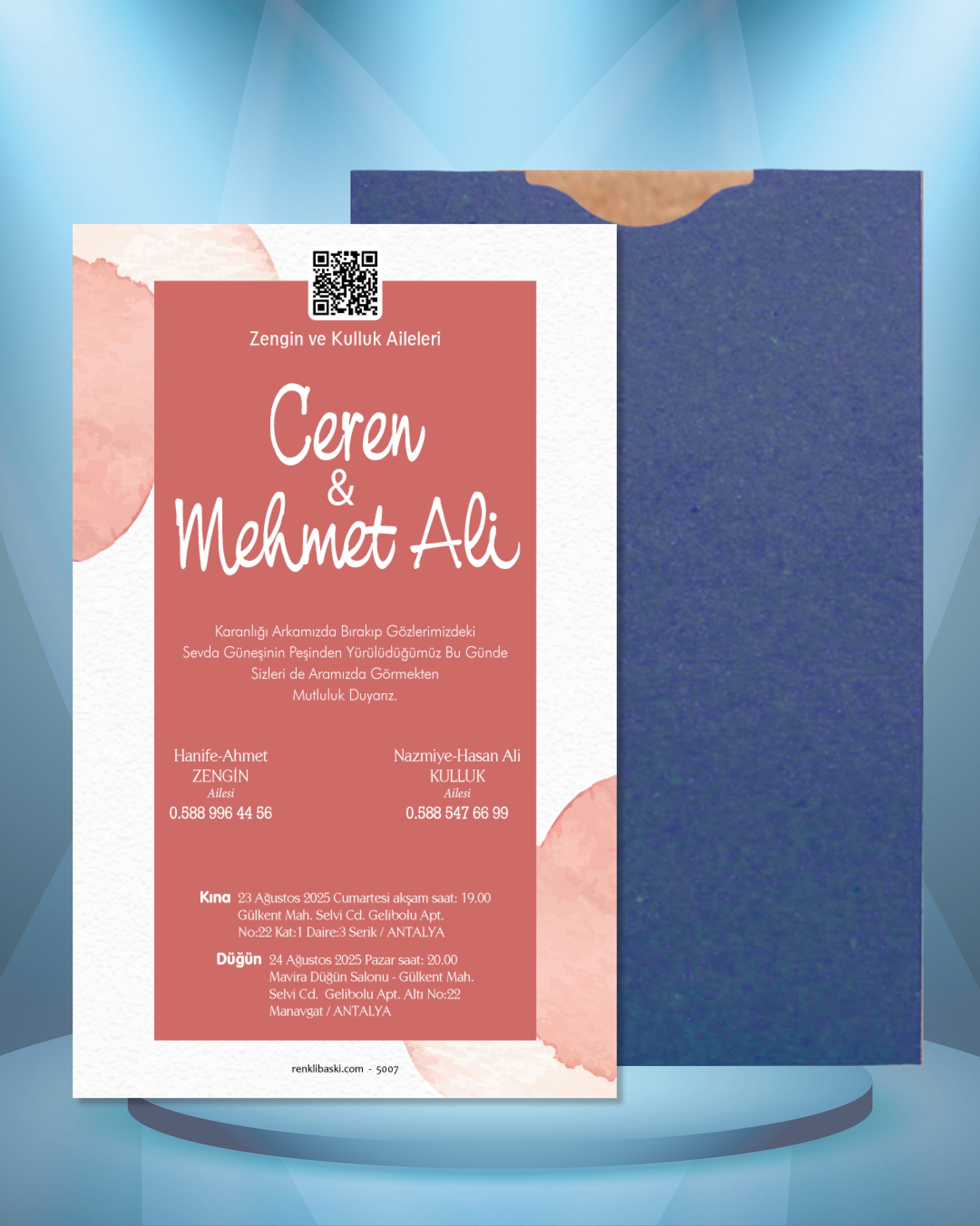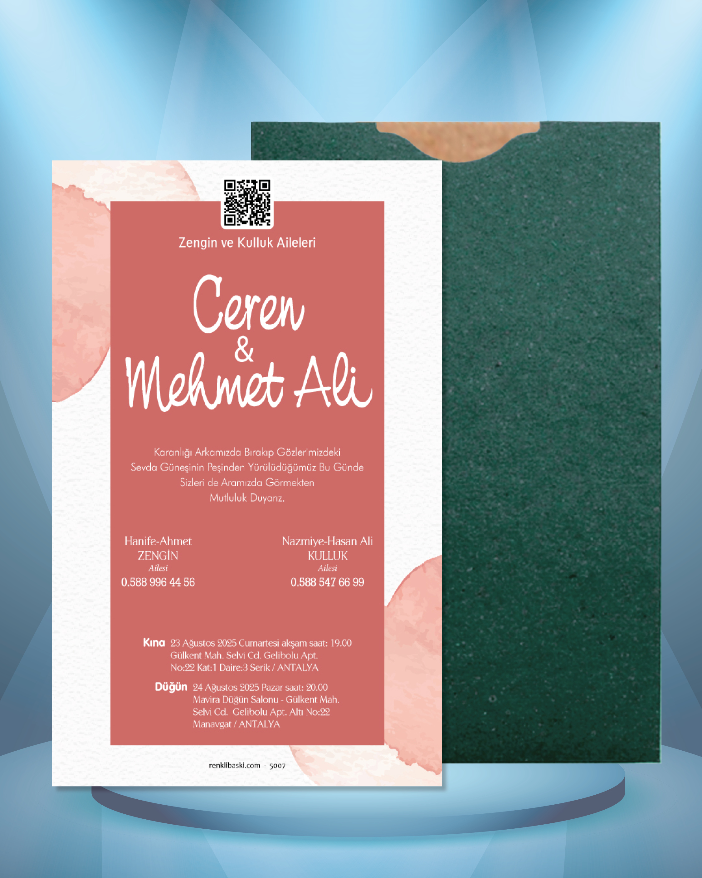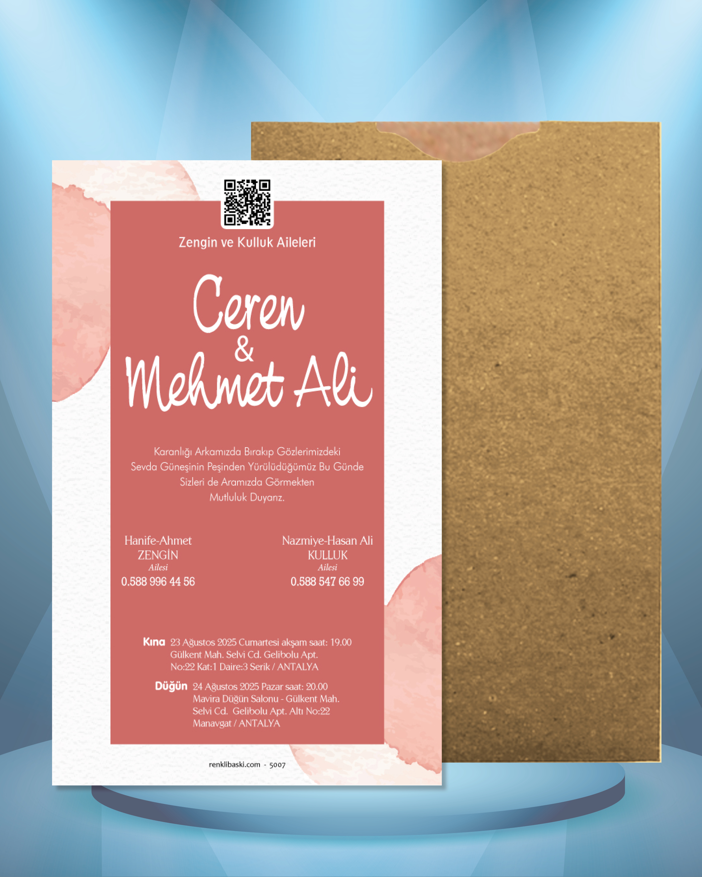 Tasarımda bulunan tüm yazı alanlarının değiştirilmesini talep edebilirsiniz. Hazırlanan davetiye tasarımının onayı alınmadan baskısı yapılmaz. Kargo içerisinde seçtiğiniz adet kadar davetiye kartı, isimlik ve ip gönderilir. İp ile isimliklerin bağlanma işlemi size aittir.