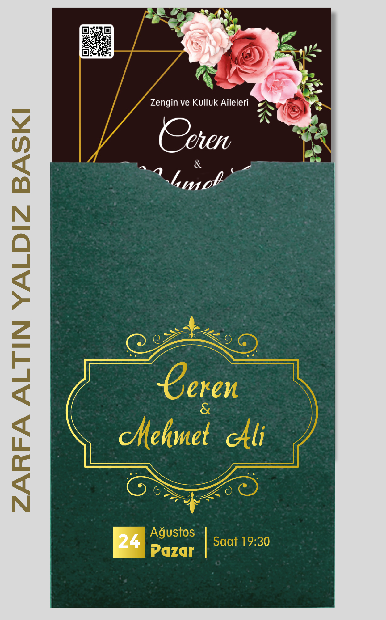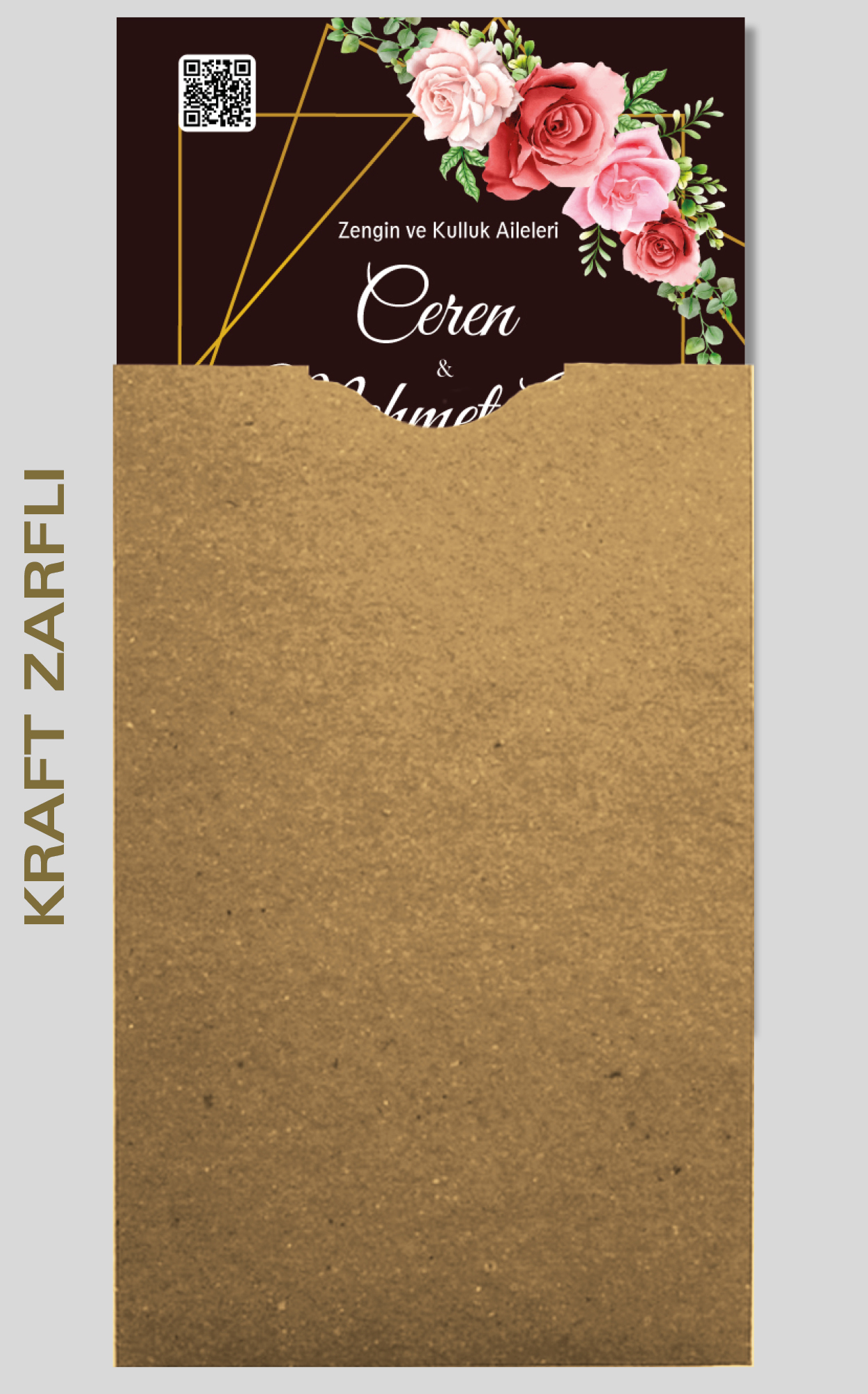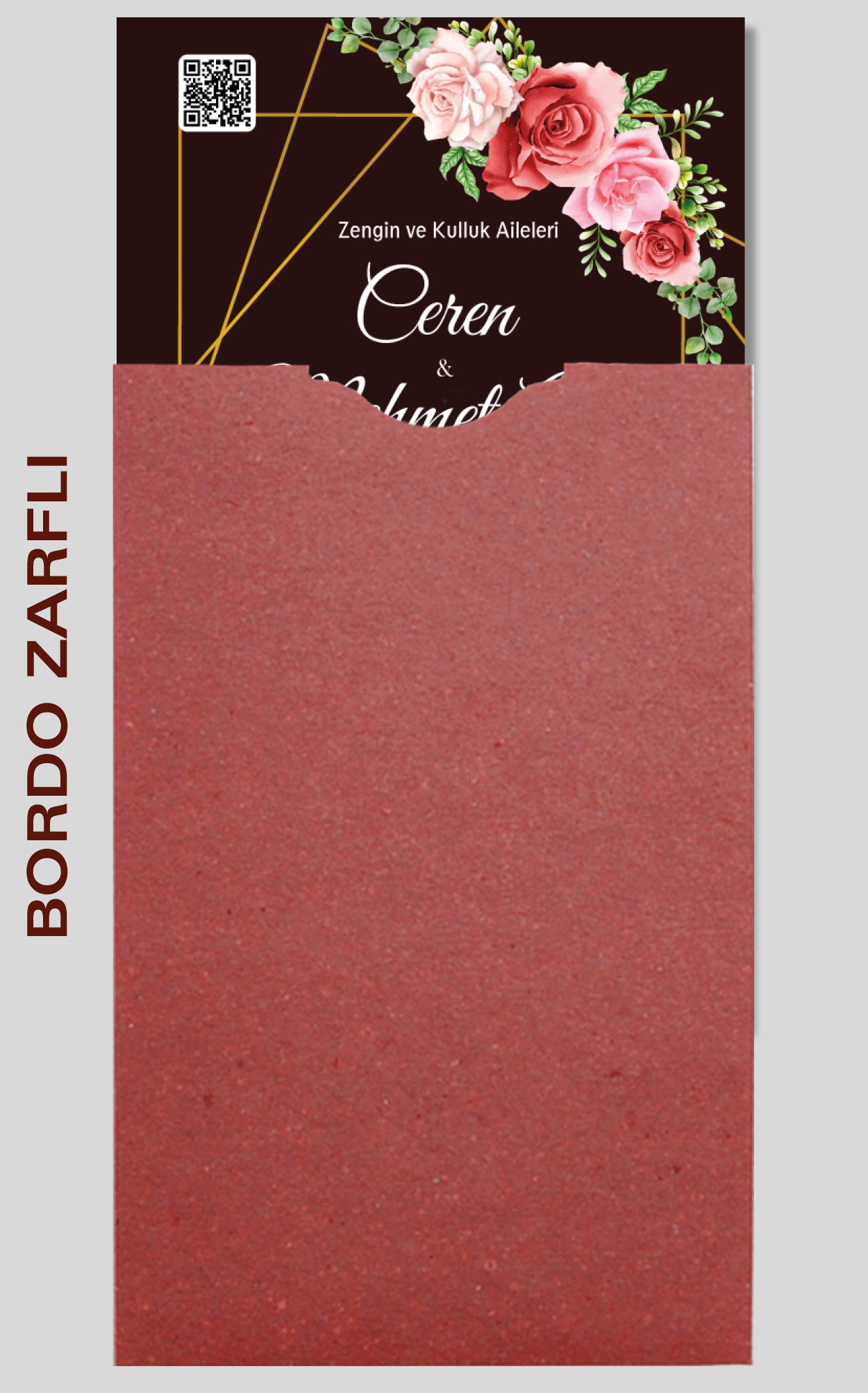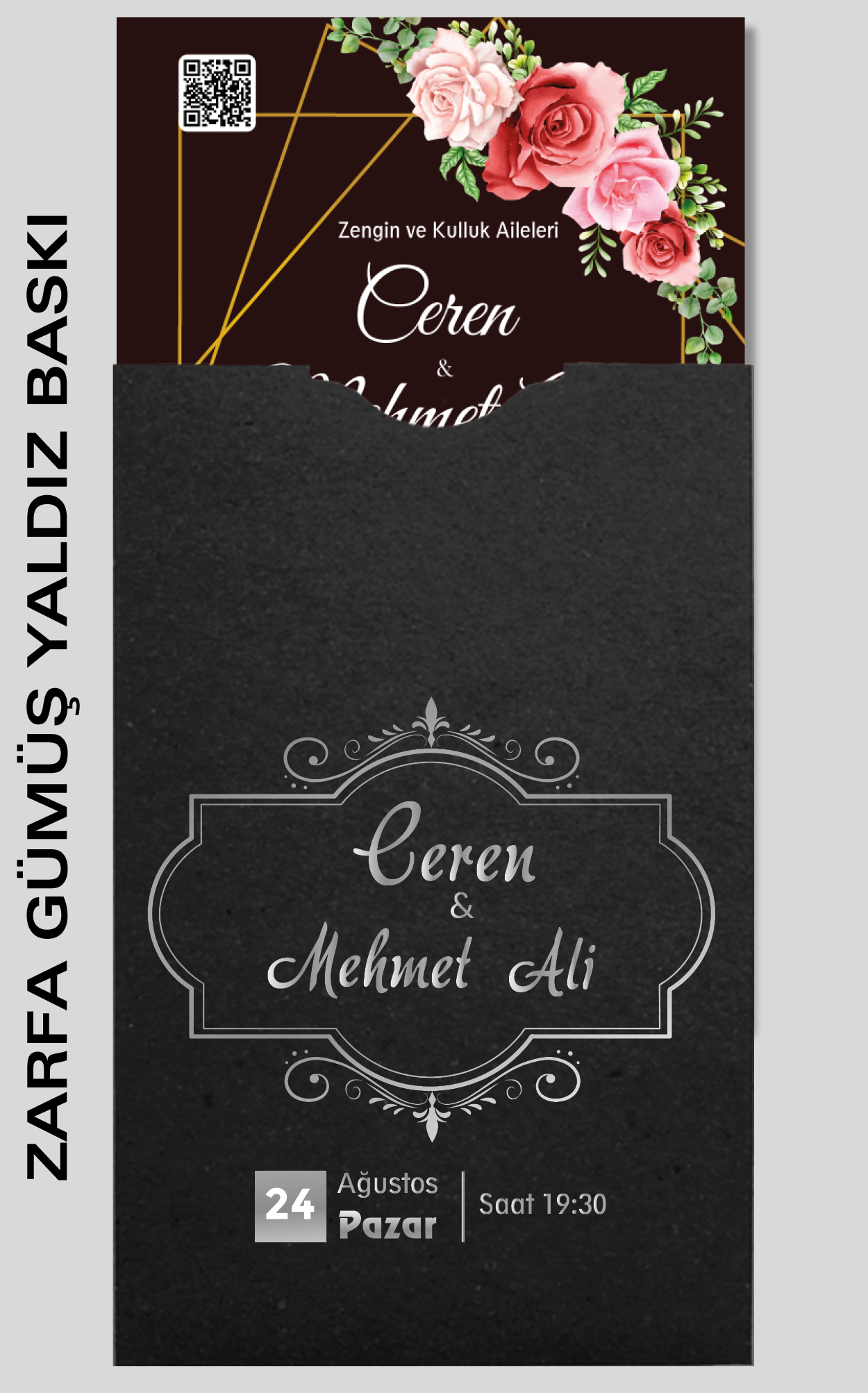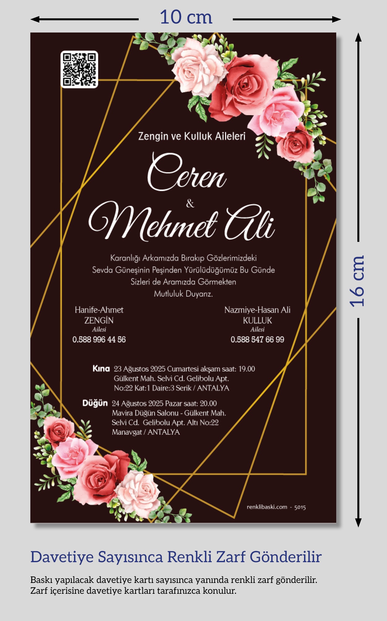 Davetiyemiz 10x16 cm ölçülerinde, dikey tasarıma sahiptir ve üst köşesinden delinerek isimlik ip ile bağlanmaktadır.