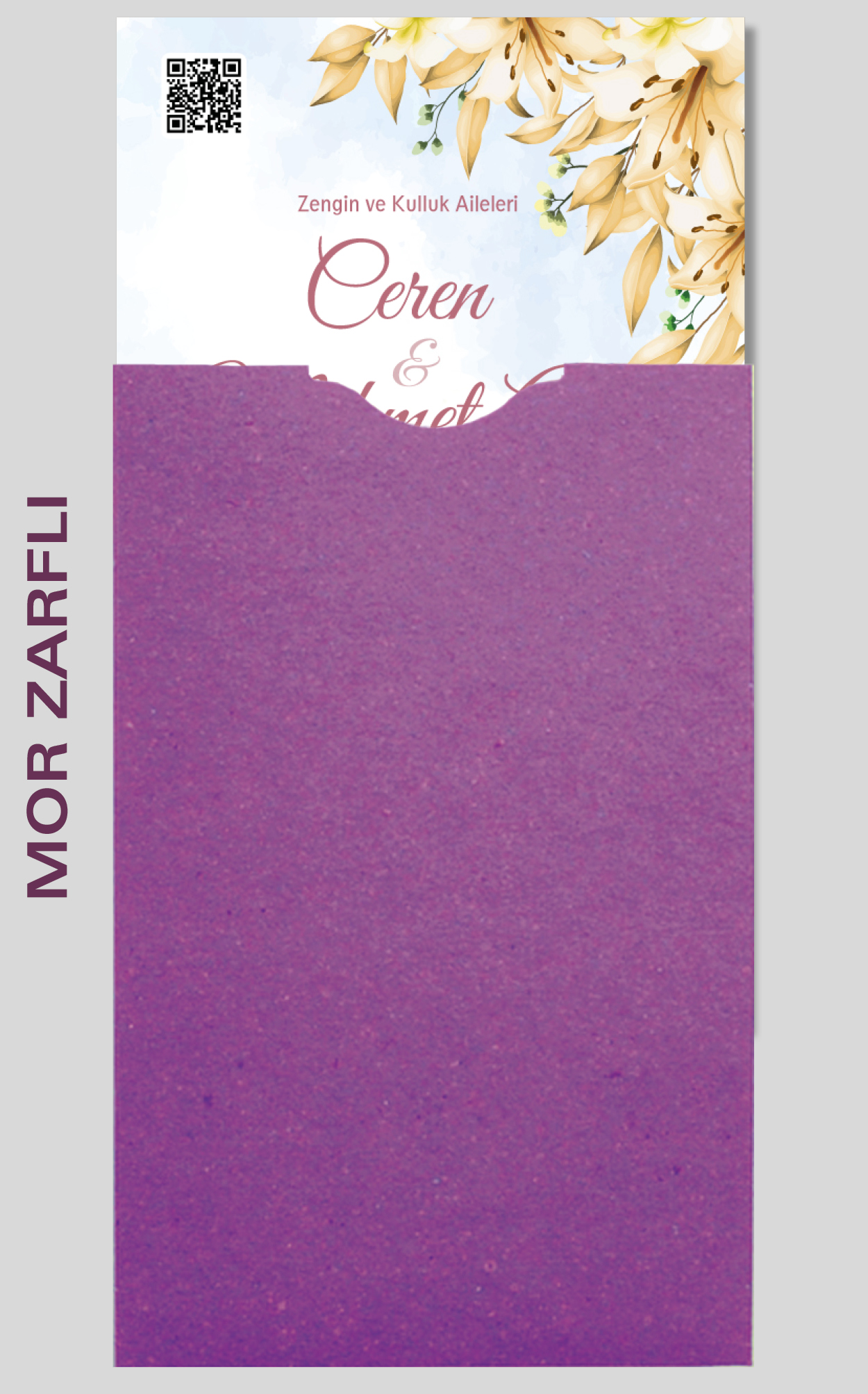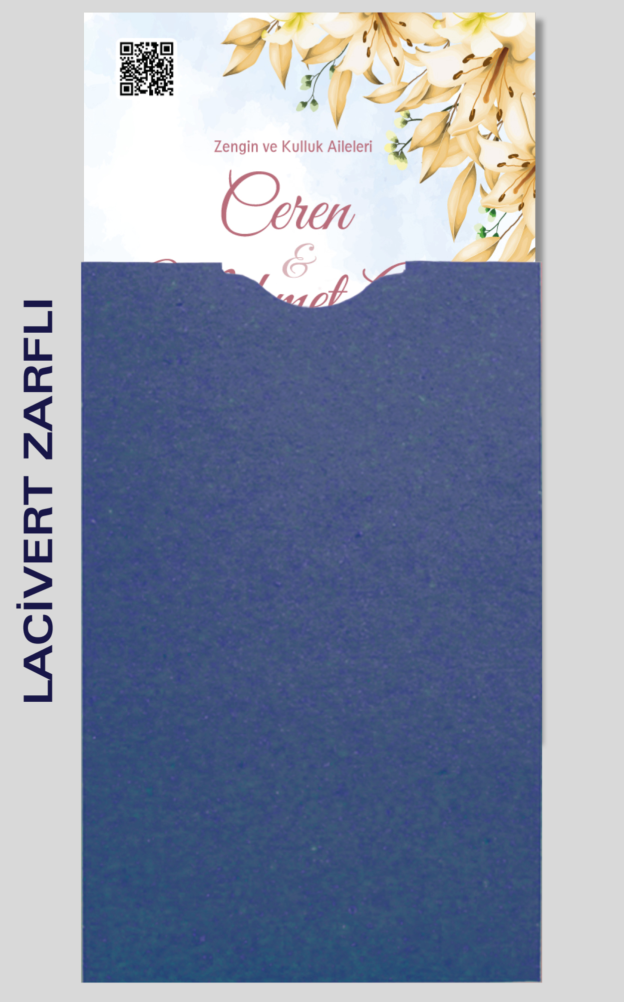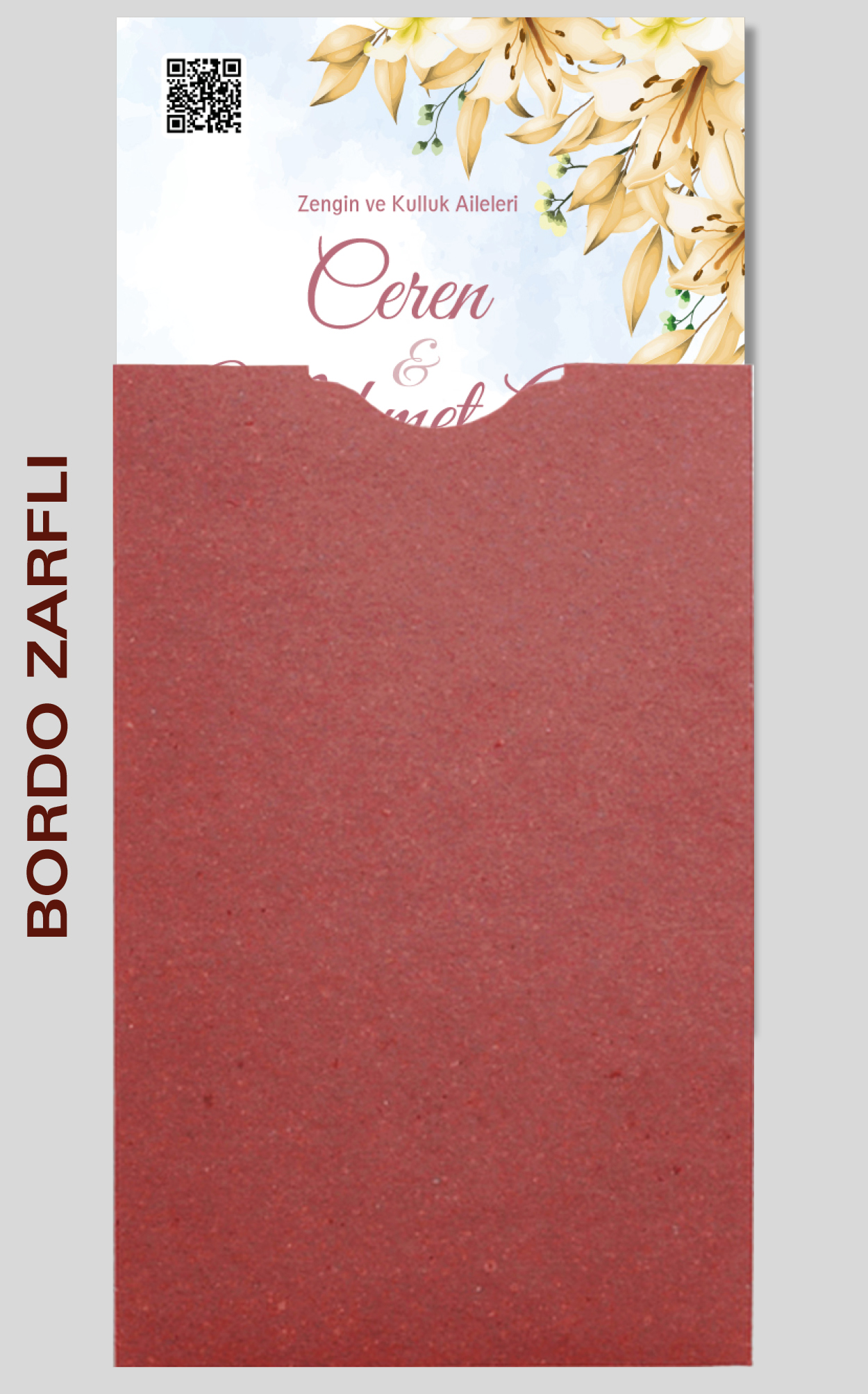 Davetiyemiz 10x16 cm ölçülerinde, dikey tasarıma sahiptir ve üst köşesinden delinerek isimlik ip ile bağlanmaktadır.