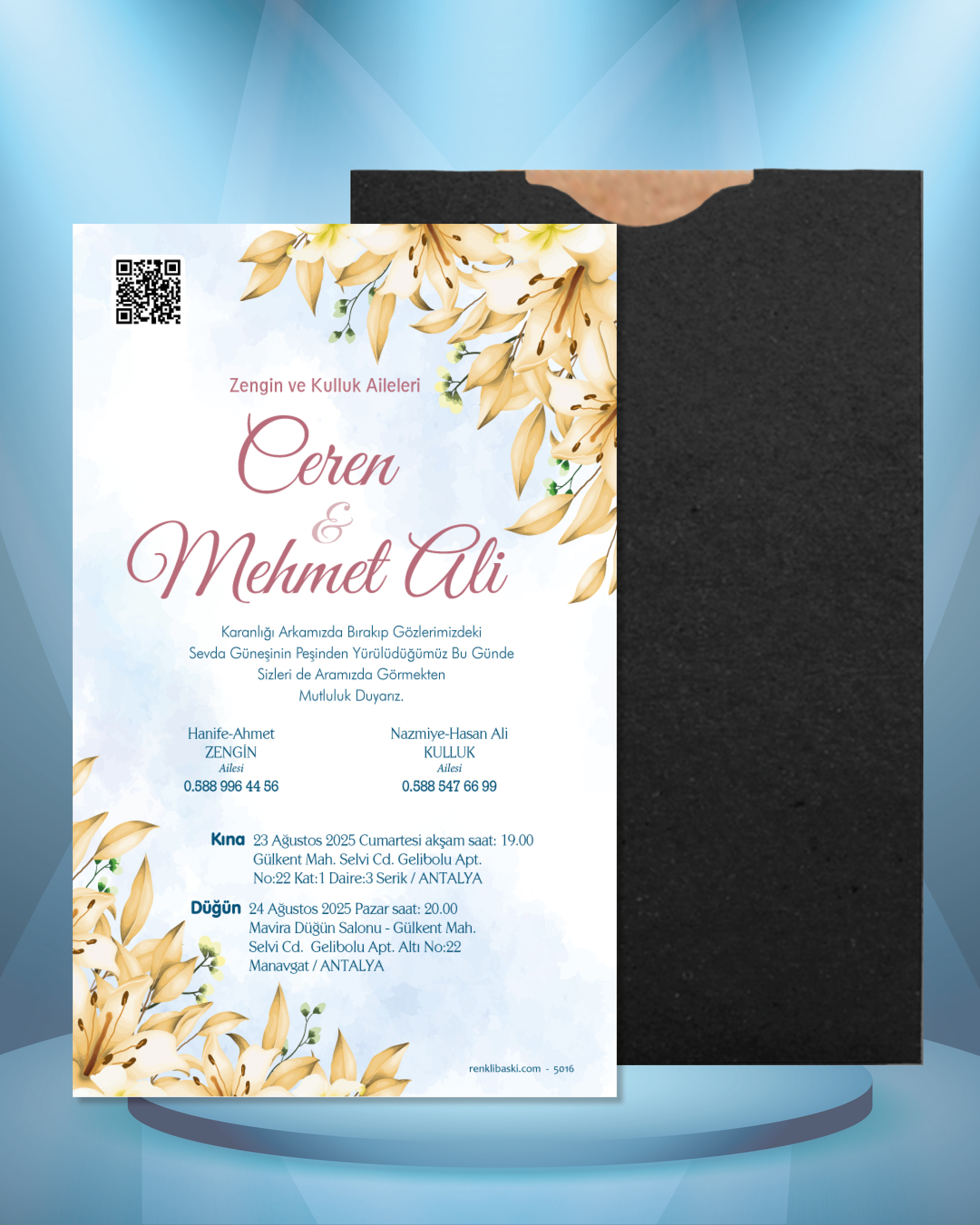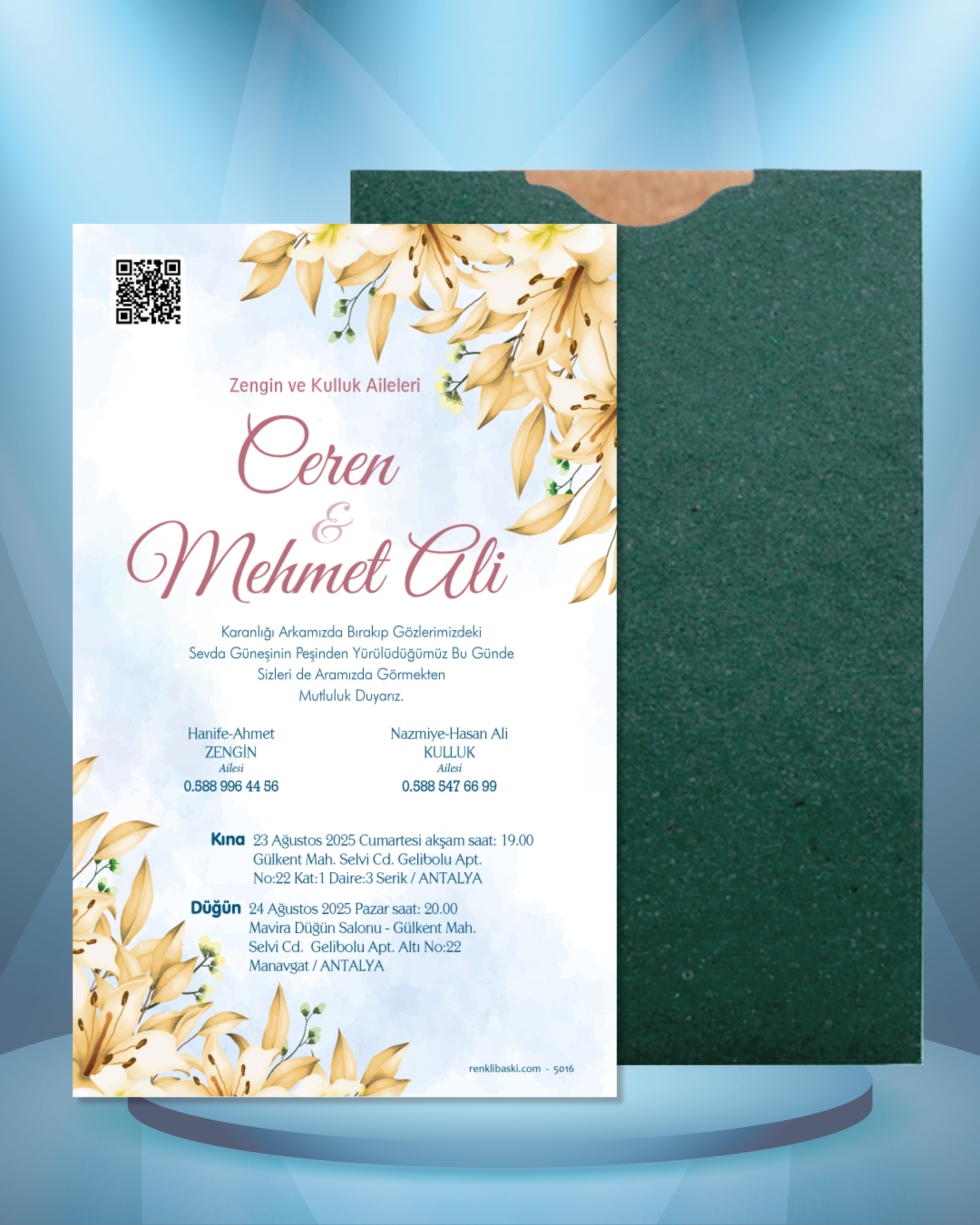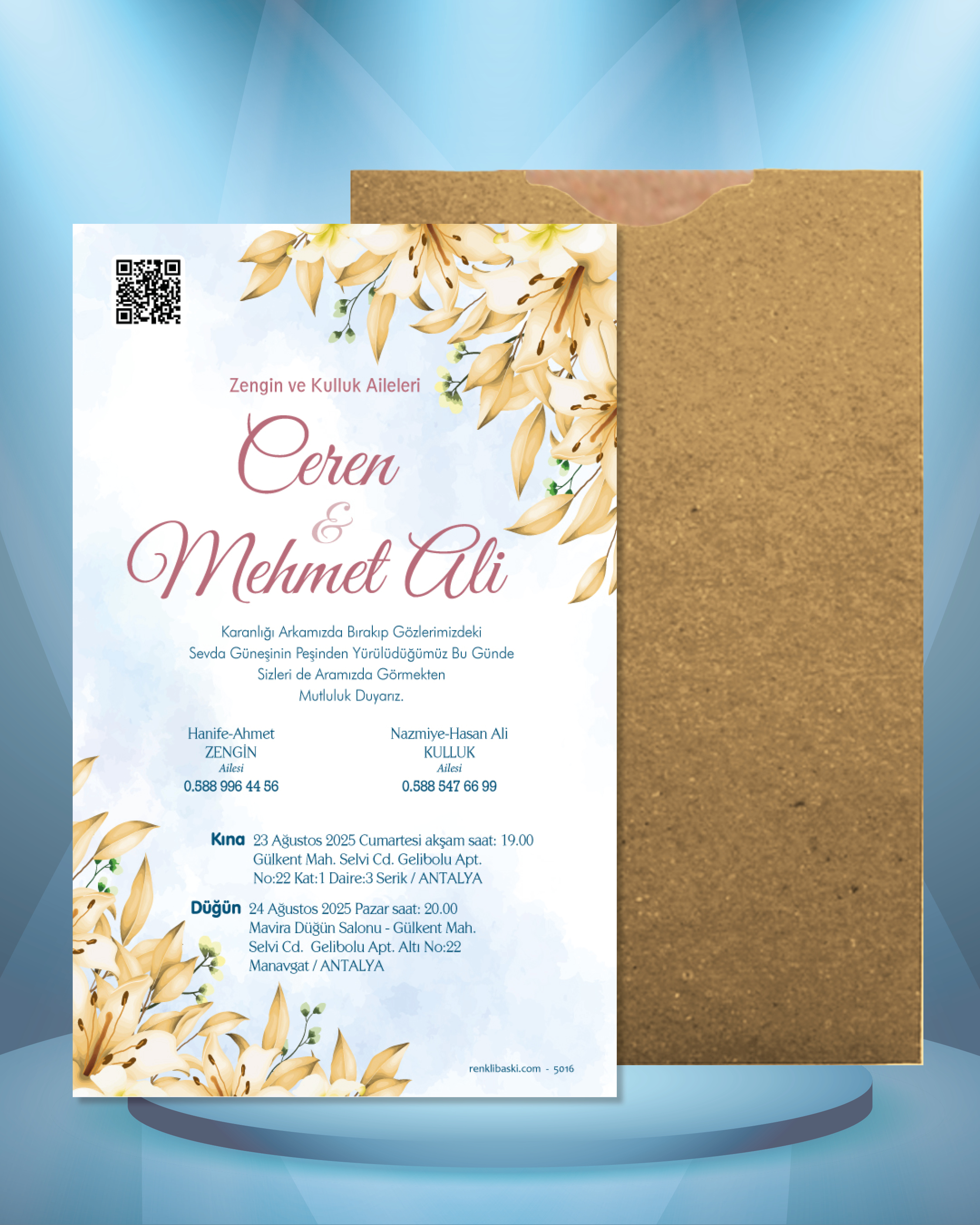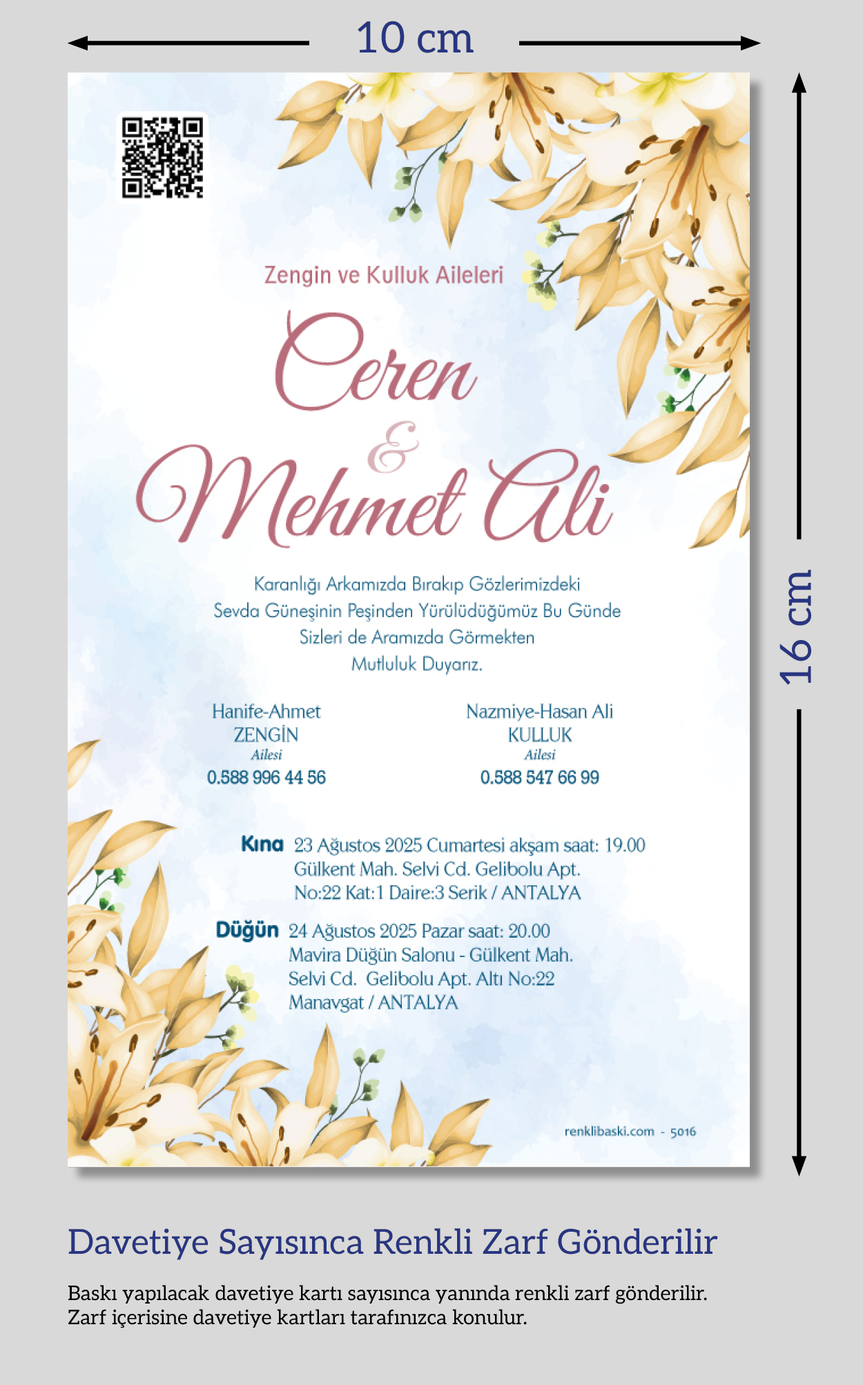 Tasarımda bulunan tüm yazı alanlarının değiştirilmesini talep edebilirsiniz. Hazırlanan davetiye tasarımının onayı alınmadan baskısı yapılmaz. Kargo içerisinde seçtiğiniz adet kadar davetiye kartı, isimlik ve ip gönderilir. İp ile isimliklerin bağlanma işlemi size aittir.
