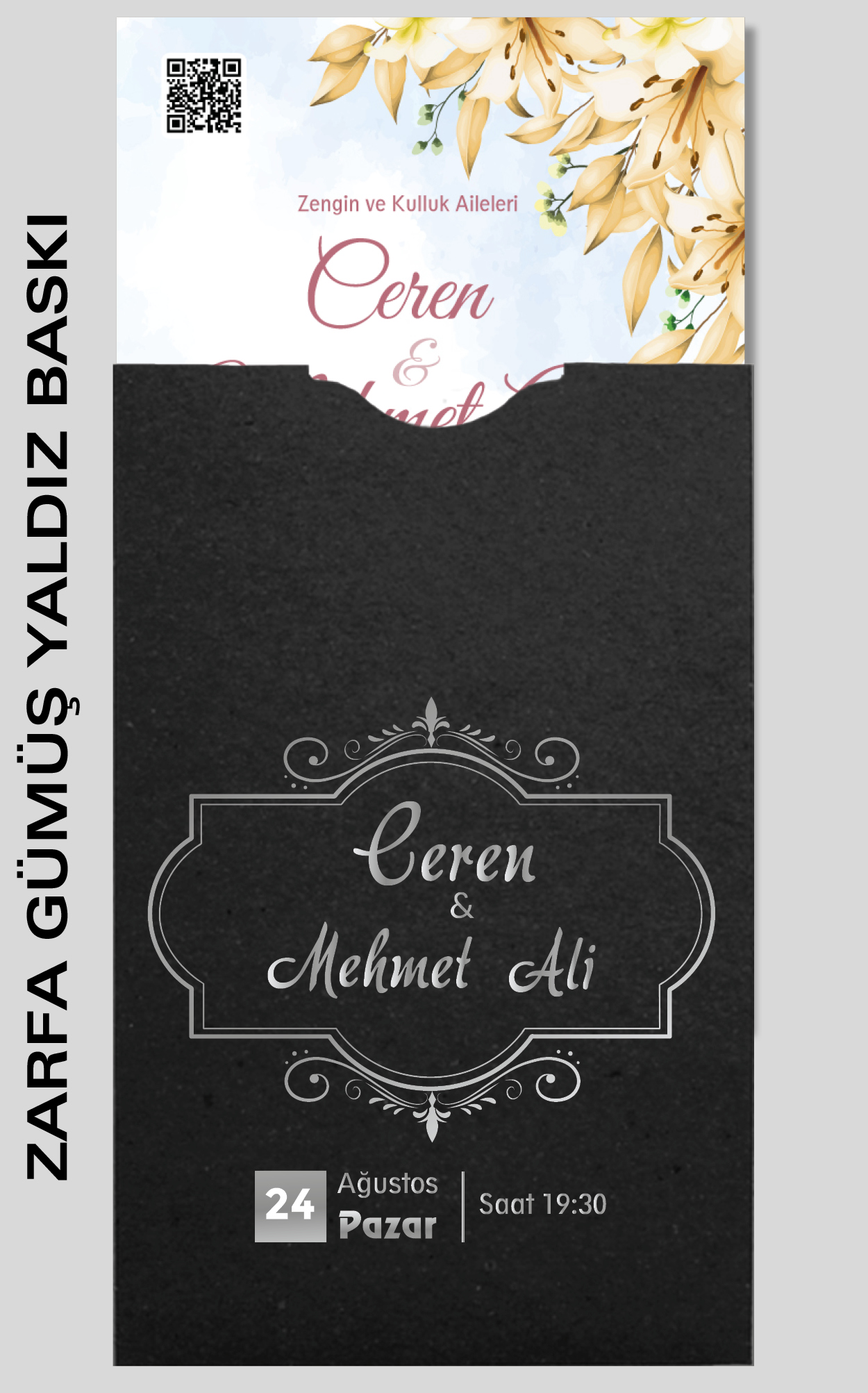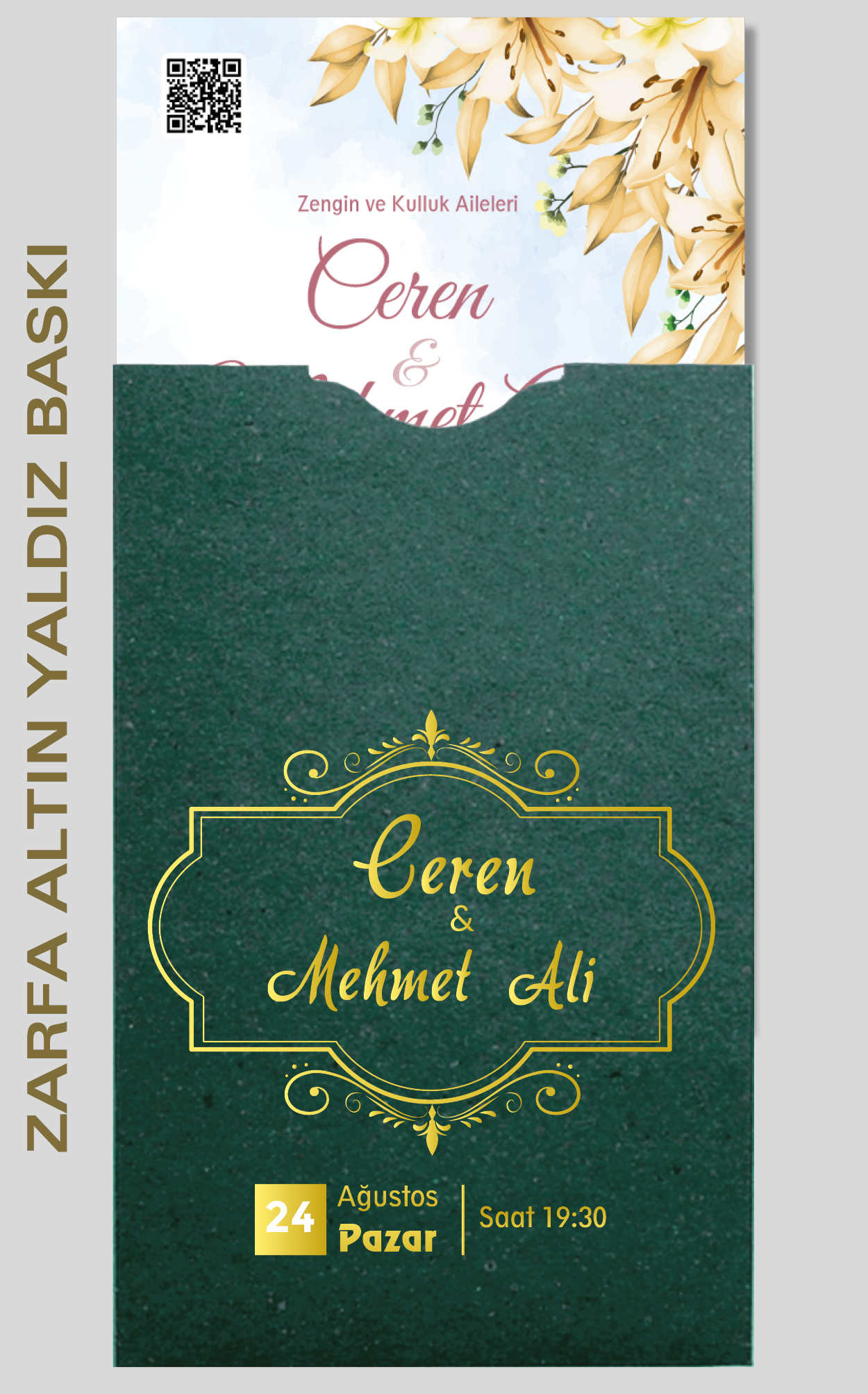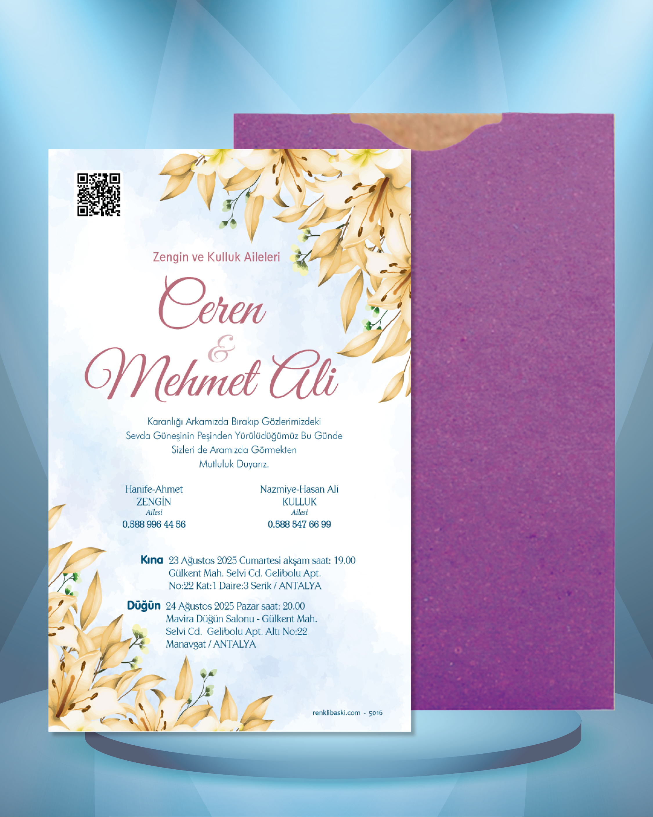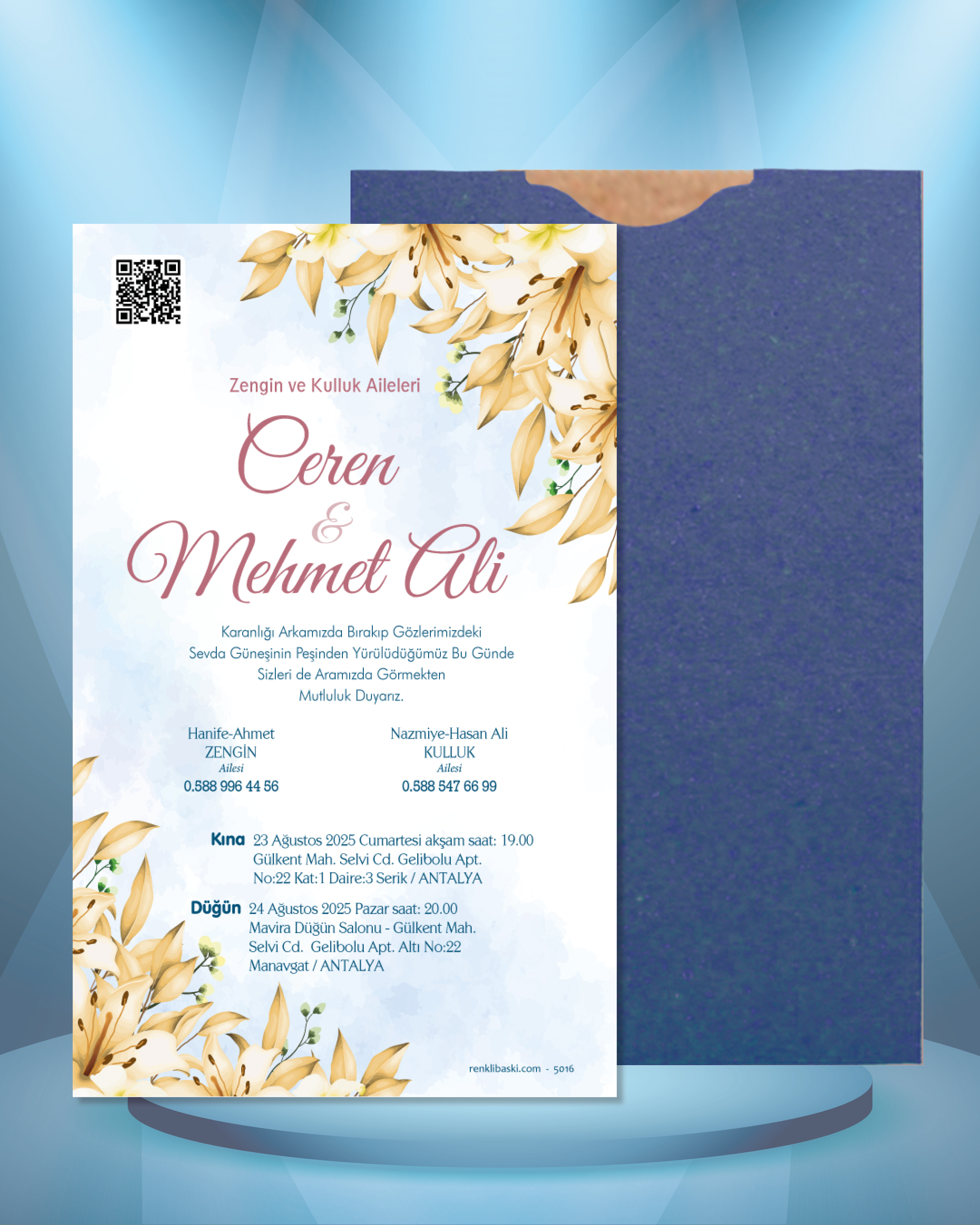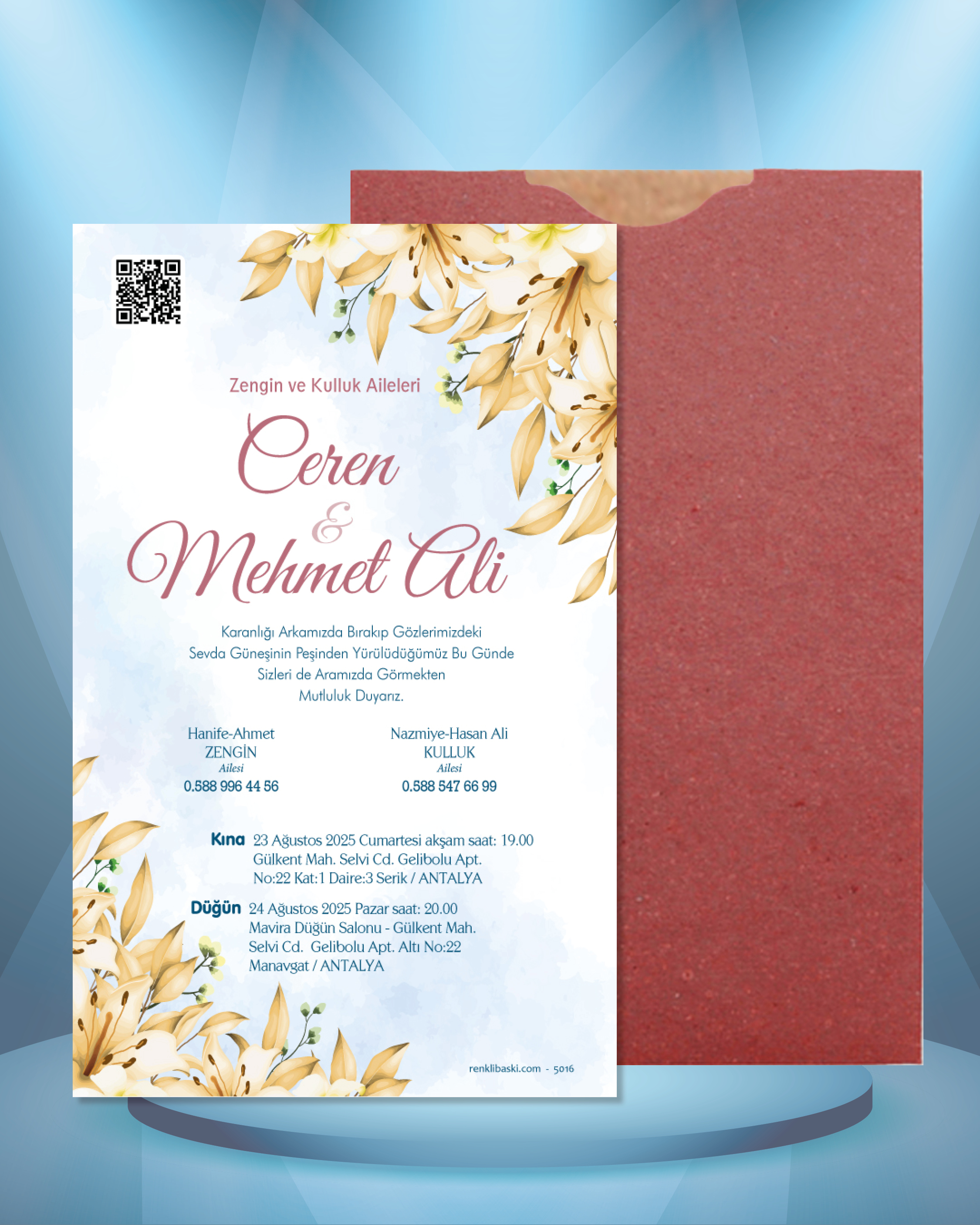 Tasarımda bulunan tüm yazı alanlarının değiştirilmesini talep edebilirsiniz. Hazırlanan davetiye tasarımının onayı alınmadan baskısı yapılmaz. Kargo içerisinde seçtiğiniz adet kadar davetiye kartı, isimlik ve ip gönderilir. İp ile isimliklerin bağlanma işlemi size aittir.