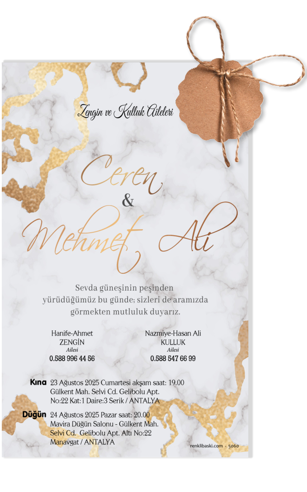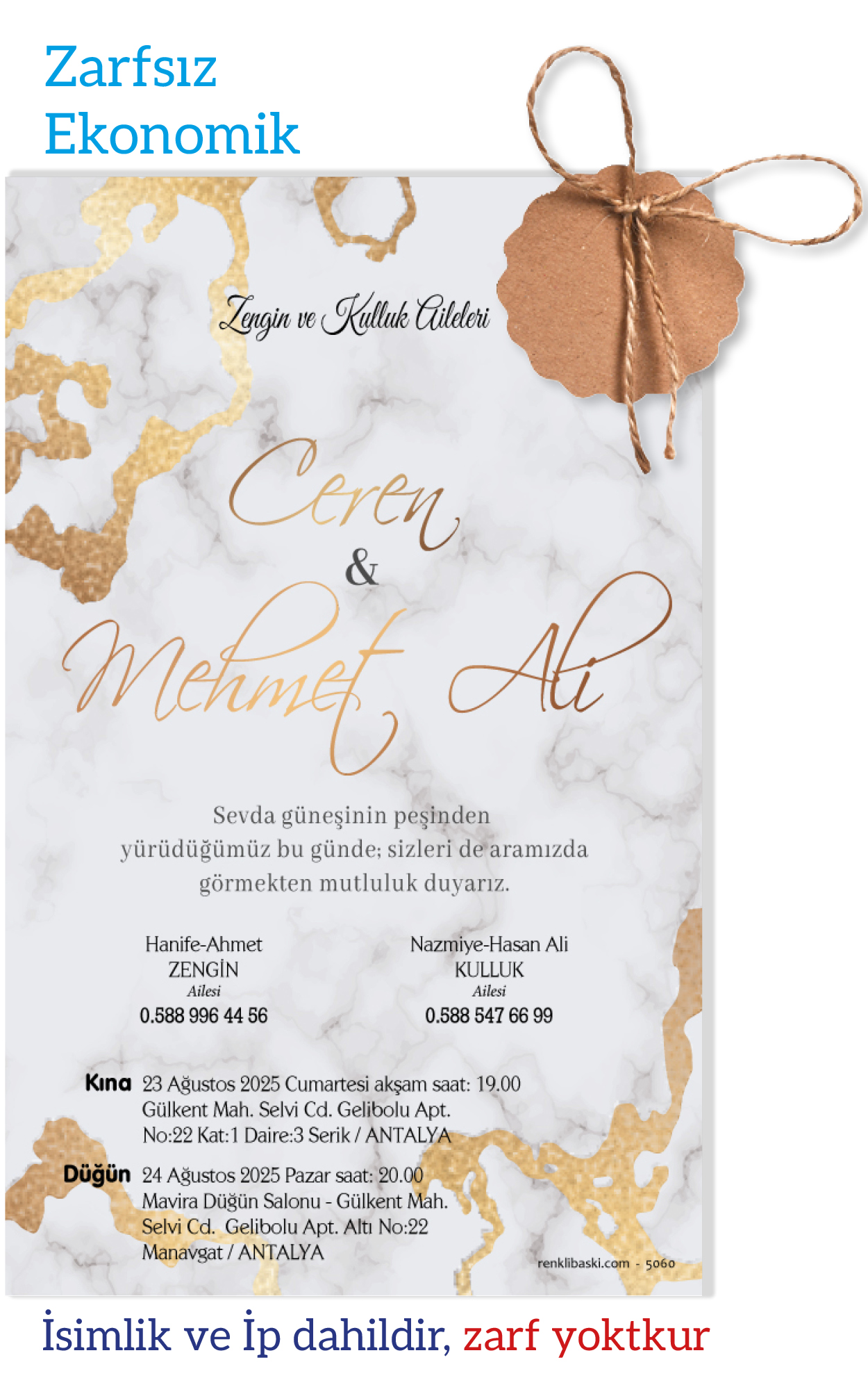 Tasarımda bulunan tüm yazı alanlarının değiştirilmesini talep edebilirsiniz. Hazırlanan davetiye tasarımının onayı alınmadan baskısı yapılmaz. Kargo içerisinde seçtiğiniz adet kadar davetiye kartı, isimlik ve ip gönderilir. İp ile isimliklerin bağlanma işlemi size aittir.
