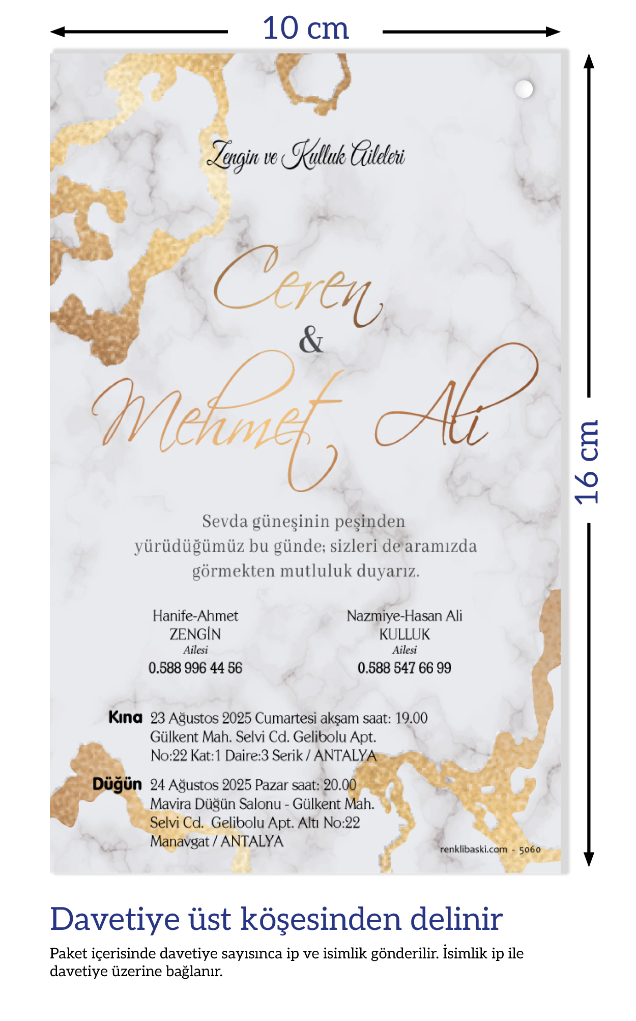 Davetiyemiz 10x16 cm ölçülerinde, dikey tasarıma sahiptir ve üst köşesinden delinerek isimlik ip ile bağlanmaktadır.