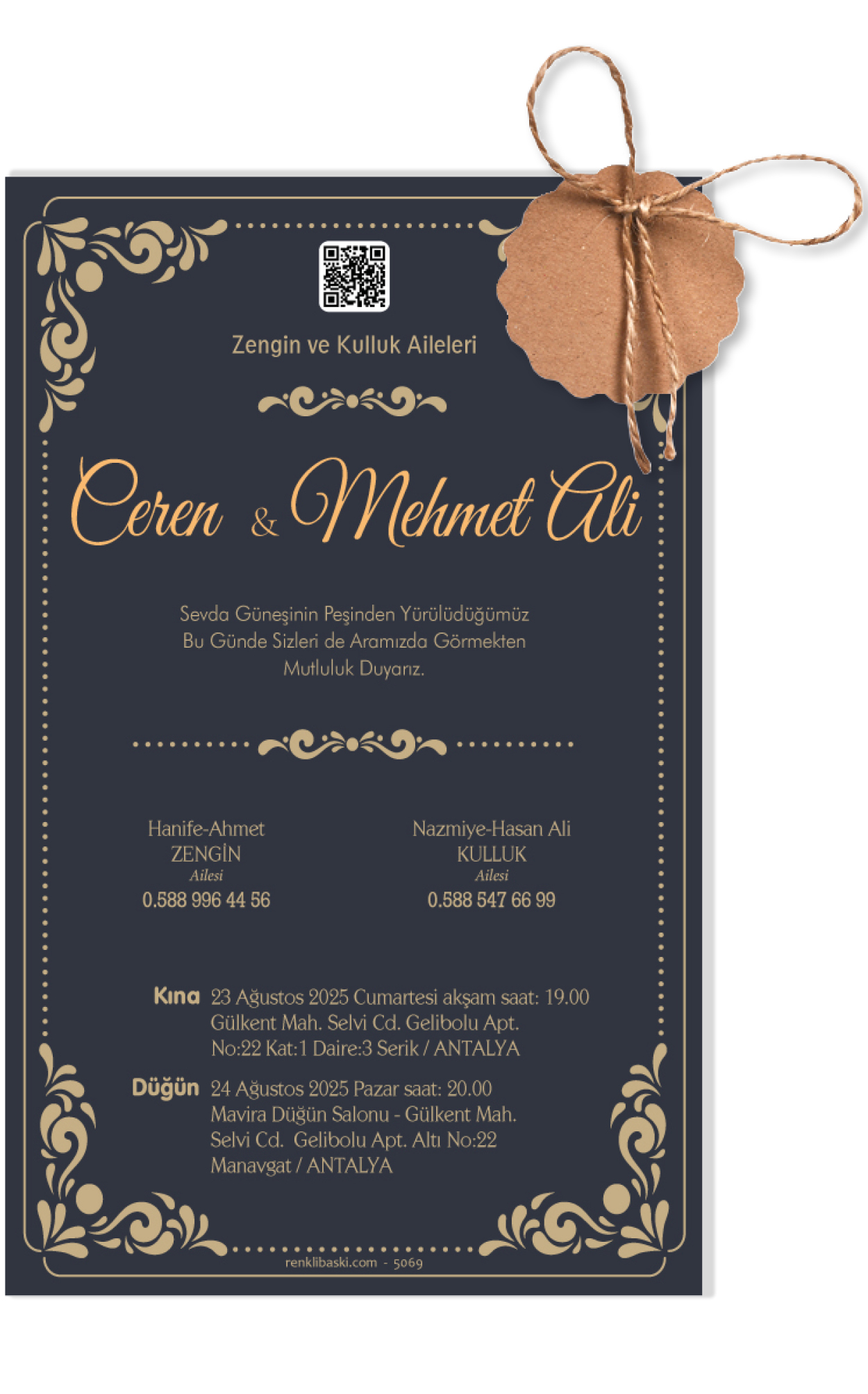 Tasarımda bulunan tüm yazı alanlarının değiştirilmesini talep edebilirsiniz. Hazırlanan davetiye tasarımının onayı alınmadan baskısı yapılmaz. Kargo içerisinde seçtiğiniz adet kadar davetiye kartı, isimlik ve ip gönderilir. İp ile isimliklerin bağlanma işlemi size aittir.