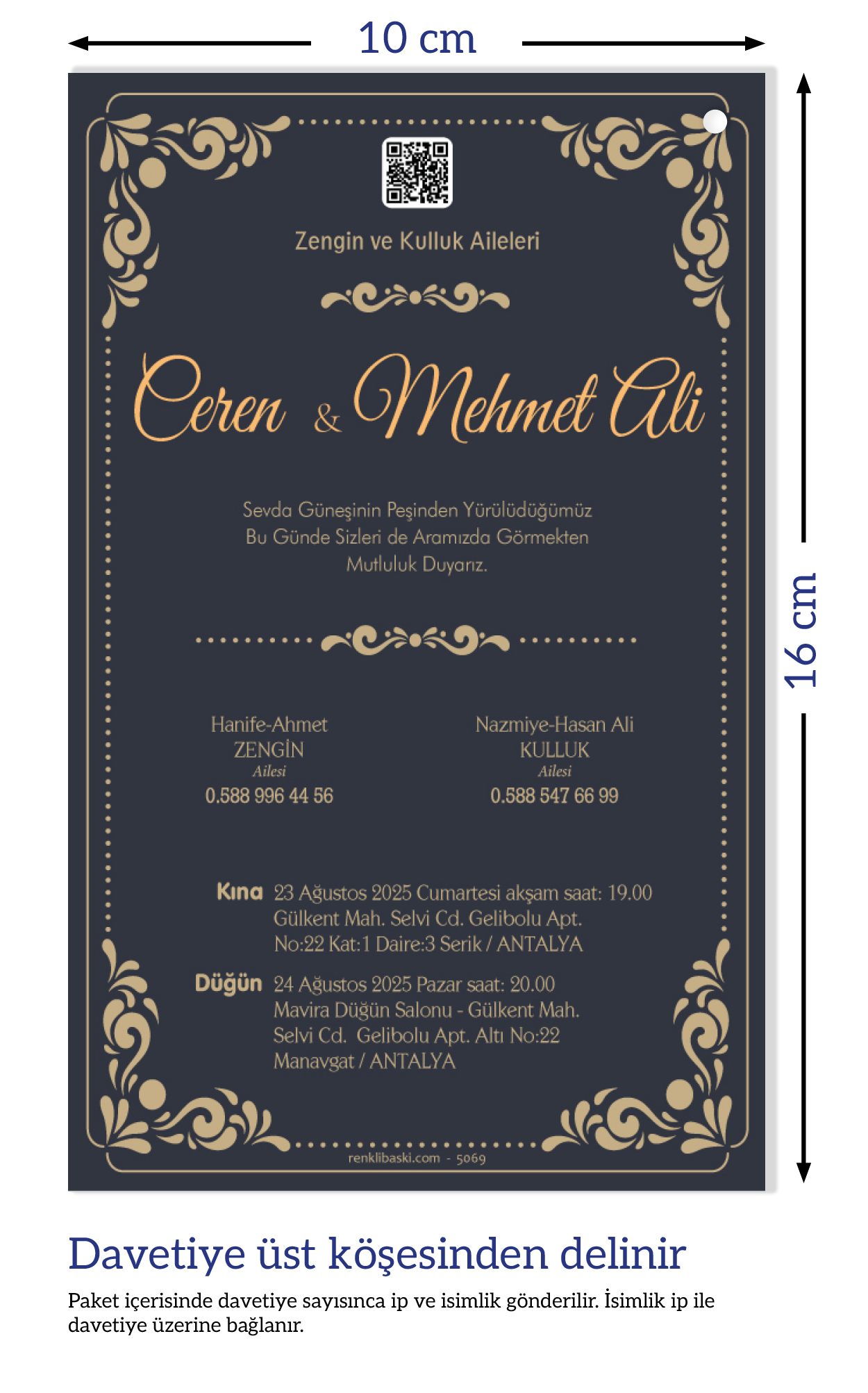 Davetiyemiz 10x16 cm ölçülerinde, dikey tasarıma sahiptir ve üst köşesinden delinerek isimlik ip ile bağlanmaktadır.