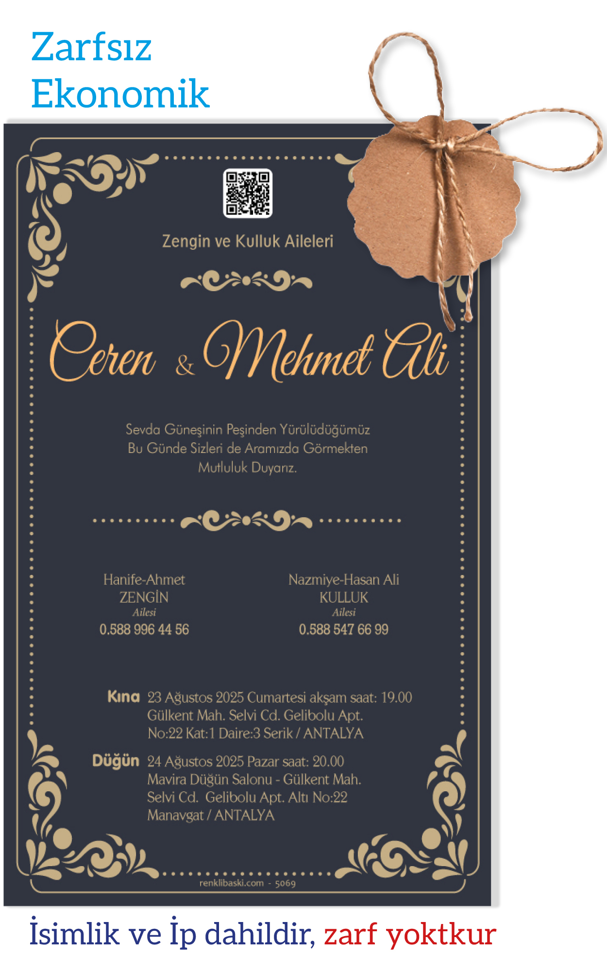 Ekonomik davetiye modelimizin düğün, nişan, kına gibi etkinlikleriniz için tasarlanmasını isteyebilirsiniz. Tasarım ücretsizdir. Tasarım hazırlatmak için 0555 190 02 00 numaralı WhatsApp hattımızla iletişime geçebilirsiniz.