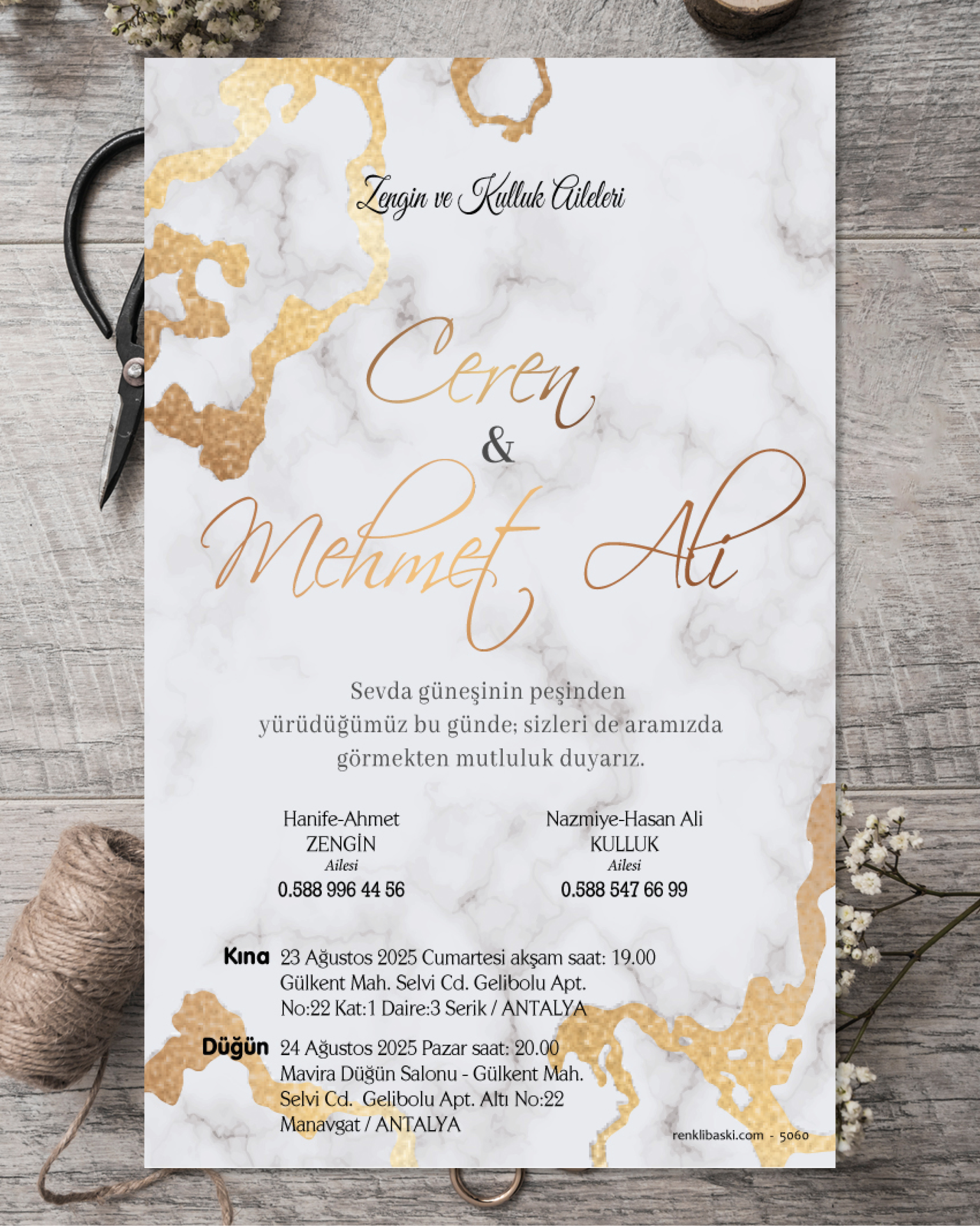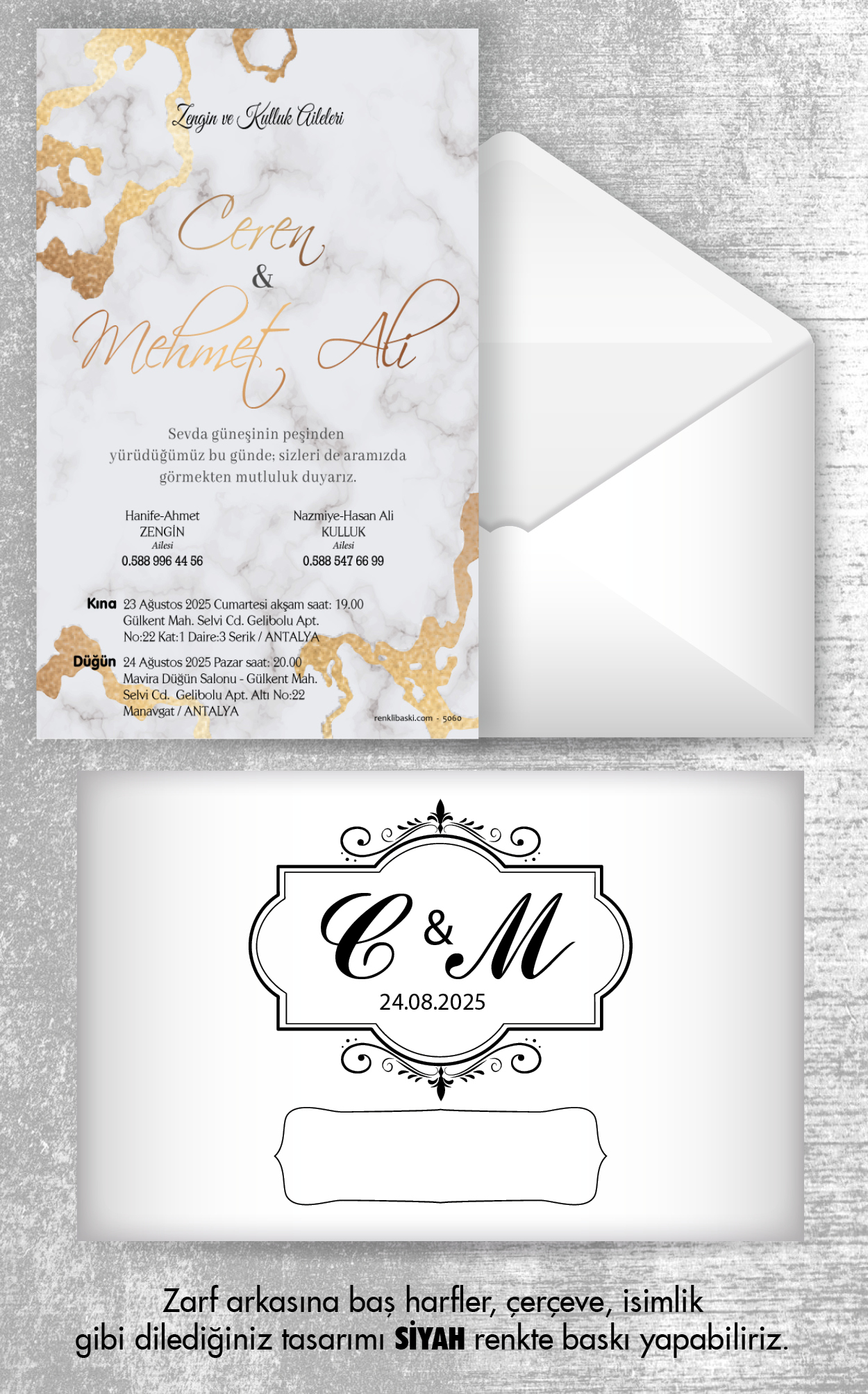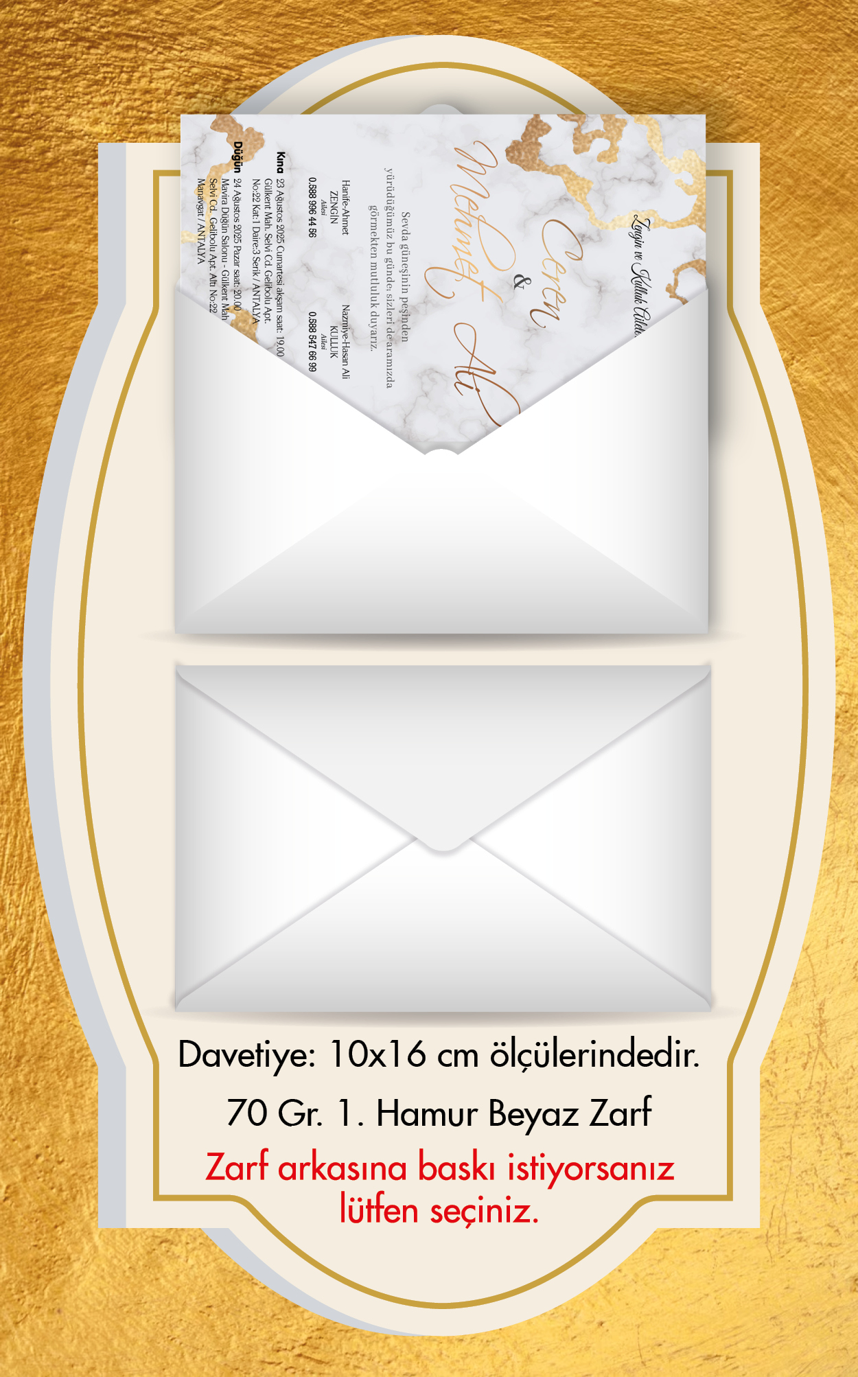 Tasarımda bulunan tüm yazı alanlarının değiştirilmesini talep edebilirsiniz. Hazırlanan davetiye tasarımının onayı alınmadan baskısı yapılmaz. Kargo içerisinde seçtiğiniz adet kadar davetiye kartı, isimlik ve ip gönderilir. İp ile isimliklerin bağlanma işlemi size aittir.