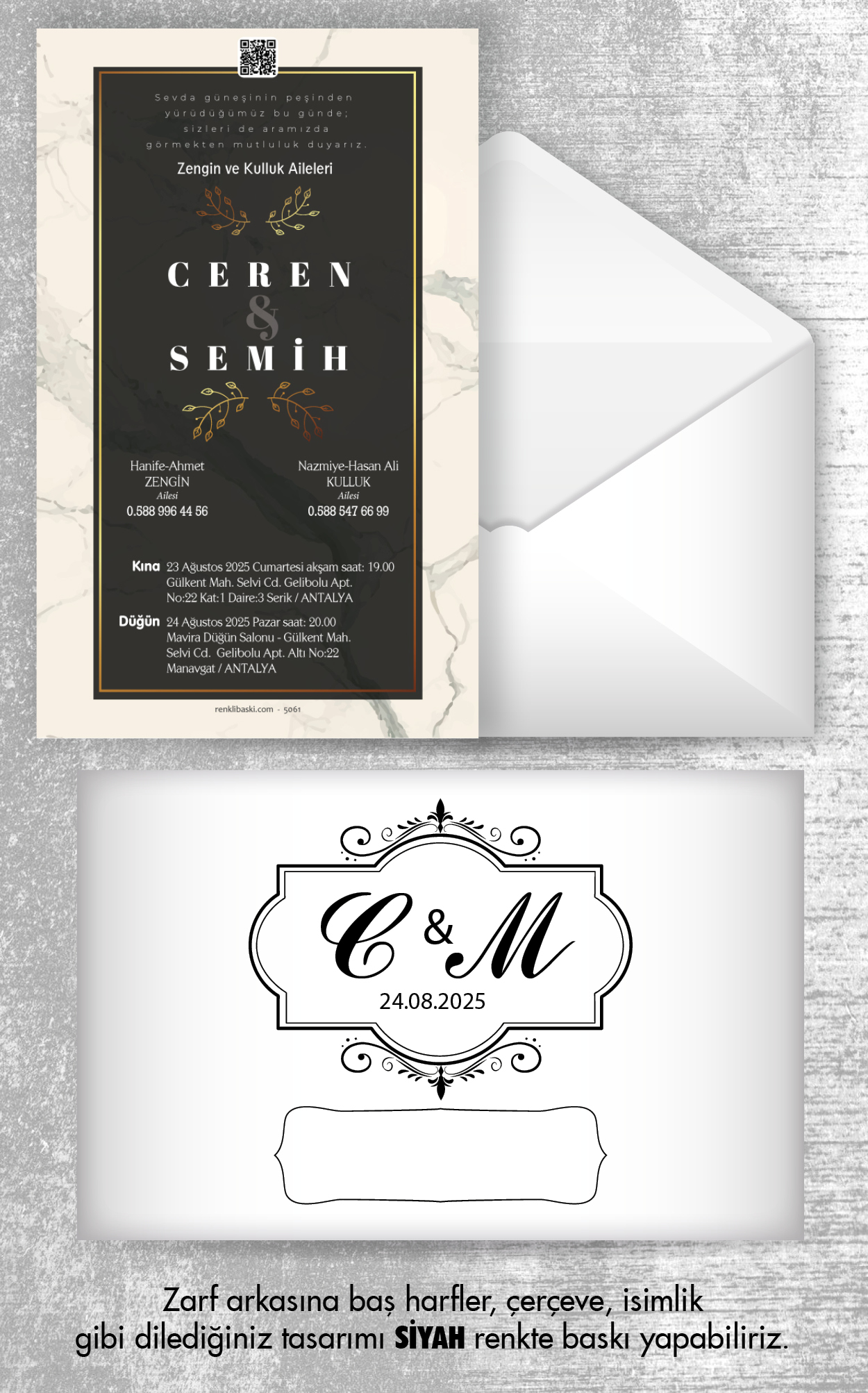 Tasarımda bulunan tüm yazı alanlarının değiştirilmesini talep edebilirsiniz. Hazırlanan davetiye tasarımının onayı alınmadan baskısı yapılmaz. Kargo içerisinde seçtiğiniz adet kadar davetiye kartı, isimlik ve ip gönderilir. İp ile isimliklerin bağlanma işlemi size aittir.