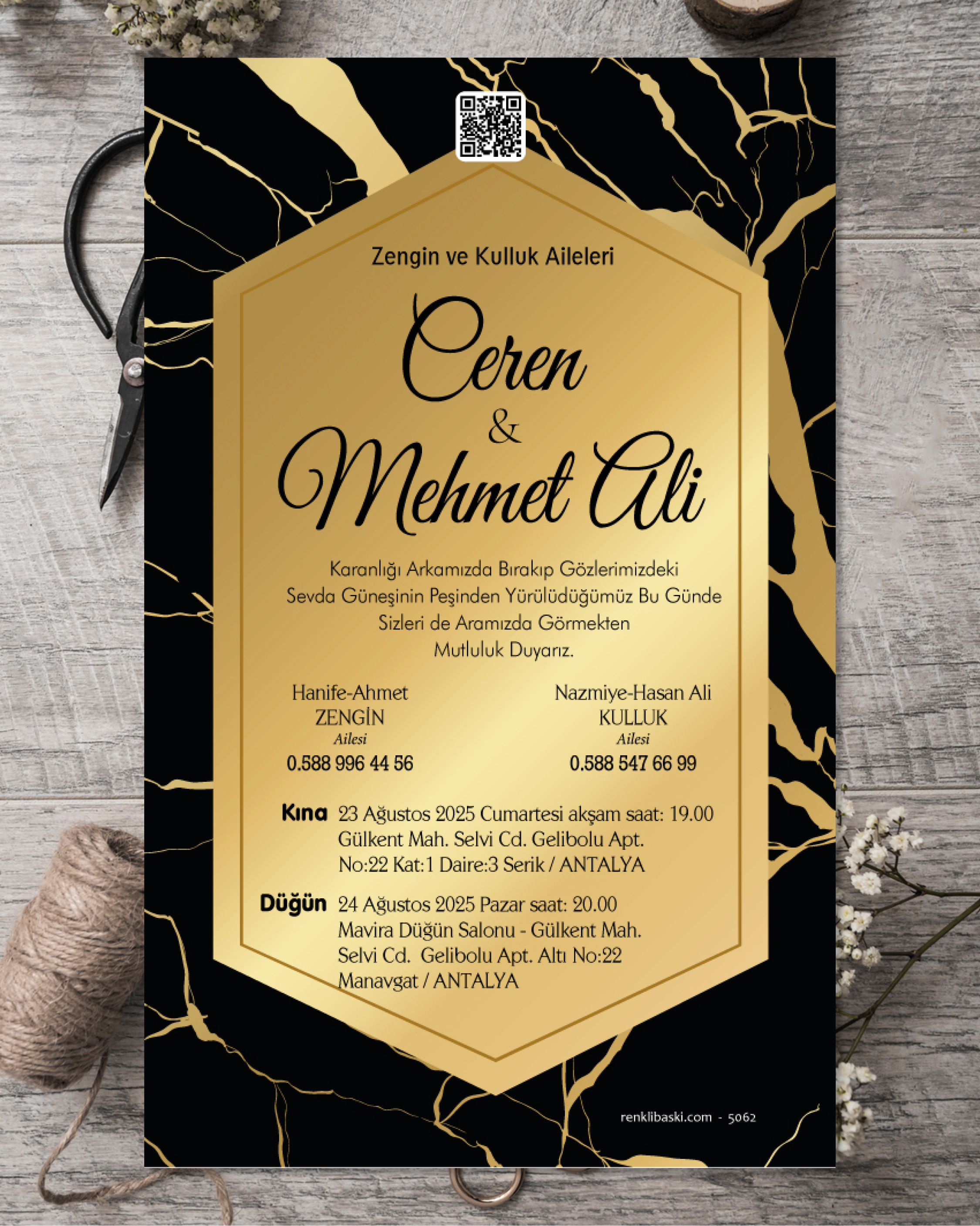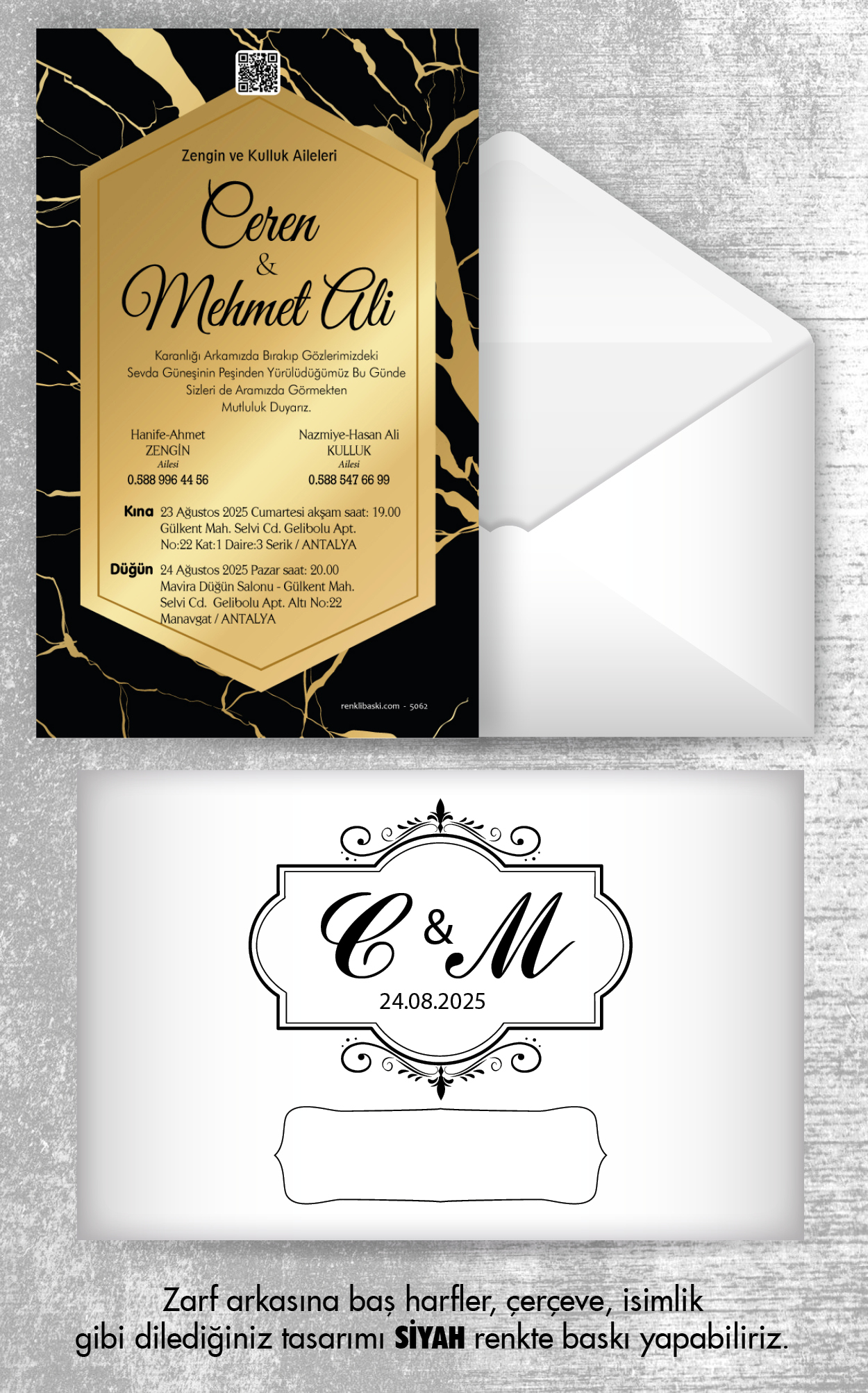 Tasarımda bulunan tüm yazı alanlarının değiştirilmesini talep edebilirsiniz. Hazırlanan davetiye tasarımının onayı alınmadan baskısı yapılmaz. Kargo içerisinde seçtiğiniz adet kadar davetiye kartı, isimlik ve ip gönderilir. İp ile isimliklerin bağlanma işlemi size aittir.