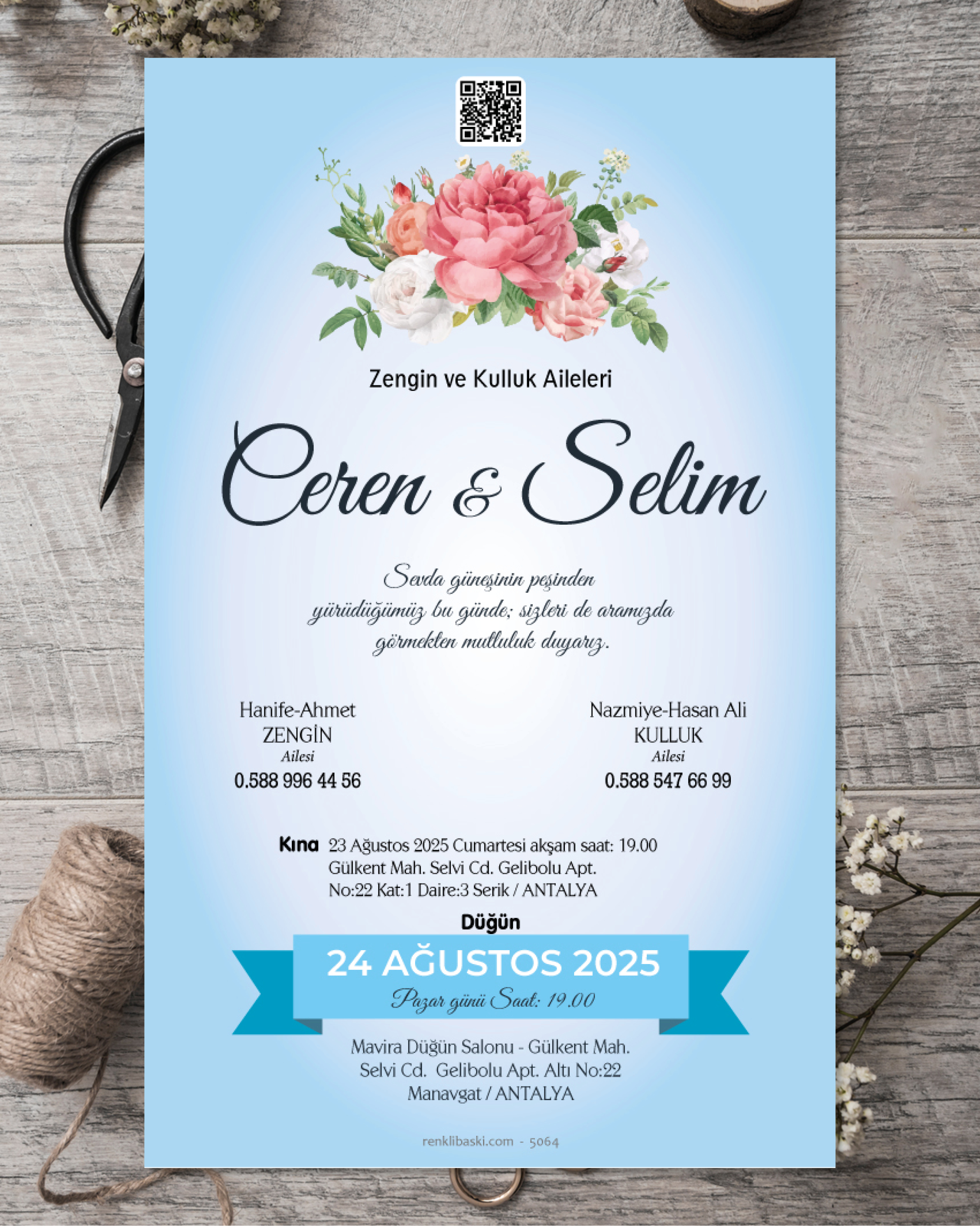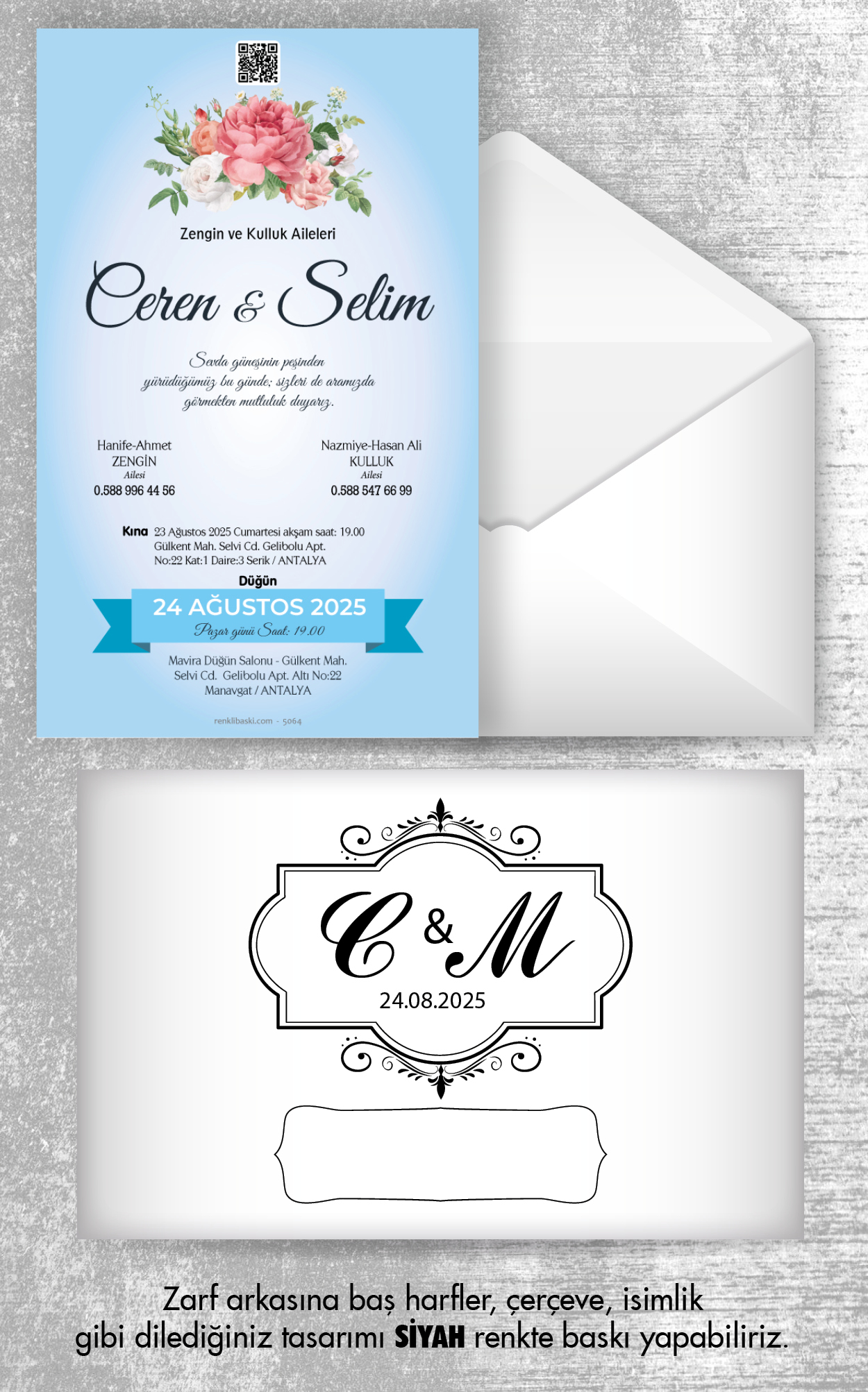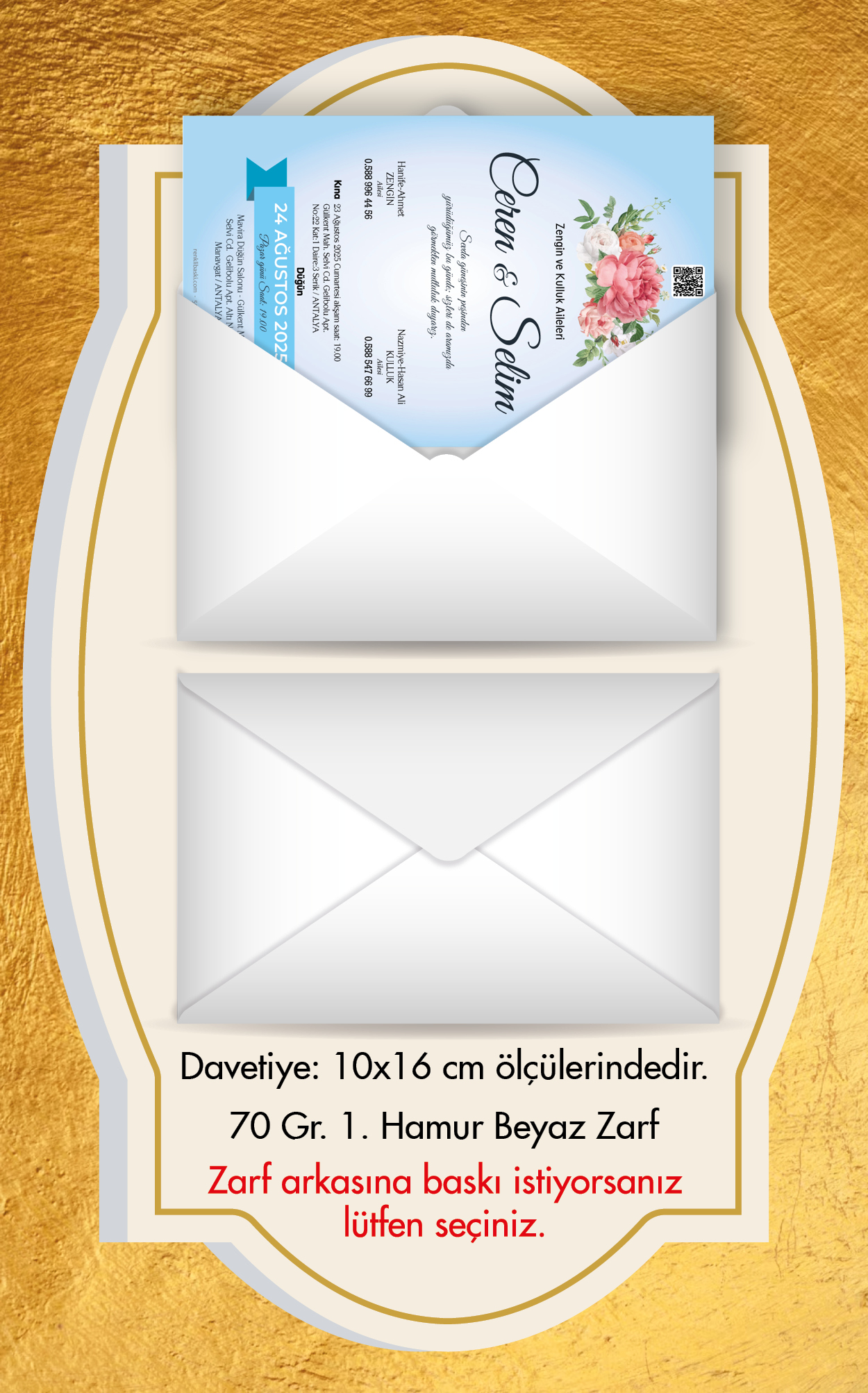 Tasarımda bulunan tüm yazı alanlarının değiştirilmesini talep edebilirsiniz. Hazırlanan davetiye tasarımının onayı alınmadan baskısı yapılmaz. Kargo içerisinde seçtiğiniz adet kadar davetiye kartı, isimlik ve ip gönderilir. İp ile isimliklerin bağlanma işlemi size aittir.
