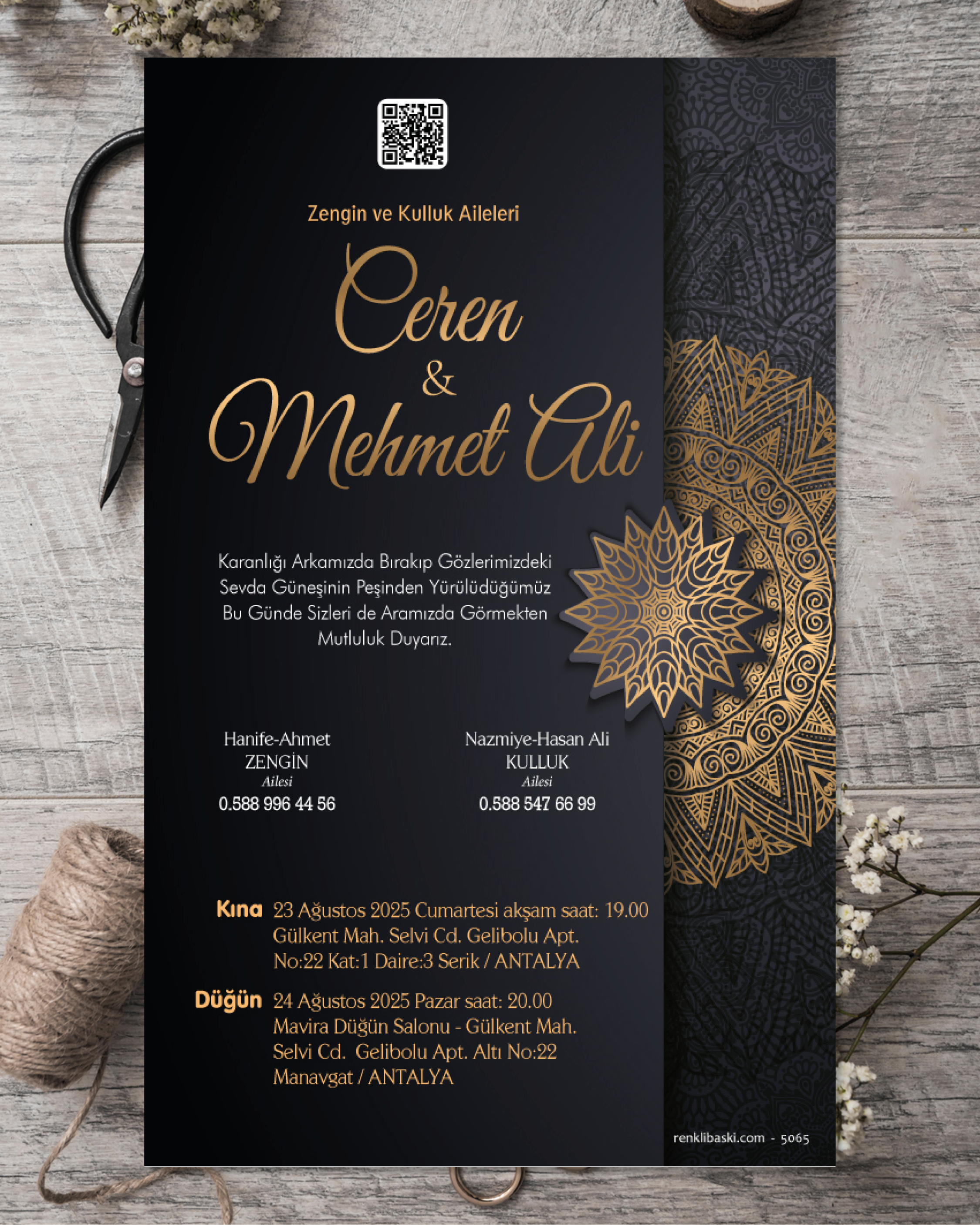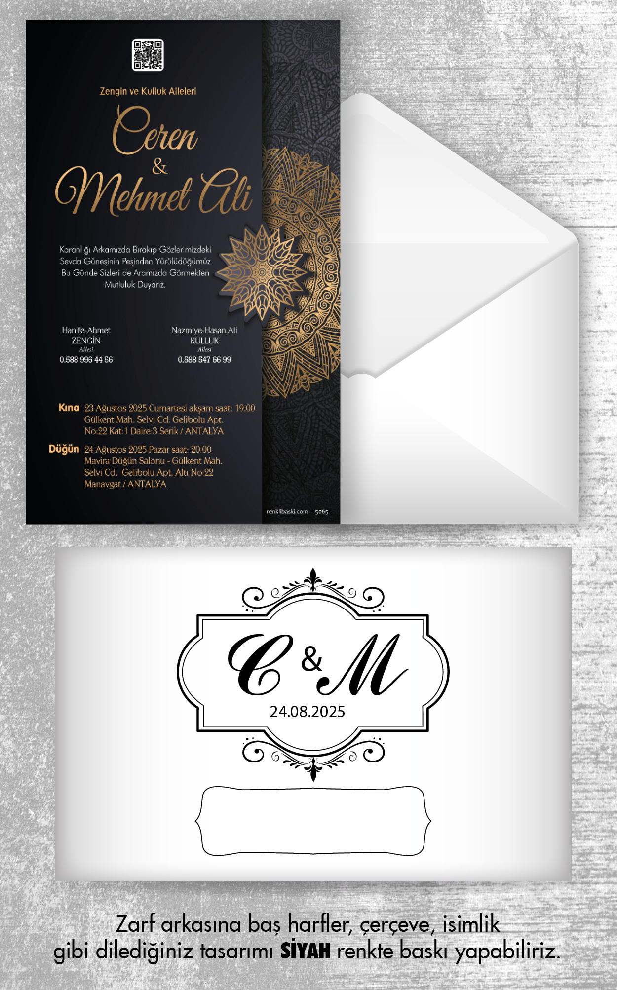 Tasarımda bulunan tüm yazı alanlarının değiştirilmesini talep edebilirsiniz. Hazırlanan davetiye tasarımının onayı alınmadan baskısı yapılmaz. Kargo içerisinde seçtiğiniz adet kadar davetiye kartı, isimlik ve ip gönderilir. İp ile isimliklerin bağlanma işlemi size aittir.