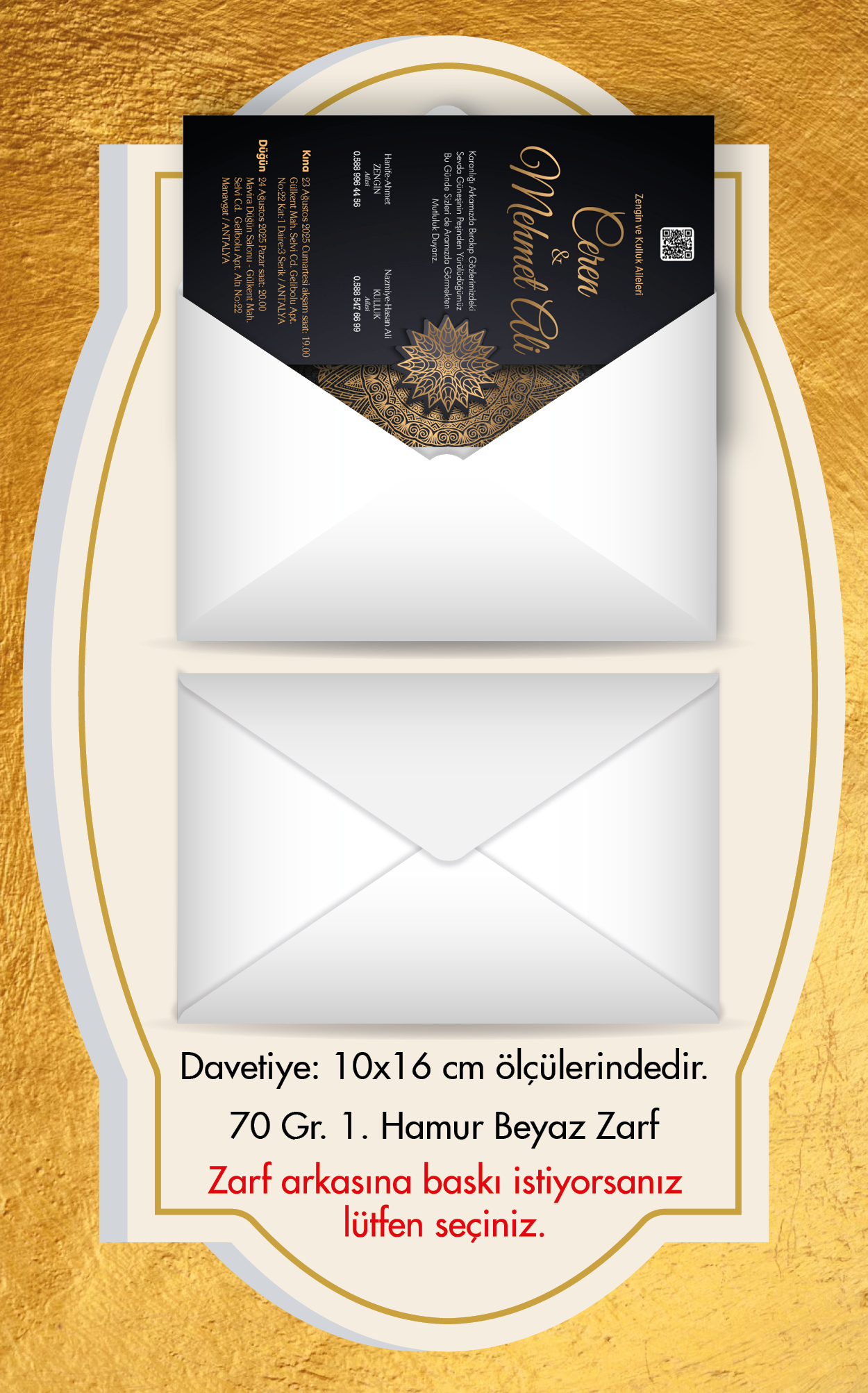 Ekonomik davetiye modelimizin düğün, nişan, kına gibi etkinlikleriniz için tasarlanmasını isteyebilirsiniz. Tasarım ücretsizdir. Tasarım hazırlatmak için 0555 190 02 00 numaralı WhatsApp hattımızla iletişime geçebilirsiniz.