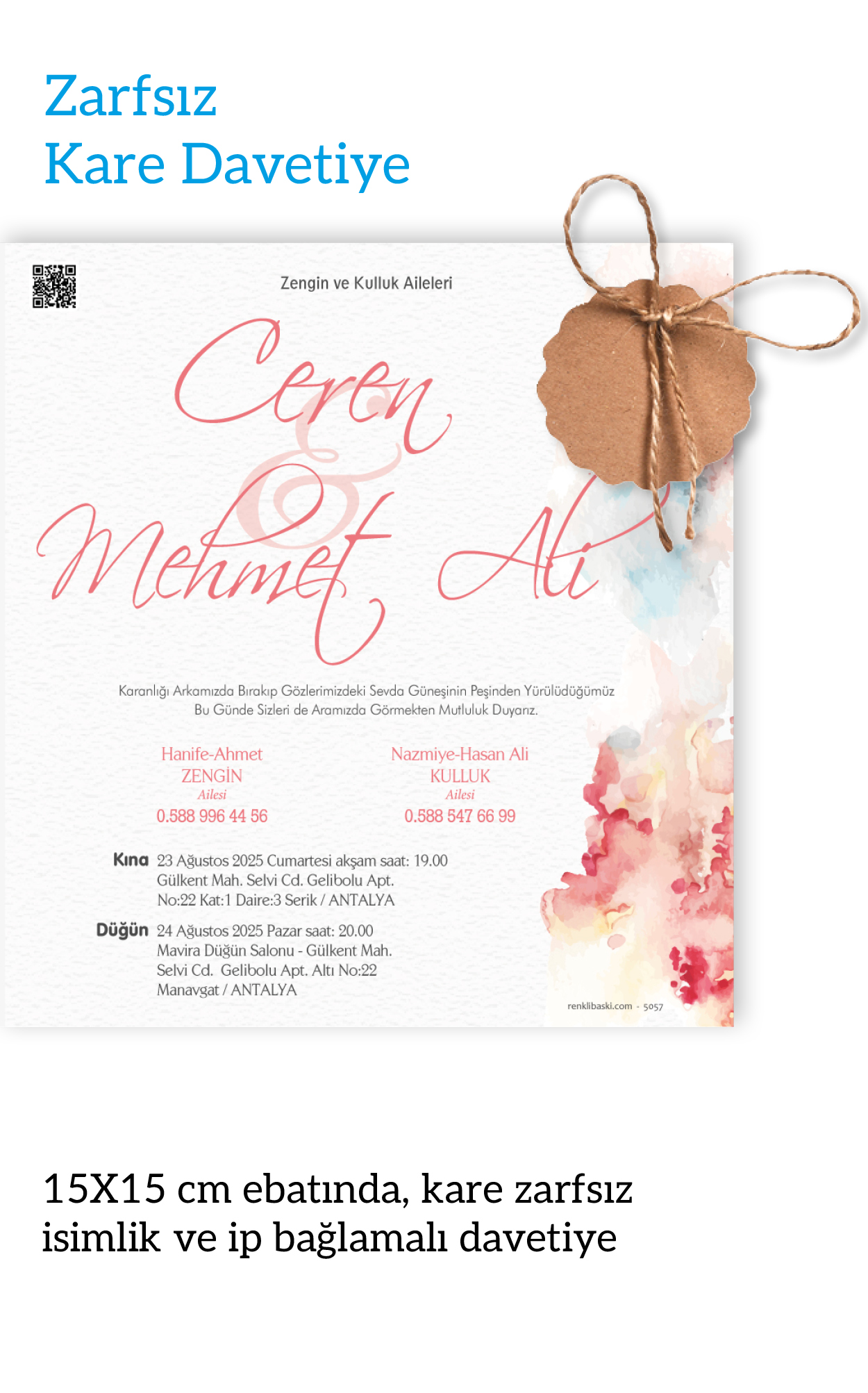 Tasarımda bulunan tüm yazı alanlarının değiştirilmesini talep edebilirsiniz. Hazırlanan davetiye tasarımının onayı alınmadan baskısı yapılmaz. Kargo içerisinde seçtiğiniz adet kadar davetiye kartı, isimlik ve ip gönderilir. İp ile isimliklerin bağlanma işlemi size aittir.