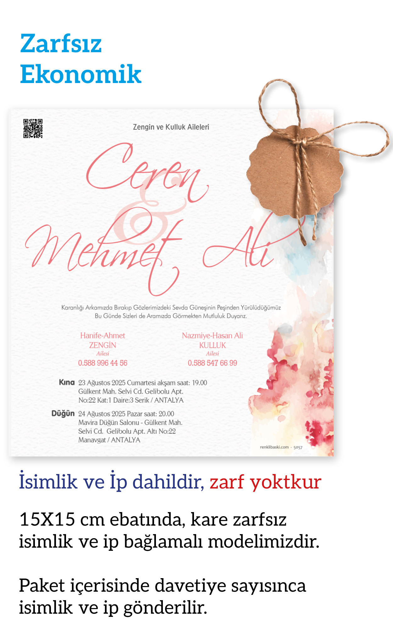Ekonomik davetiye modelimizin düğün, nişan, kına gibi etkinlikleriniz için tasarlanmasını isteyebilirsiniz. Tasarım ücretsizdir. Tasarım hazırlatmak için 0555 190 02 00 numaralı WhatsApp hattımızla iletişime geçebilirsiniz.