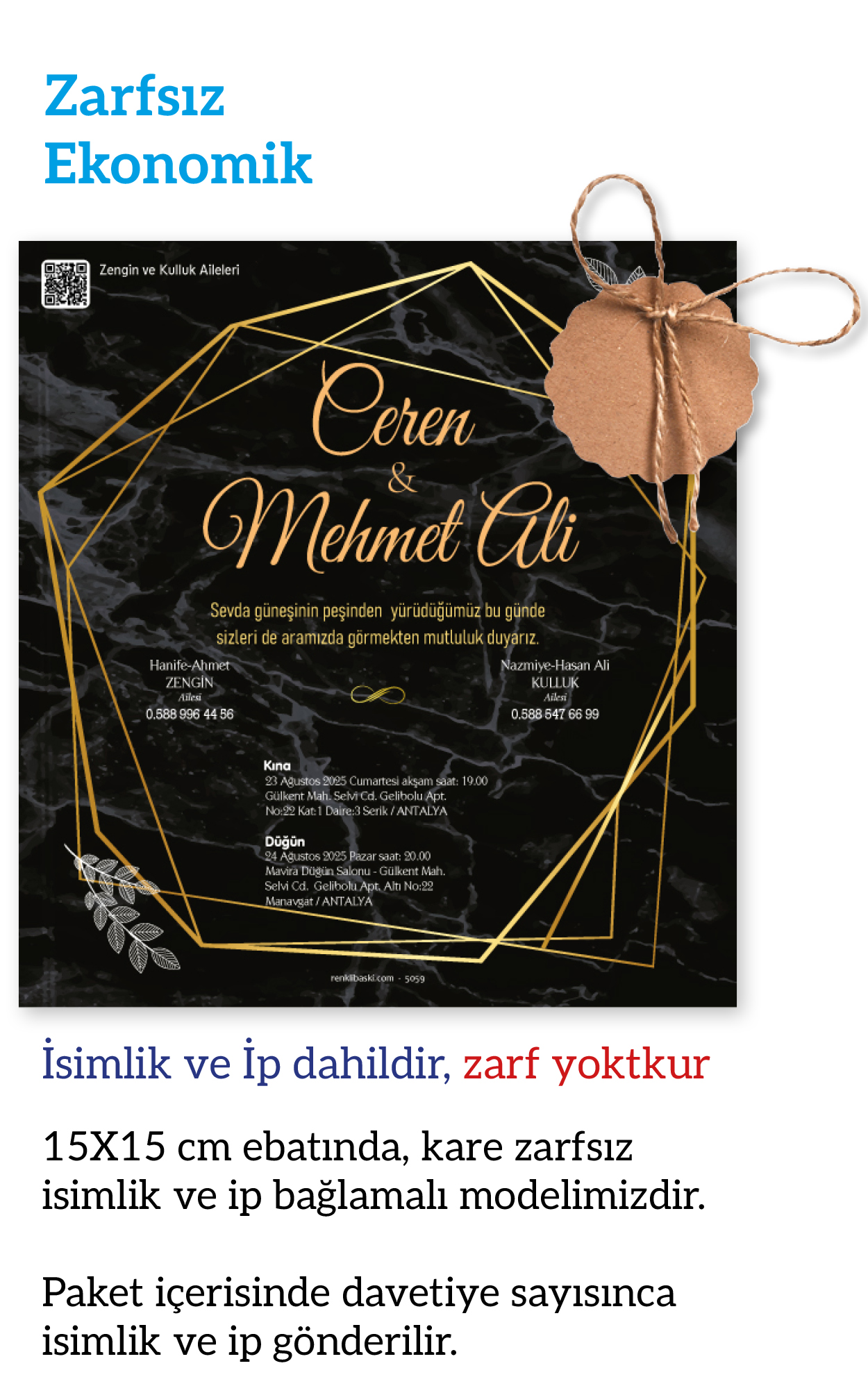Ekonomik davetiye modelimizin düğün, nişan, kına gibi etkinlikleriniz için tasarlanmasını isteyebilirsiniz. Tasarım ücretsizdir. Tasarım hazırlatmak için 0555 190 02 00 numaralı WhatsApp hattımızla iletişime geçebilirsiniz.