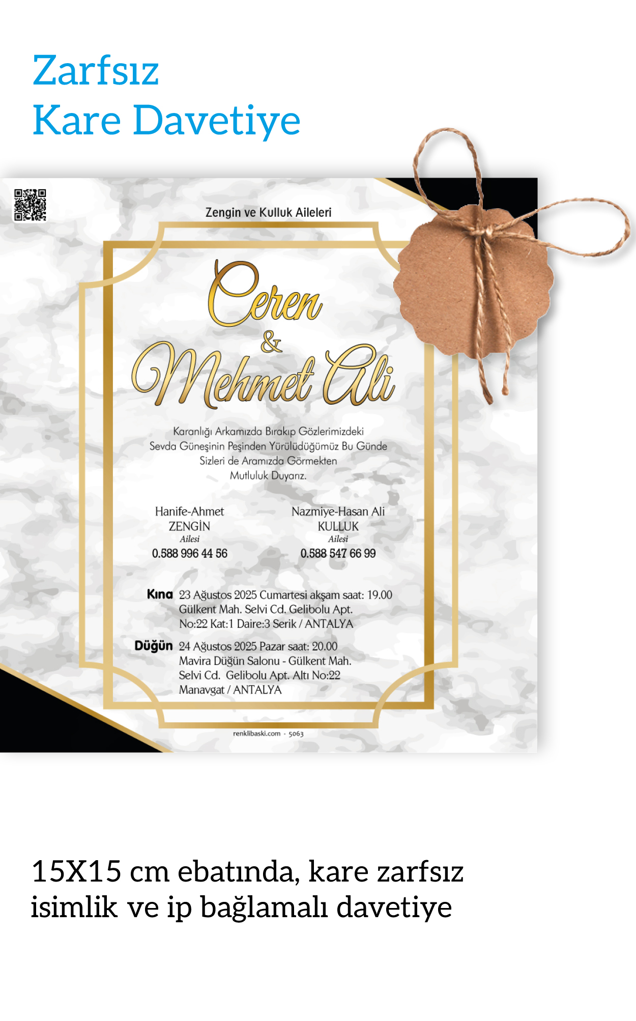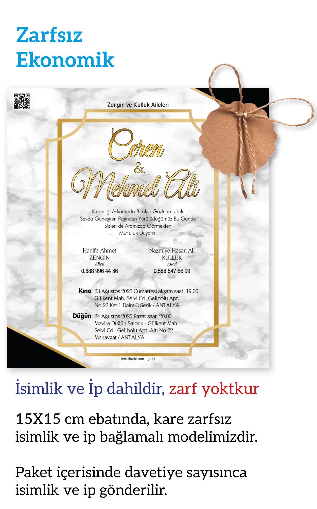Tasarımda bulunan tüm yazı alanlarının değiştirilmesini talep edebilirsiniz. Hazırlanan davetiye tasarımının onayı alınmadan baskısı yapılmaz. Kargo içerisinde seçtiğiniz adet kadar davetiye kartı, isimlik ve ip gönderilir. İp ile isimliklerin bağlanma işlemi size aittir.