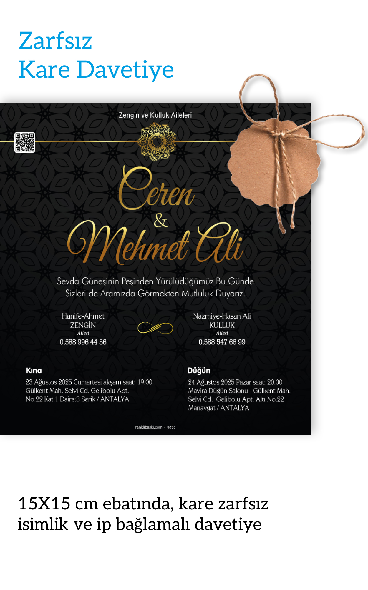 Tasarımda bulunan tüm yazı alanlarının değiştirilmesini talep edebilirsiniz. Hazırlanan davetiye tasarımının onayı alınmadan baskısı yapılmaz. Kargo içerisinde seçtiğiniz adet kadar davetiye kartı, isimlik ve ip gönderilir. İp ile isimliklerin bağlanma işlemi size aittir.