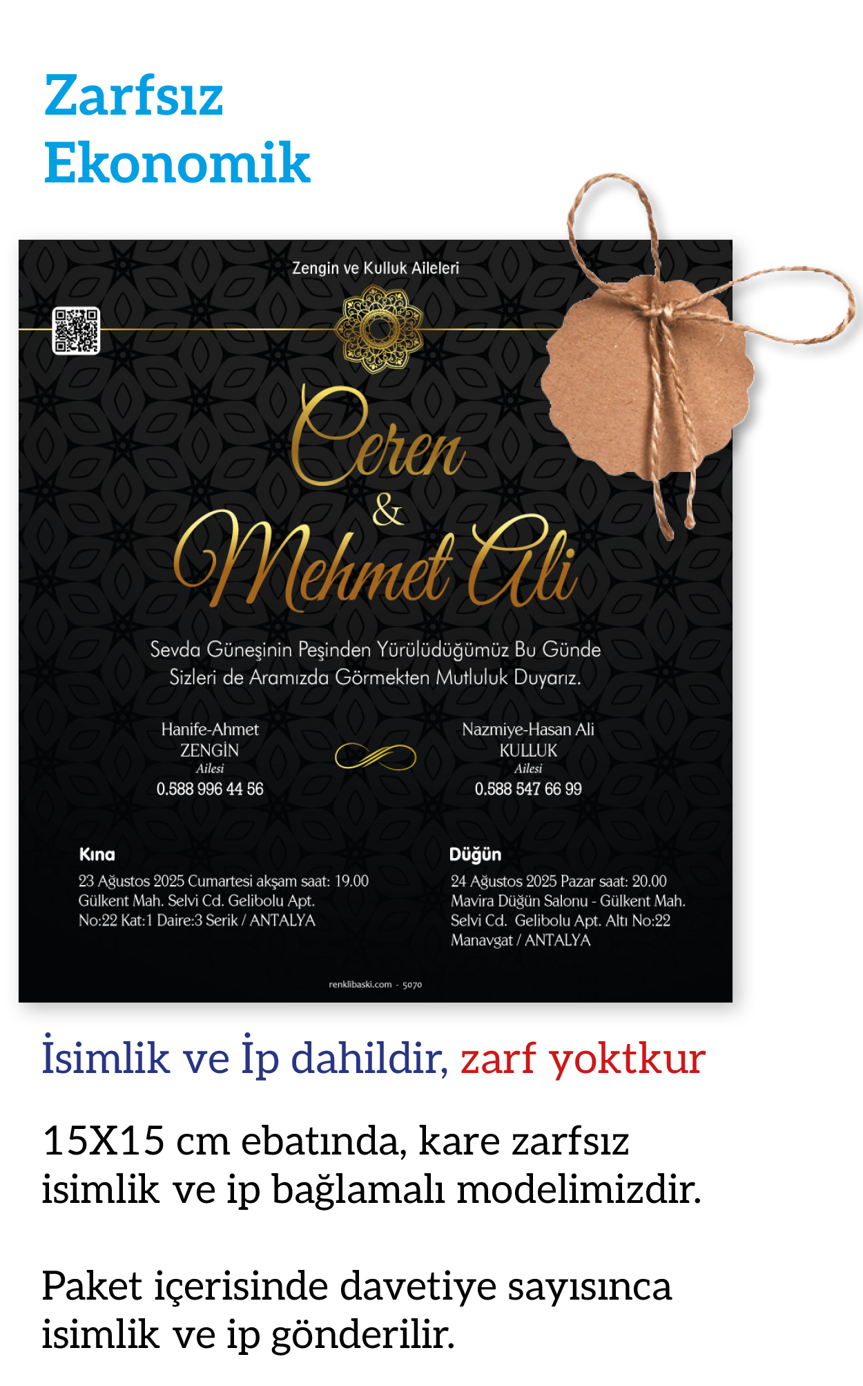 Ekonomik davetiye modelimizin düğün, nişan, kına gibi etkinlikleriniz için tasarlanmasını isteyebilirsiniz. Tasarım ücretsizdir. Tasarım hazırlatmak için 0555 190 02 00 numaralı WhatsApp hattımızla iletişime geçebilirsiniz.