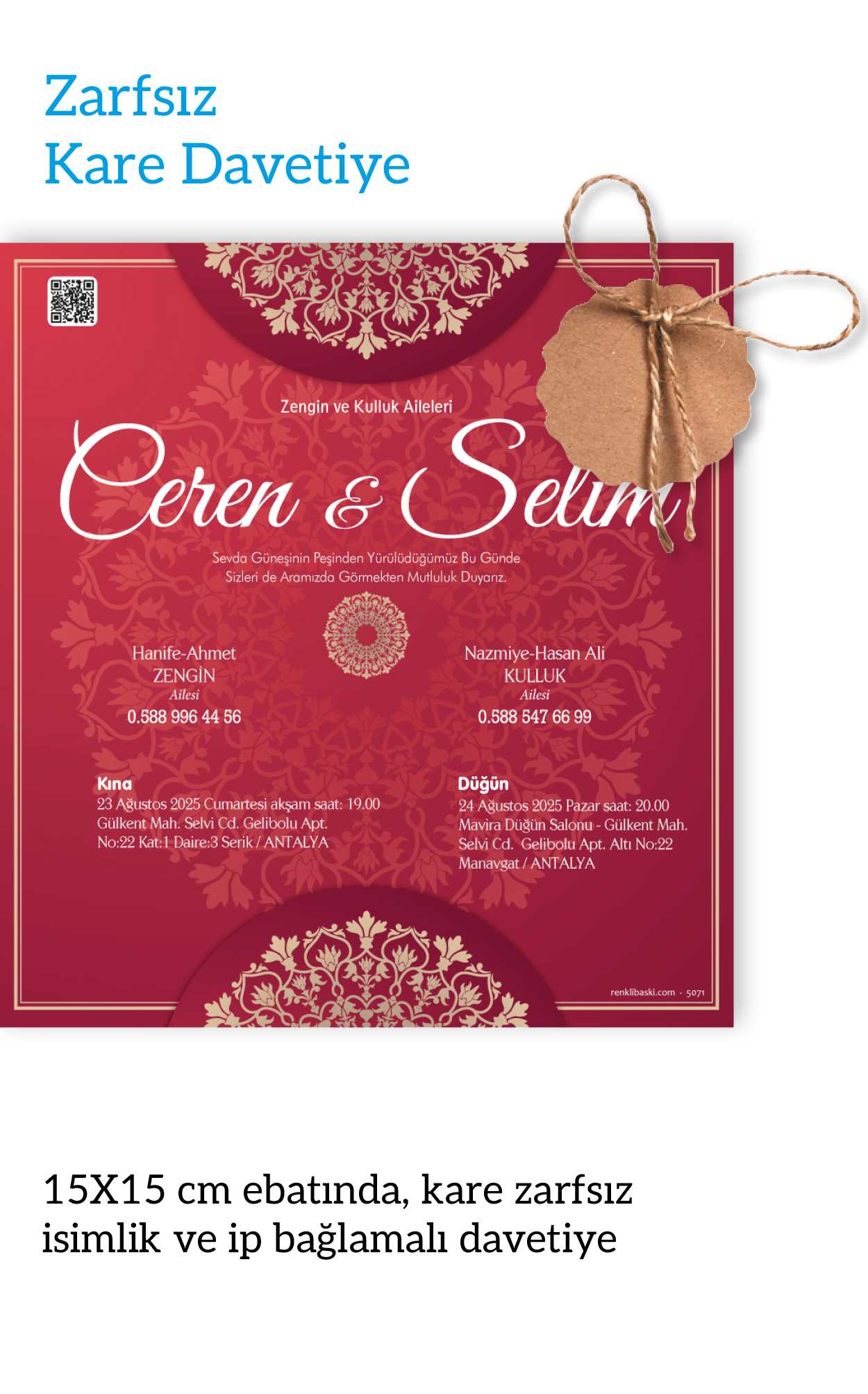 Tasarımda bulunan tüm yazı alanlarının değiştirilmesini talep edebilirsiniz. Hazırlanan davetiye tasarımının onayı alınmadan baskısı yapılmaz. Kargo içerisinde seçtiğiniz adet kadar davetiye kartı, isimlik ve ip gönderilir. İp ile isimliklerin bağlanma işlemi size aittir.