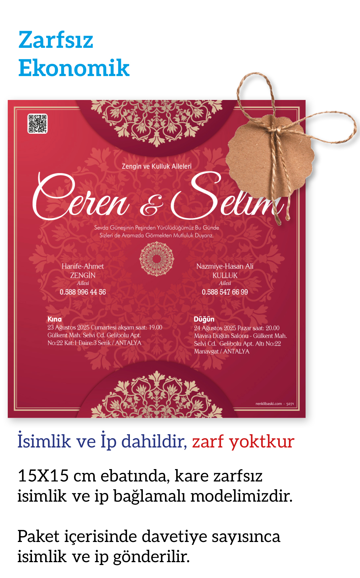 Ekonomik davetiye modelimizin düğün, nişan, kına gibi etkinlikleriniz için tasarlanmasını isteyebilirsiniz. Tasarım ücretsizdir. Tasarım hazırlatmak için 0555 190 02 00 numaralı WhatsApp hattımızla iletişime geçebilirsiniz.