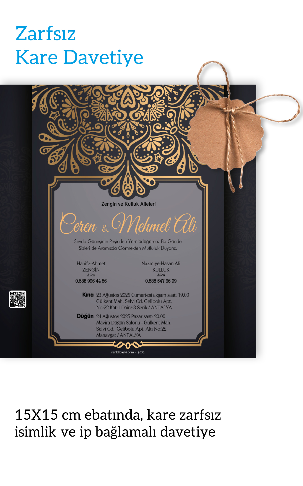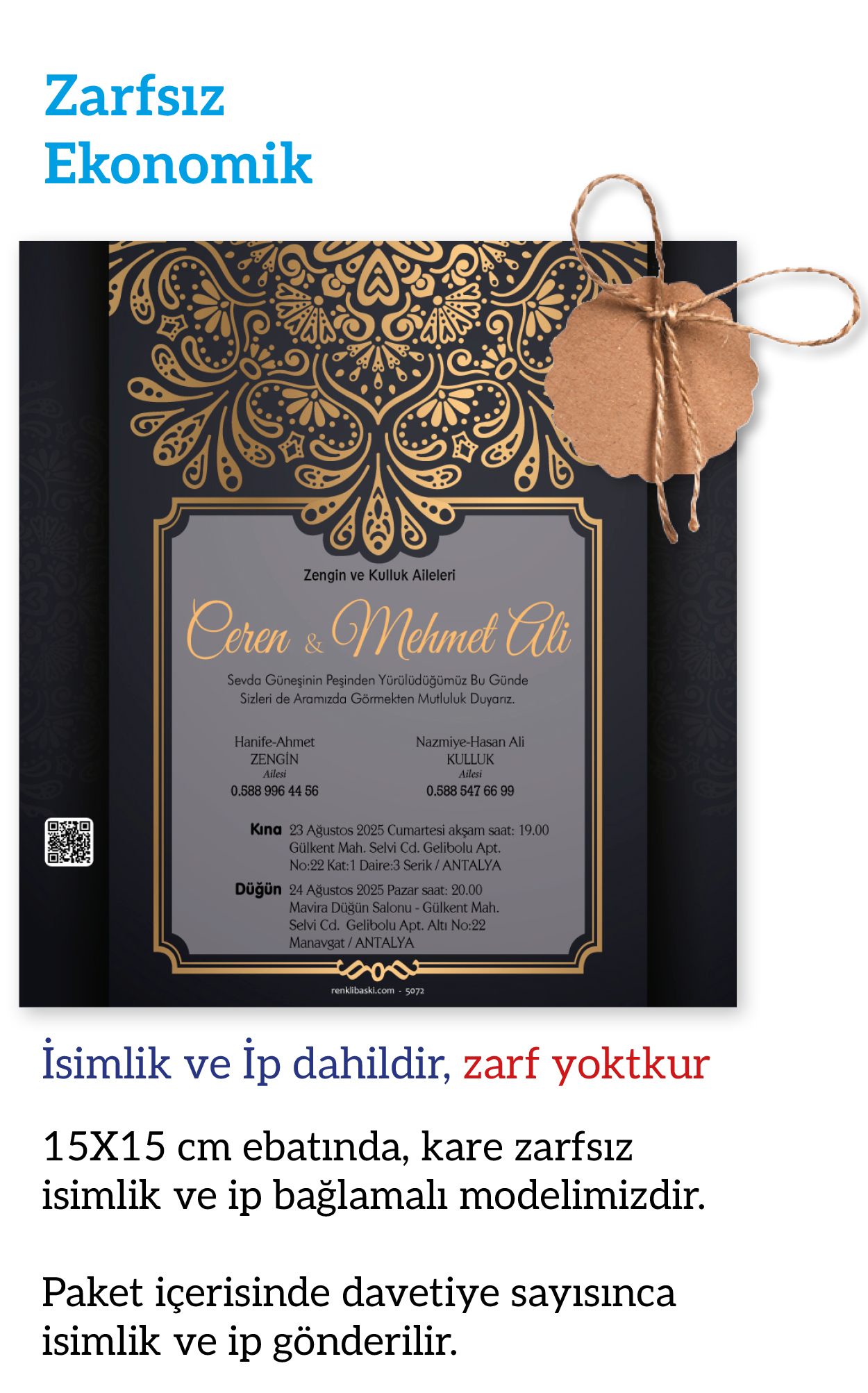 Ekonomik davetiye modelimizin düğün, nişan, kına gibi etkinlikleriniz için tasarlanmasını isteyebilirsiniz. Tasarım ücretsizdir. Tasarım hazırlatmak için 0555 190 02 00 numaralı WhatsApp hattımızla iletişime geçebilirsiniz.