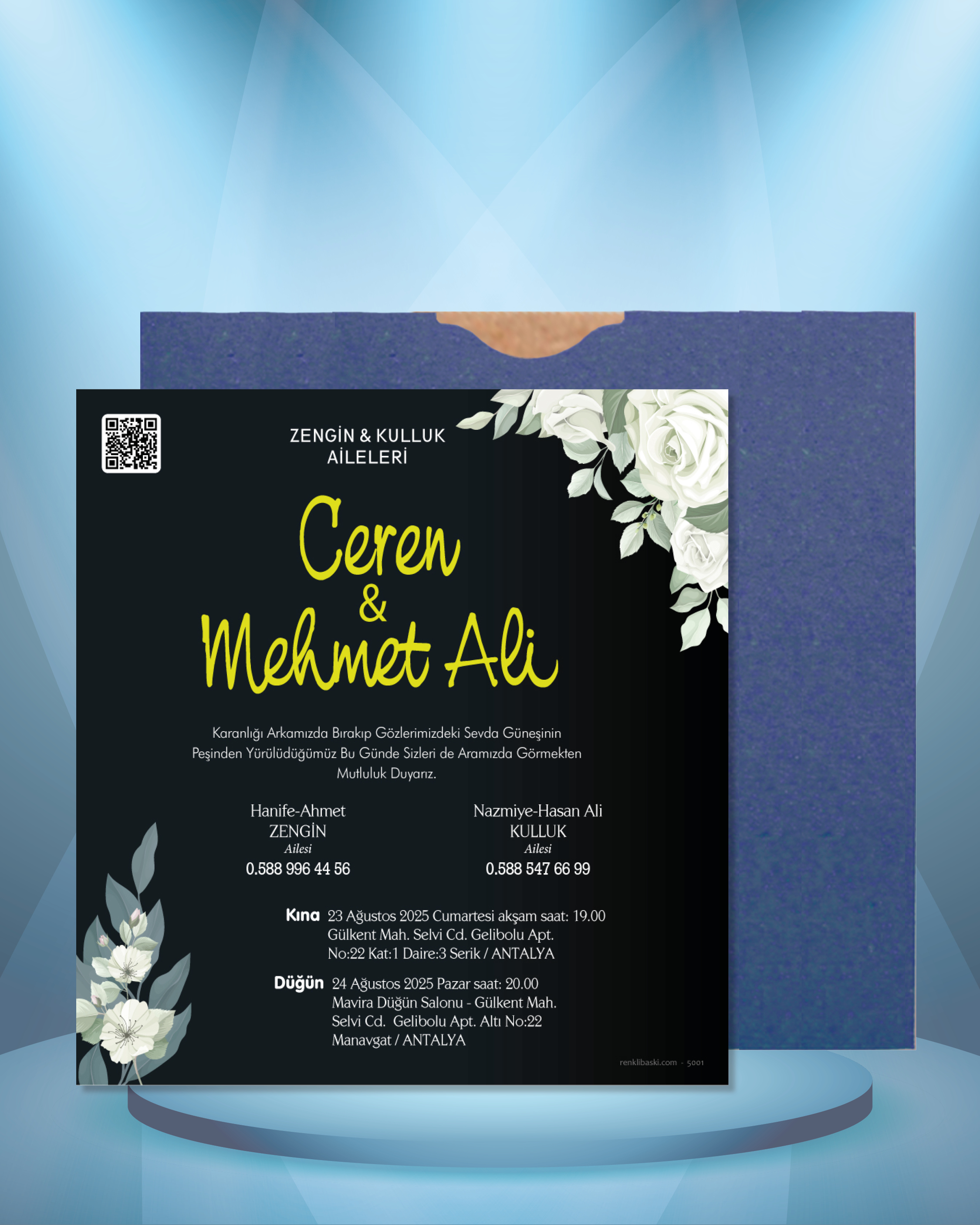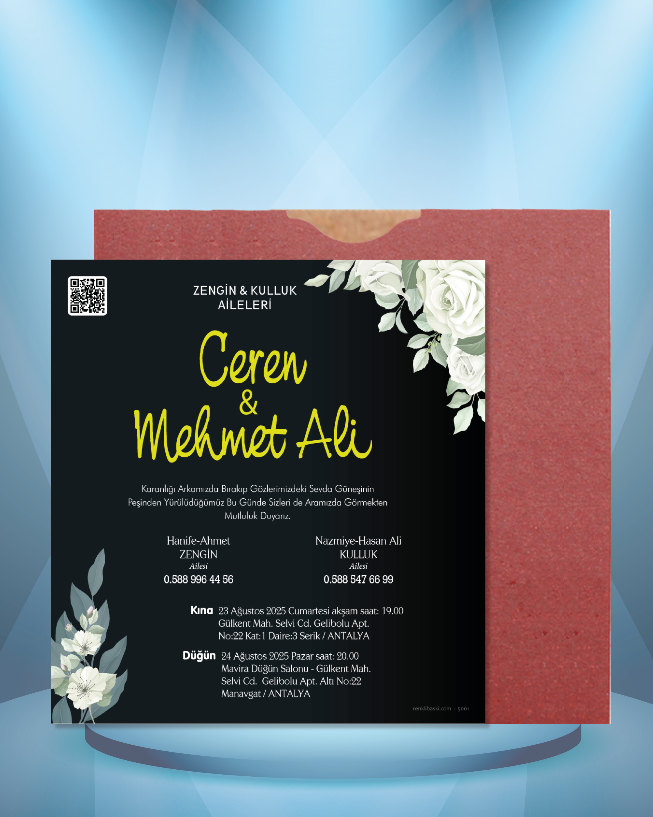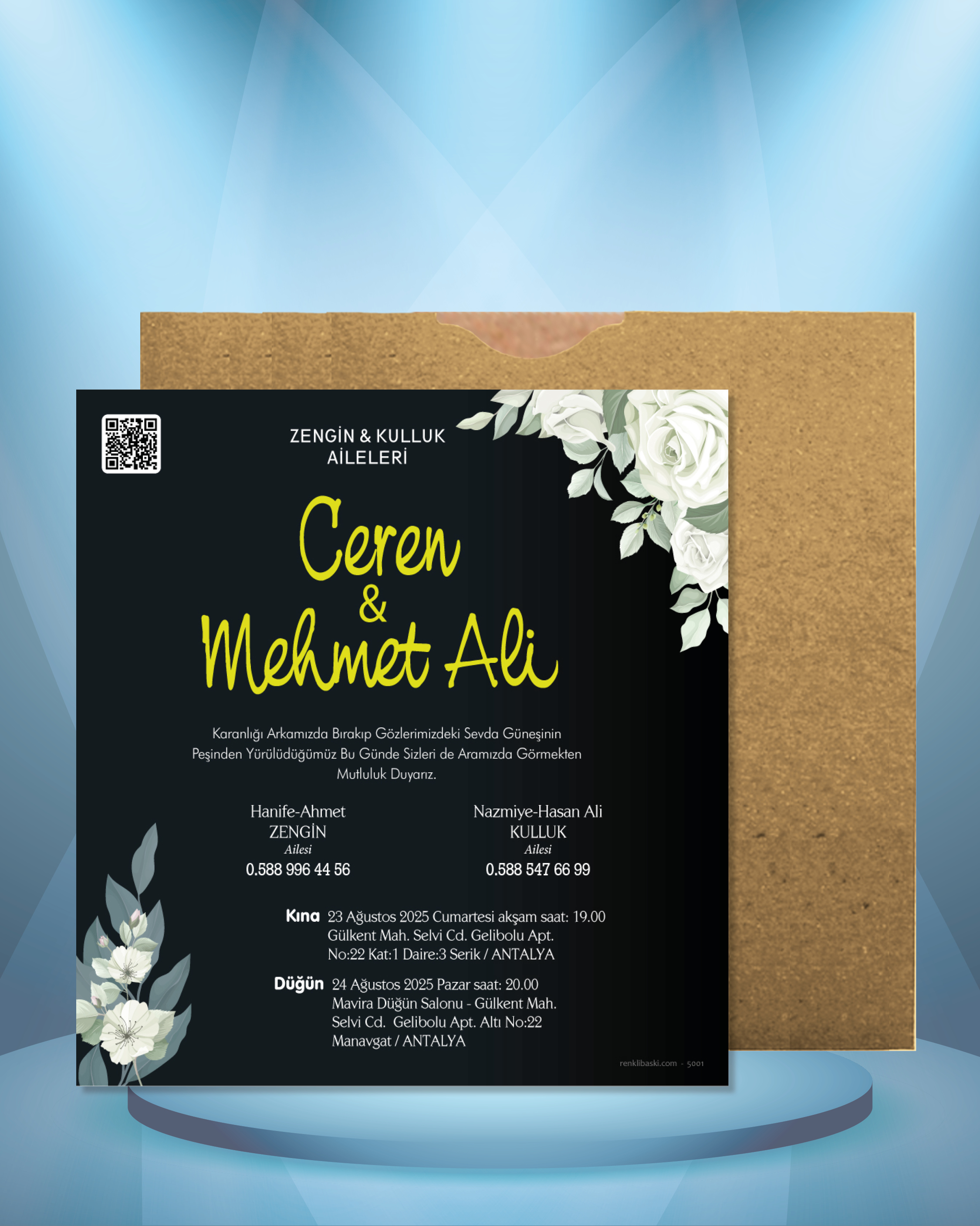 Tasarımda bulunan tüm yazı alanlarının değiştirilmesini talep edebilirsiniz. Hazırlanan davetiye tasarımının onayı alınmadan baskısı yapılmaz. Kargo içerisinde seçtiğiniz adet kadar davetiye kartı, isimlik ve ip gönderilir. İp ile isimliklerin bağlanma işlemi size aittir.
