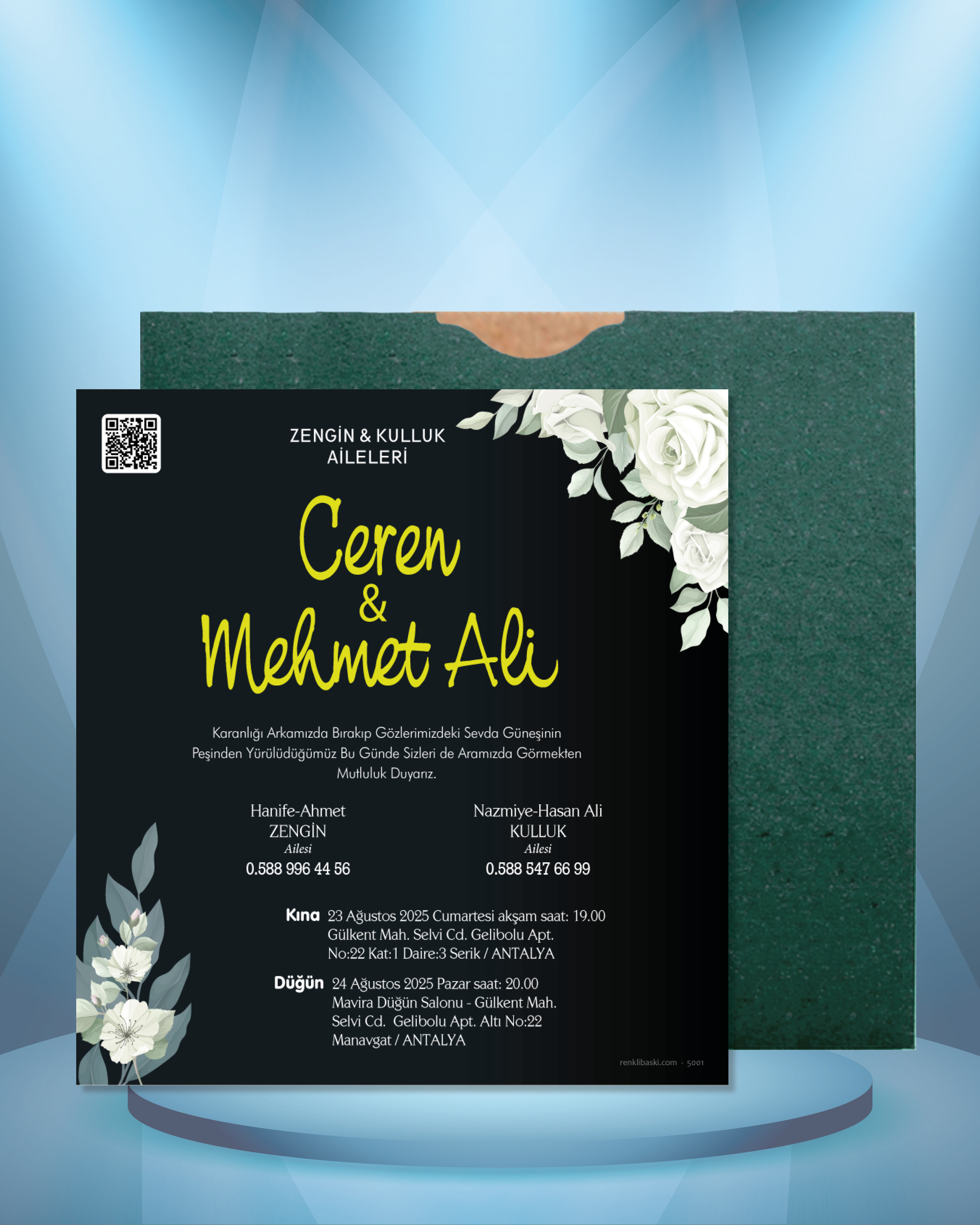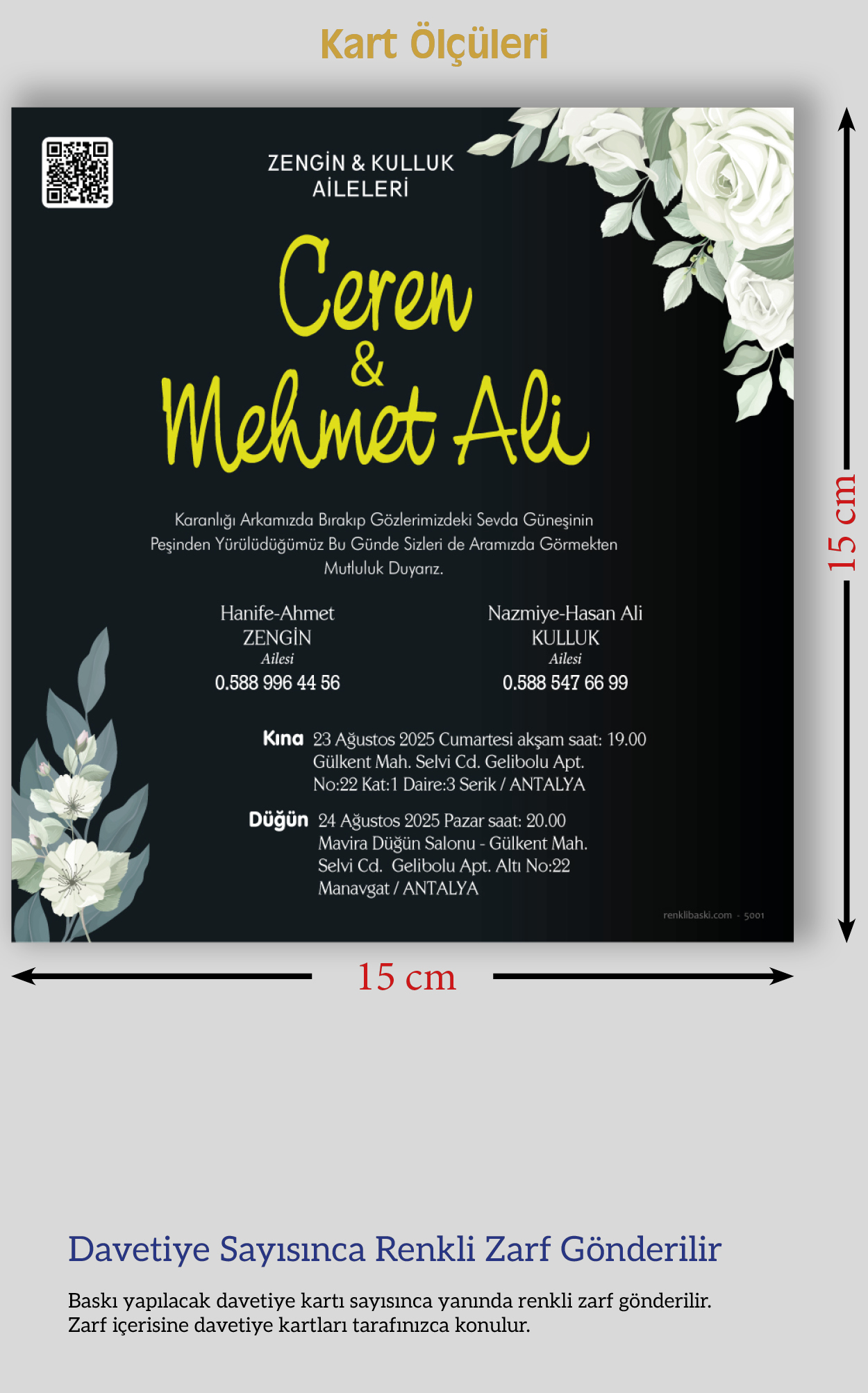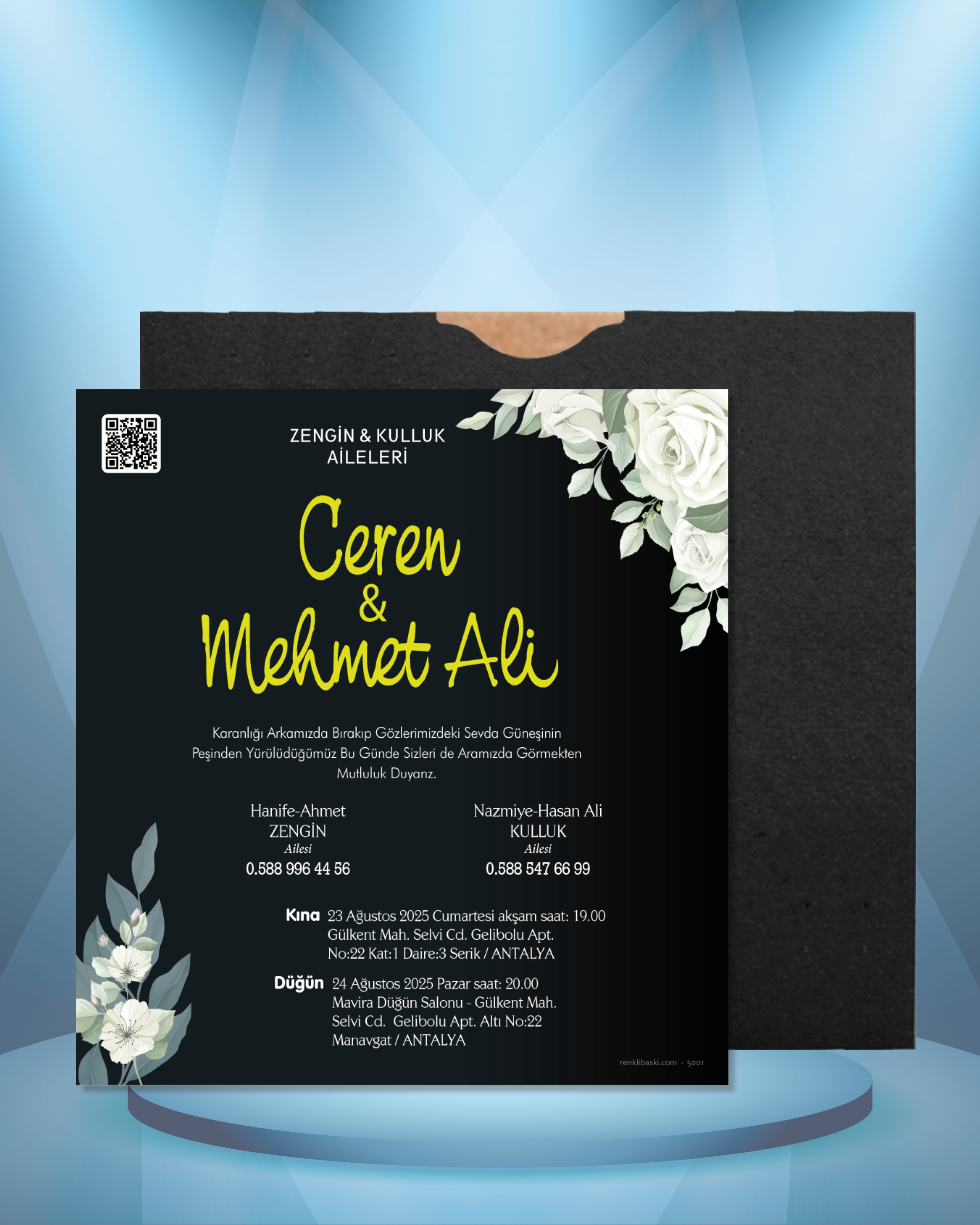 Tasarımda bulunan tüm yazı alanlarının değiştirilmesini talep edebilirsiniz. Hazırlanan davetiye tasarımının onayı alınmadan baskısı yapılmaz. Kargo içerisinde seçtiğiniz adet kadar davetiye kartı, isimlik ve ip gönderilir. İp ile isimliklerin bağlanma işlemi size aittir.