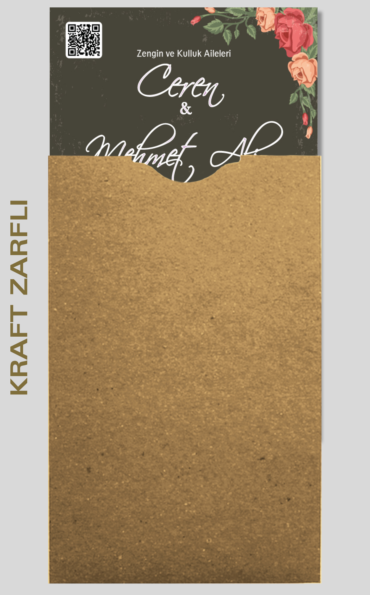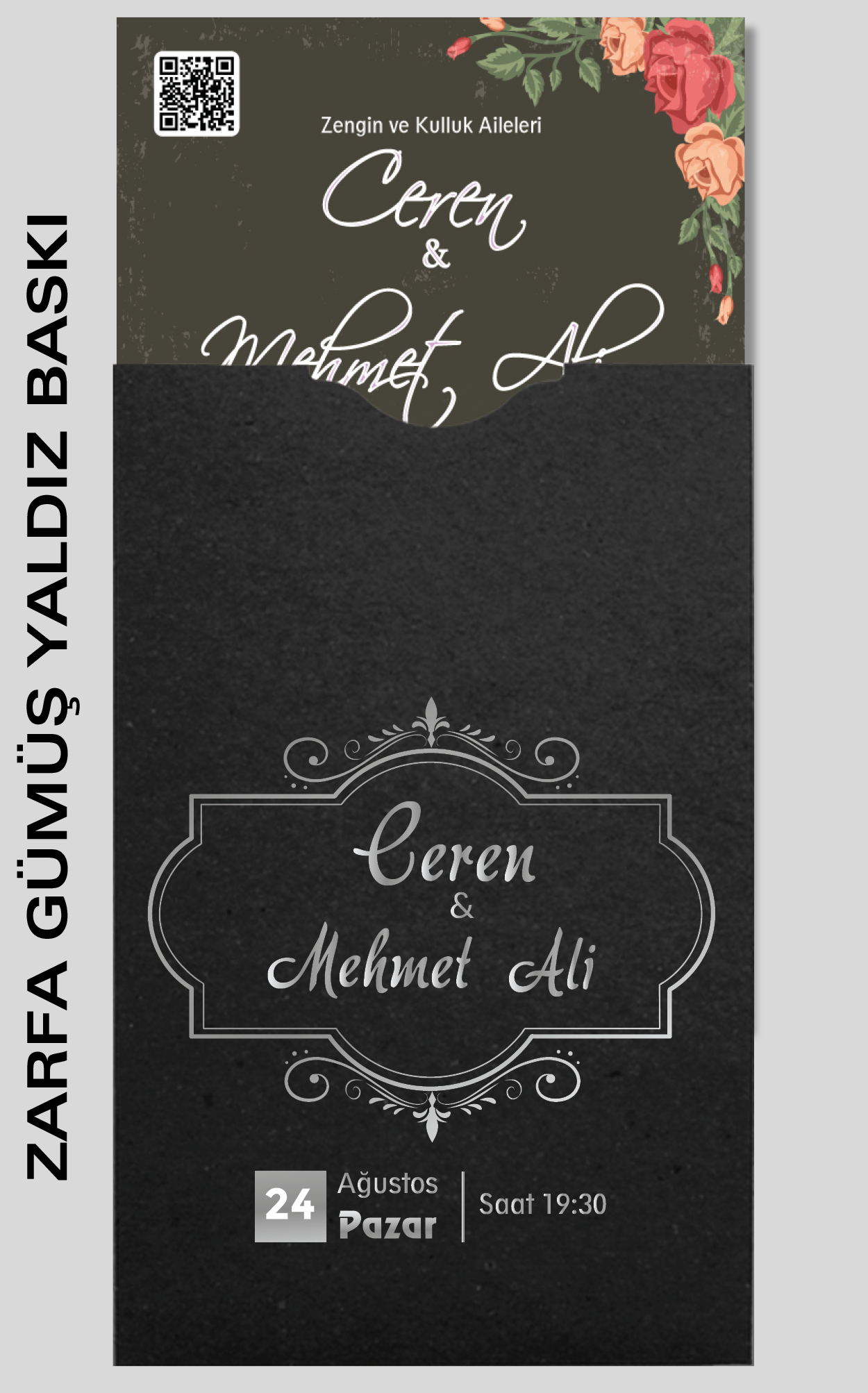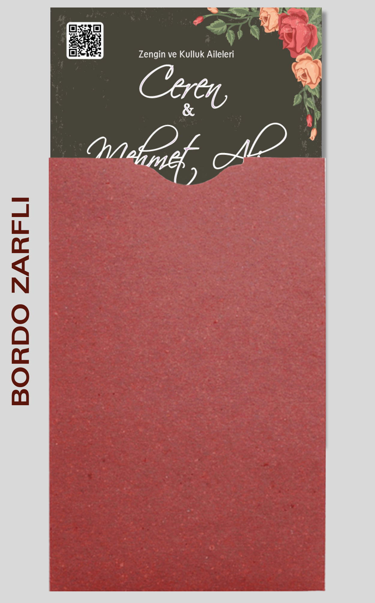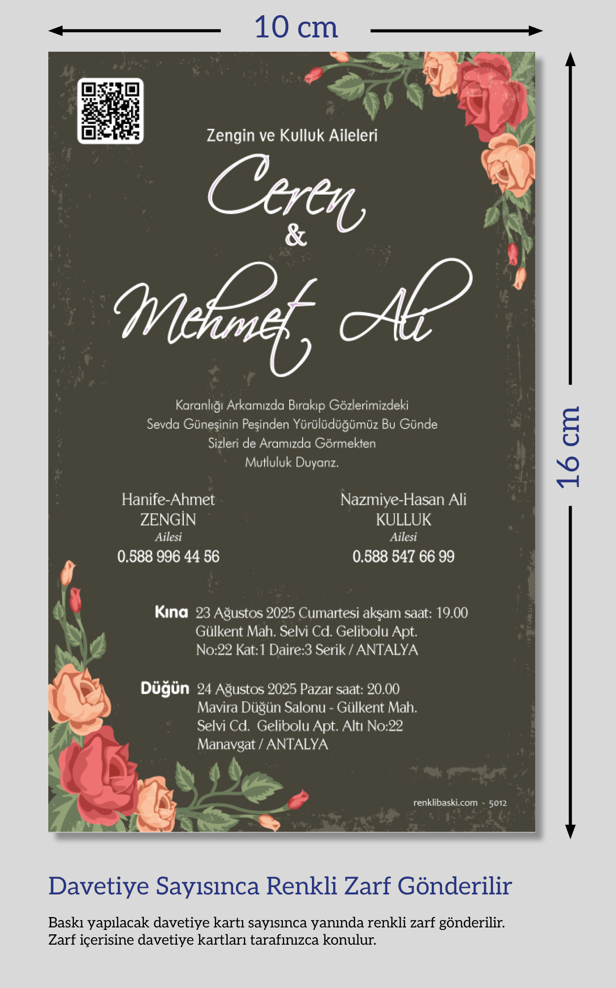 Davetiyemiz 10x16 cm ölçülerinde, dikey tasarıma sahiptir ve üst köşesinden delinerek isimlik ip ile bağlanmaktadır.