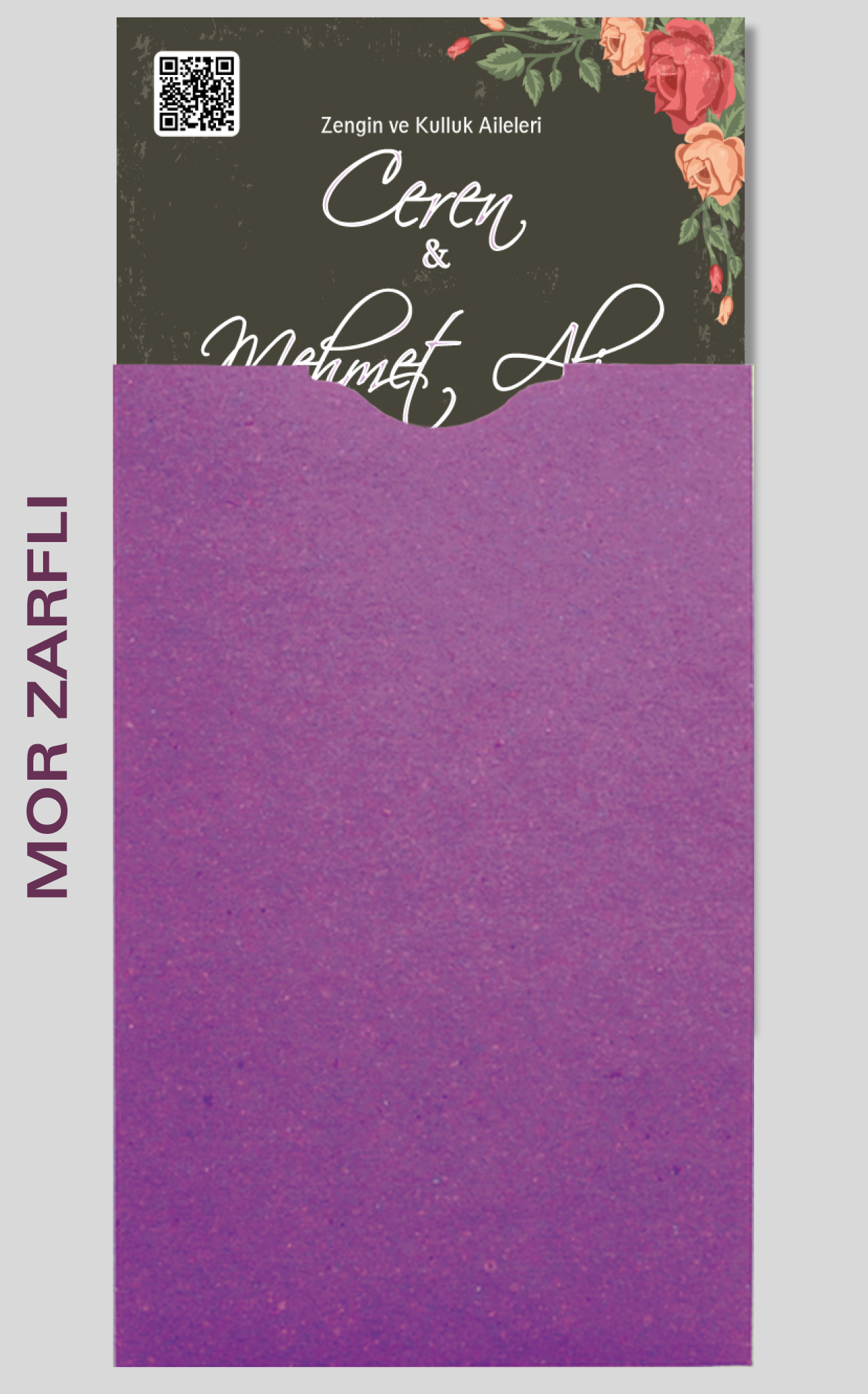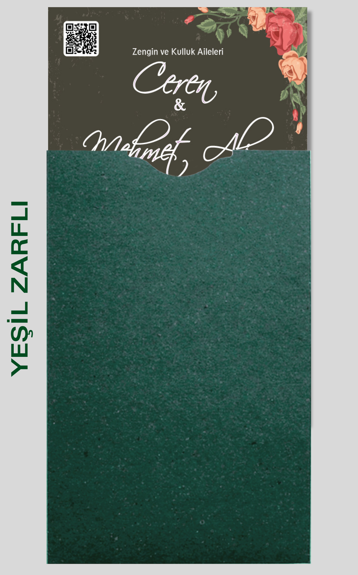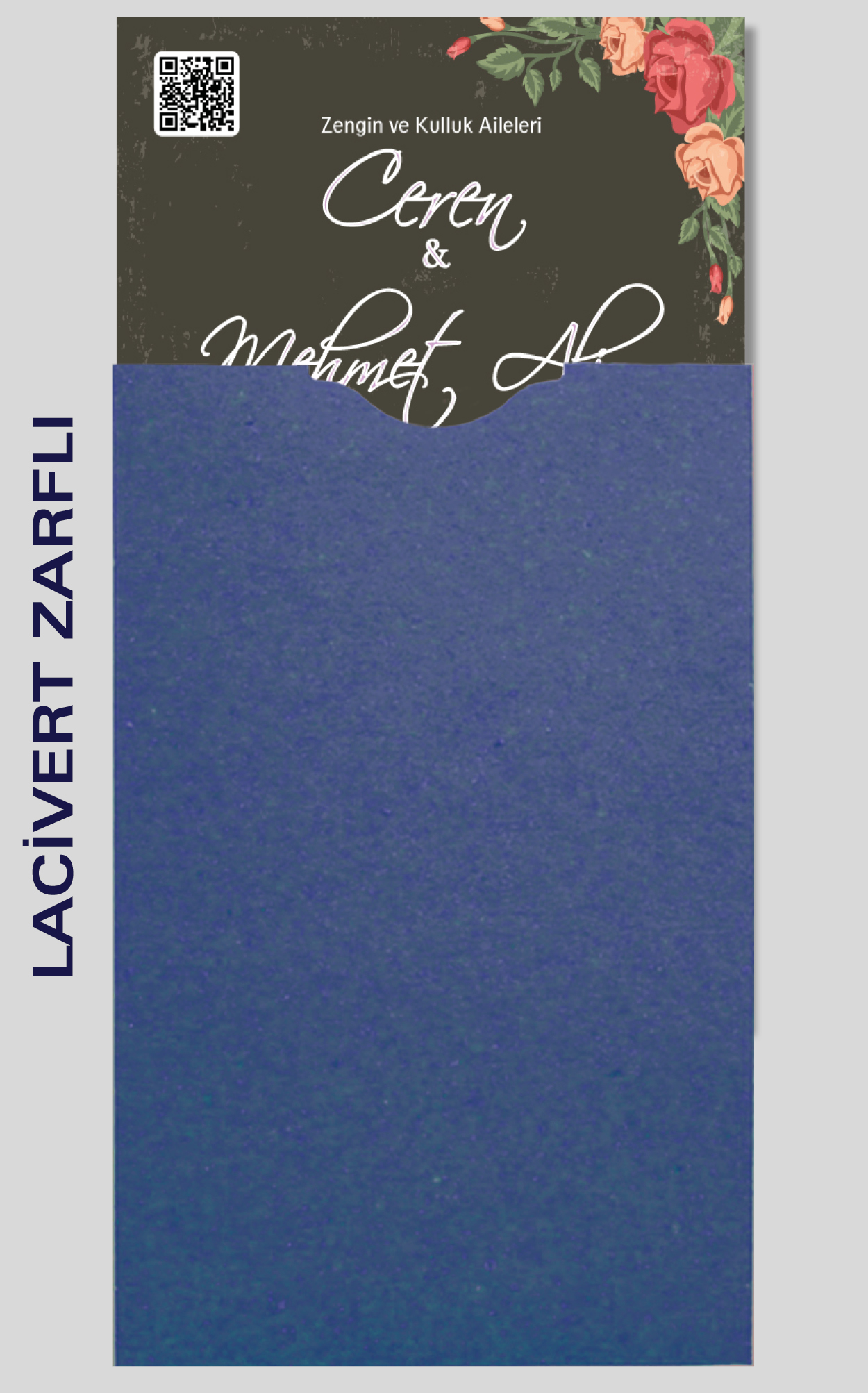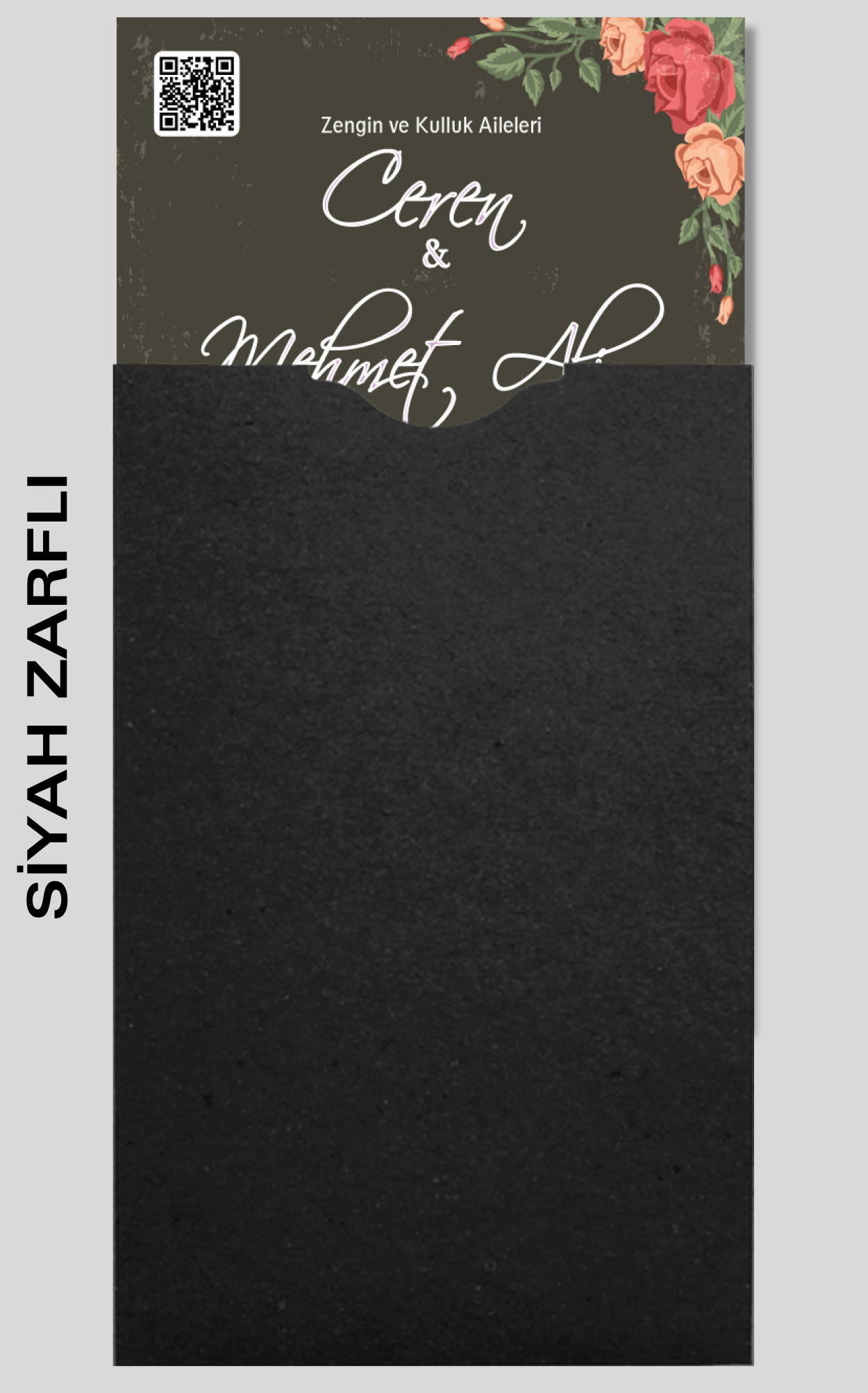Davetiyemiz 10x16 cm ölçülerinde, dikey tasarıma sahiptir ve üst köşesinden delinerek isimlik ip ile bağlanmaktadır.