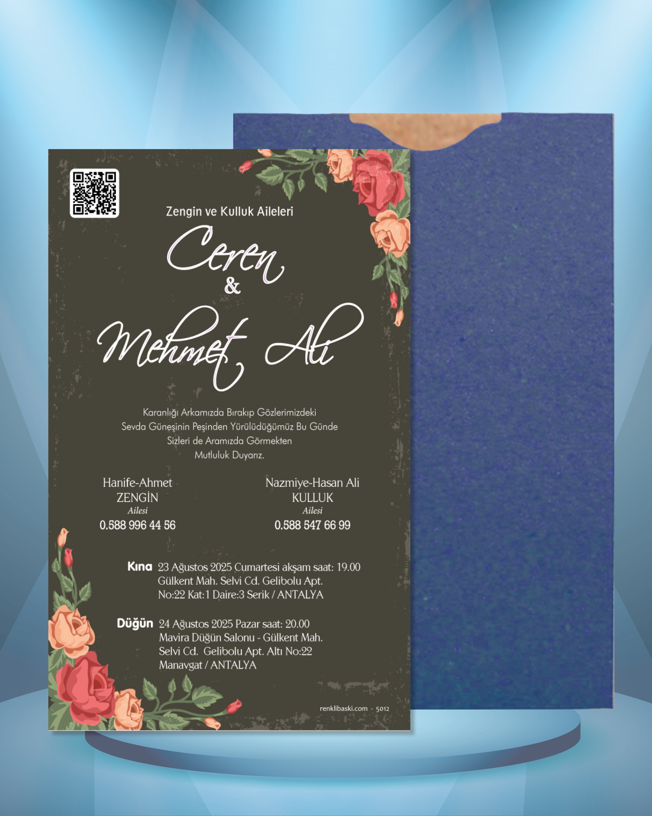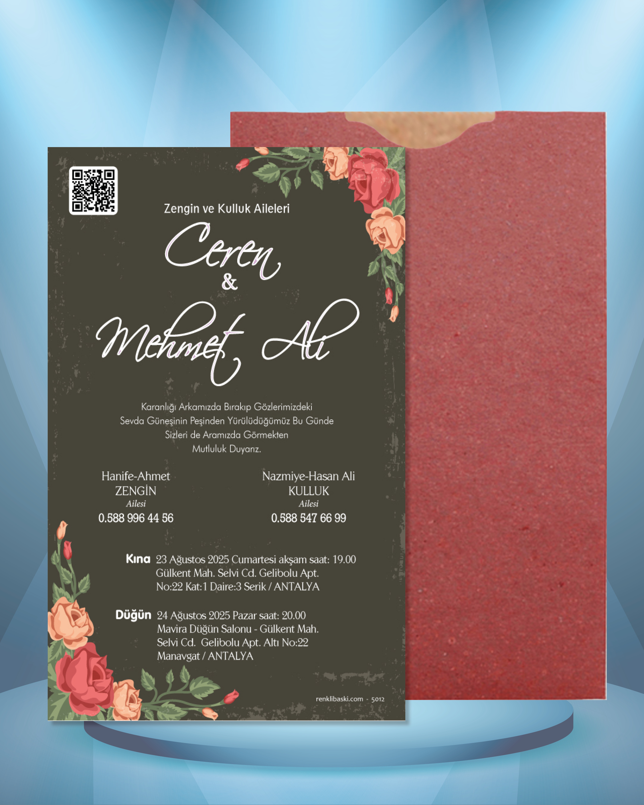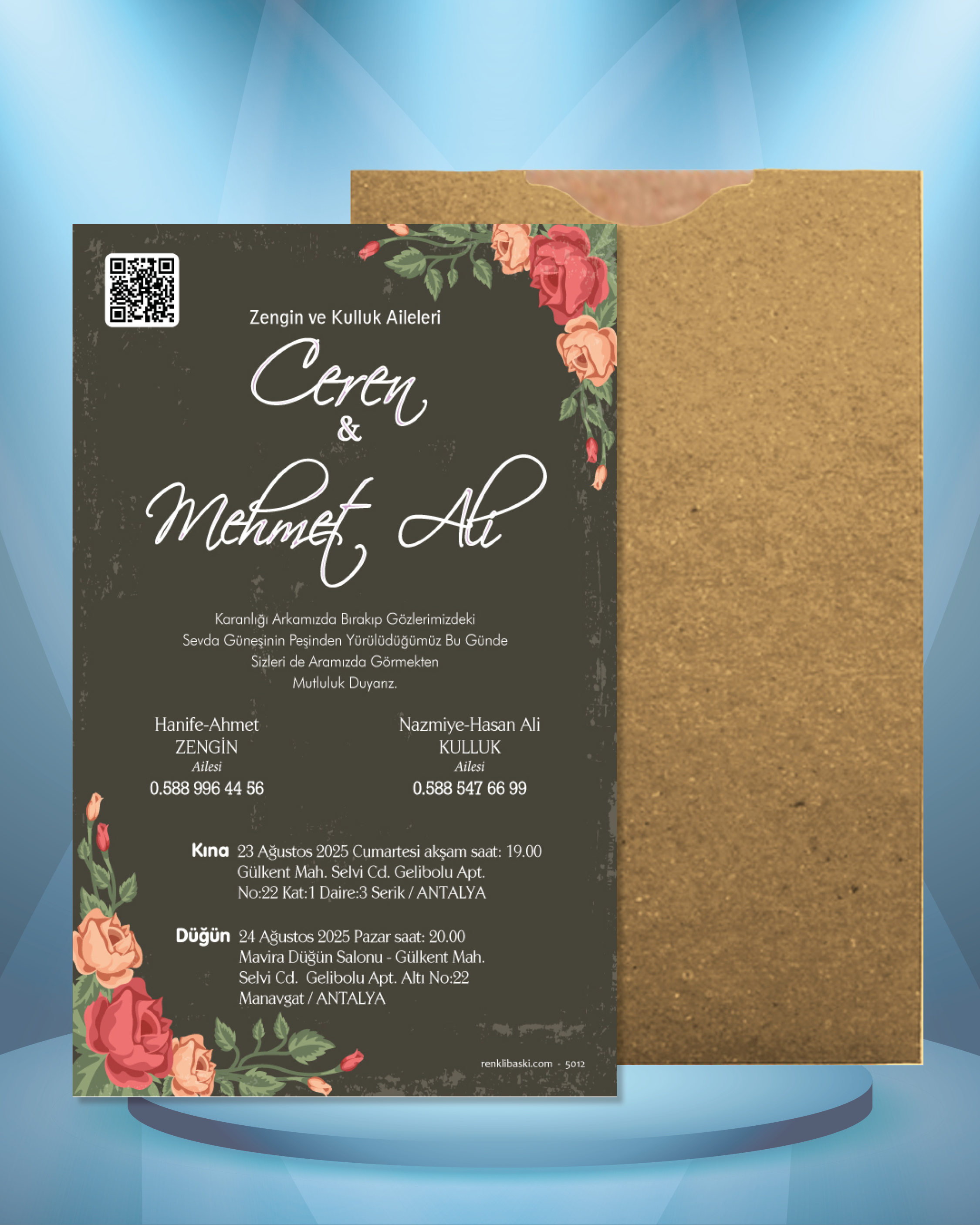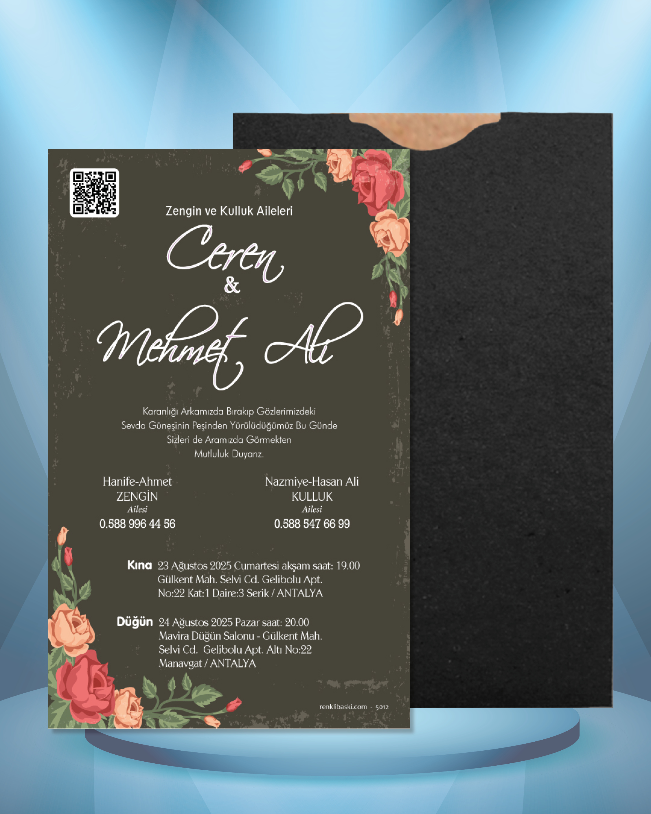 Tasarımda bulunan tüm yazı alanlarının değiştirilmesini talep edebilirsiniz. Hazırlanan davetiye tasarımının onayı alınmadan baskısı yapılmaz. Kargo içerisinde seçtiğiniz adet kadar davetiye kartı, isimlik ve ip gönderilir. İp ile isimliklerin bağlanma işlemi size aittir.