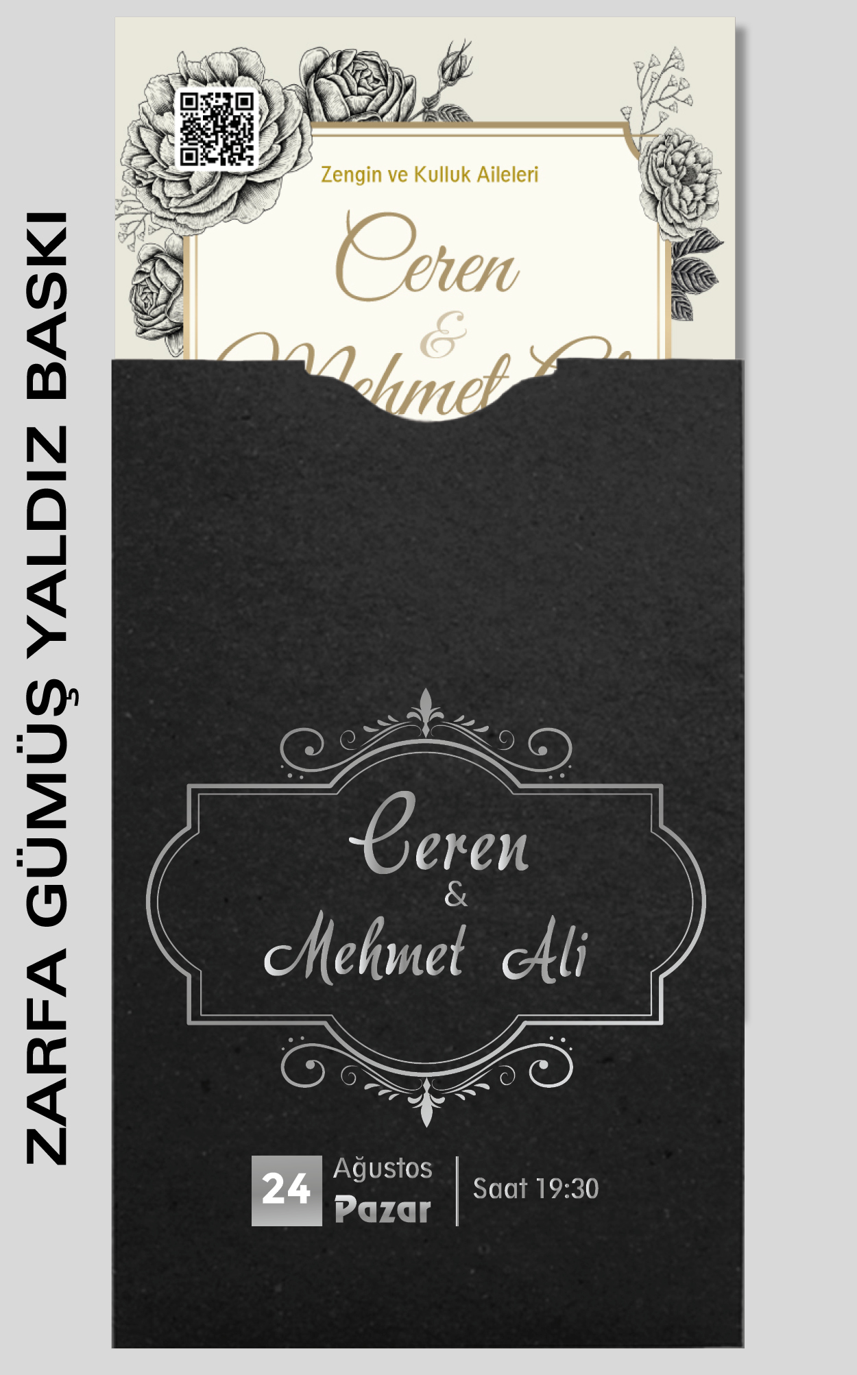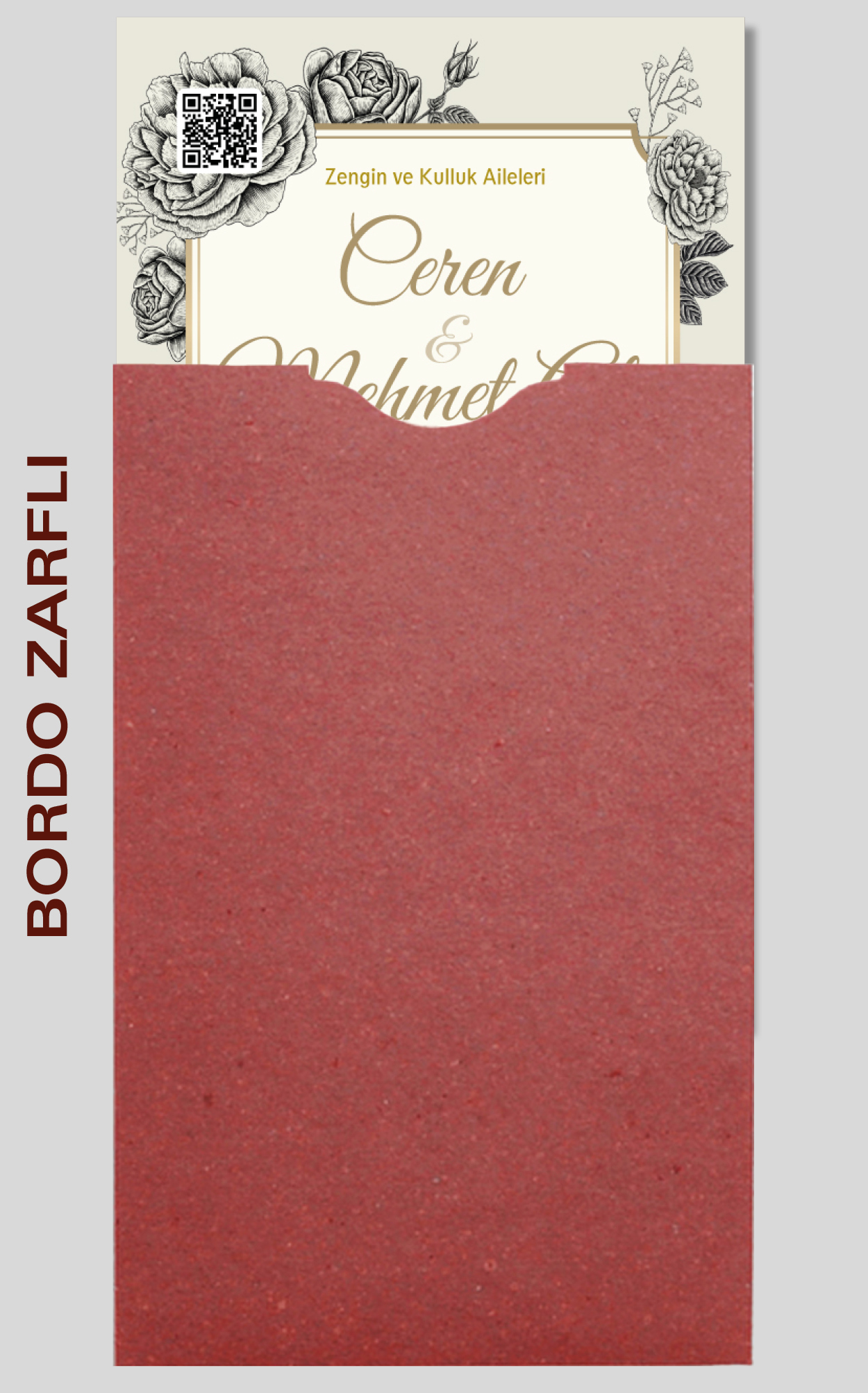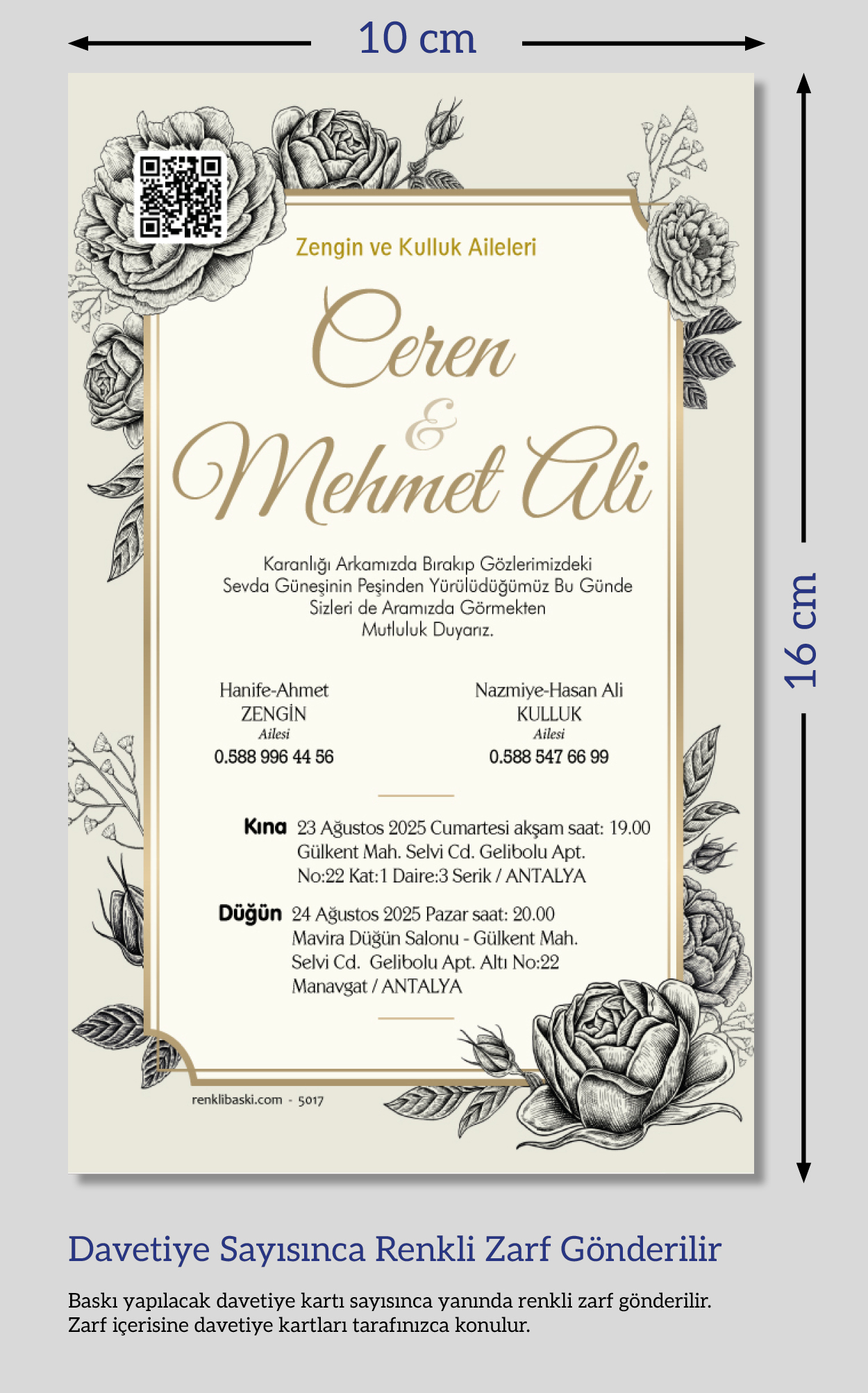 Davetiyemiz 10x16 cm ölçülerinde, dikey tasarıma sahiptir ve üst köşesinden delinerek isimlik ip ile bağlanmaktadır.