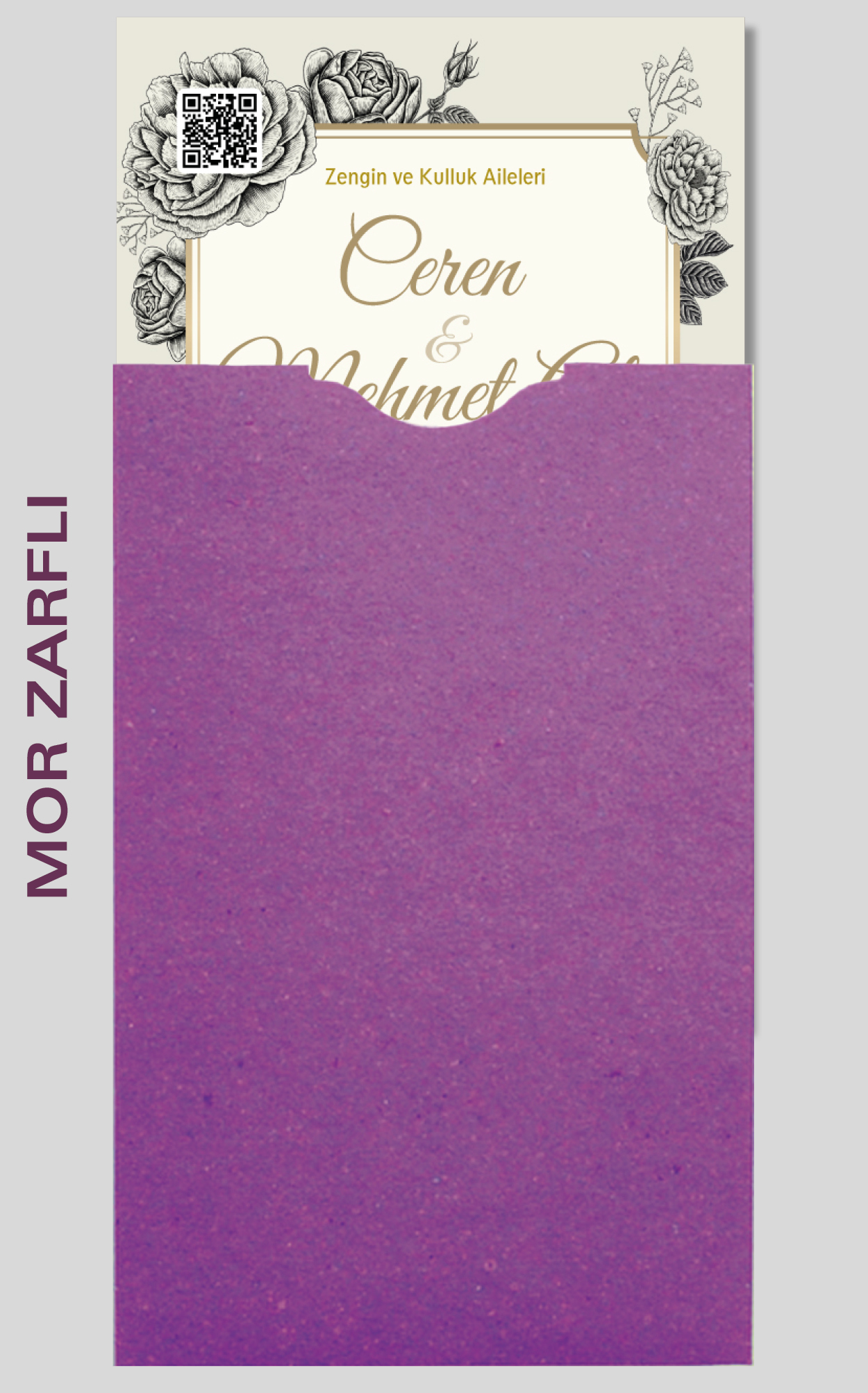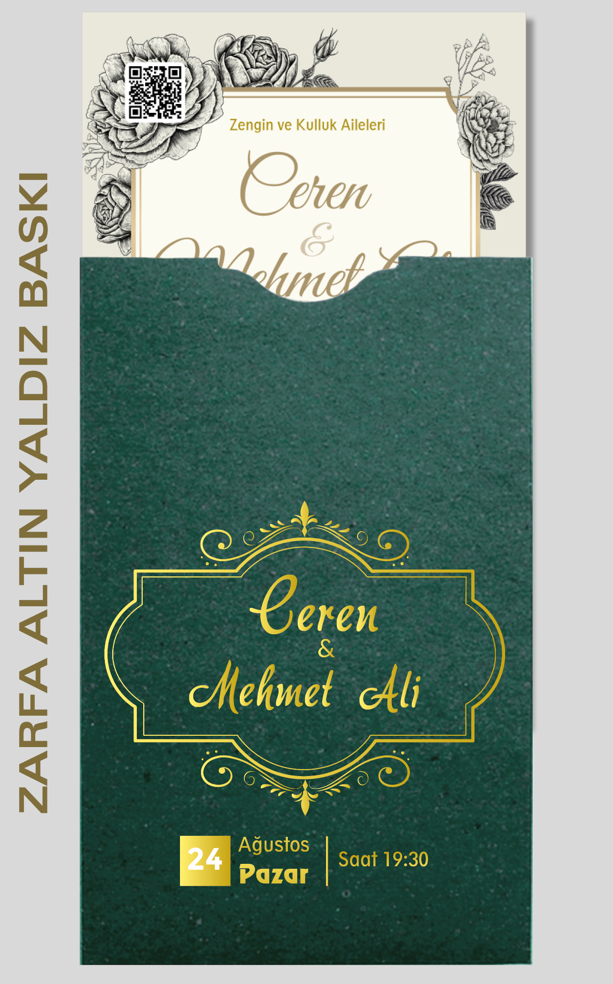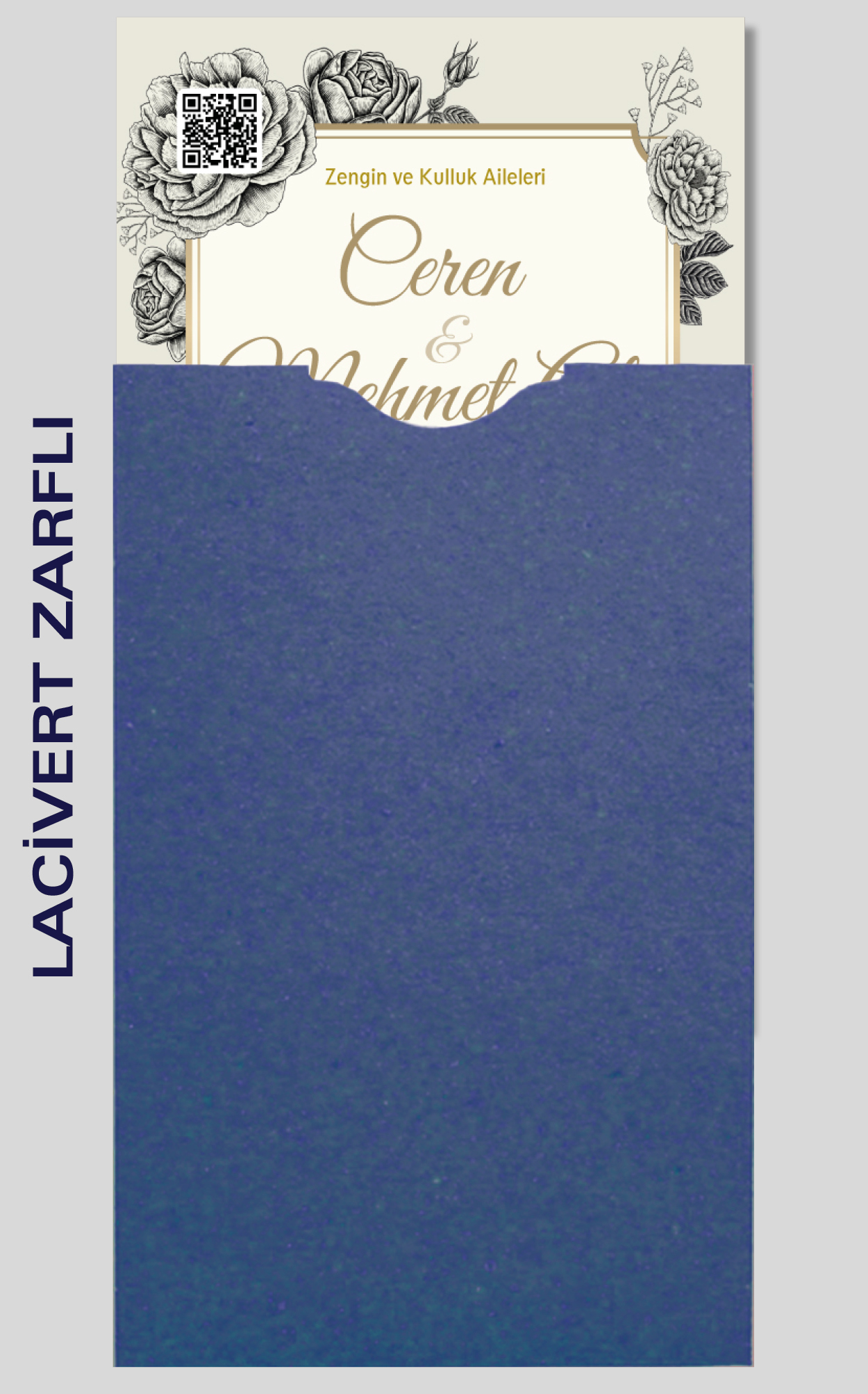 Davetiyemiz 10x16 cm ölçülerinde, dikey tasarıma sahiptir ve üst köşesinden delinerek isimlik ip ile bağlanmaktadır.