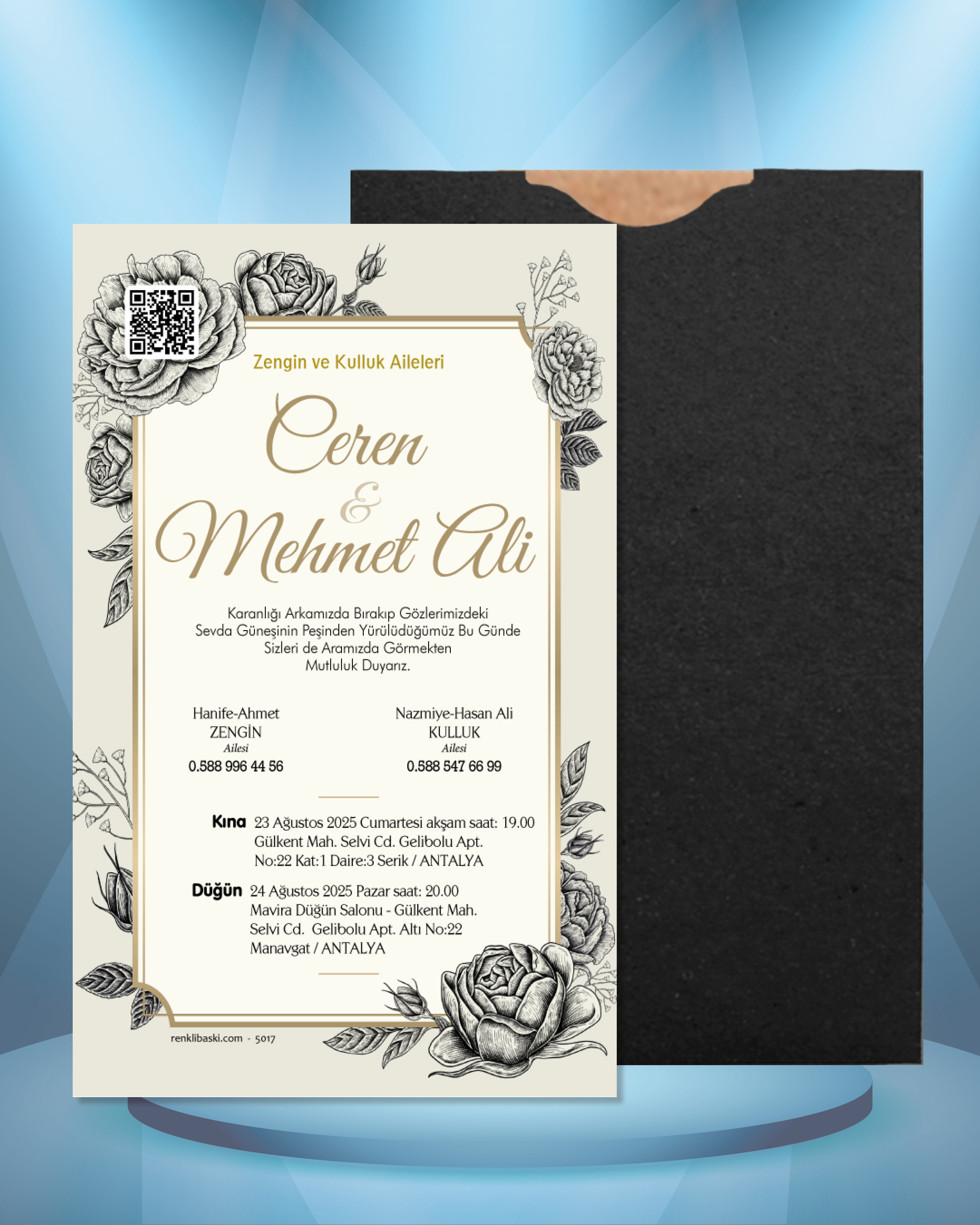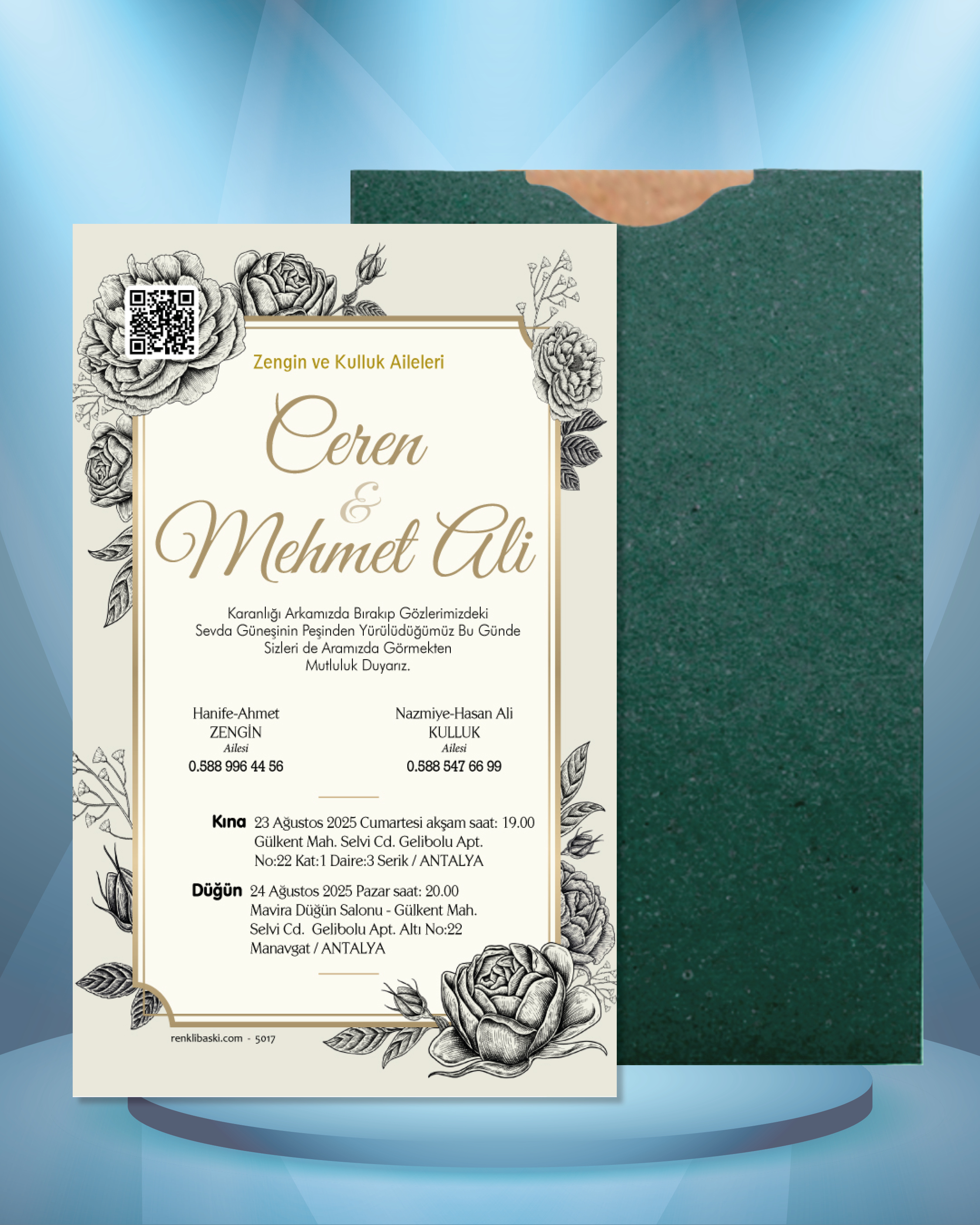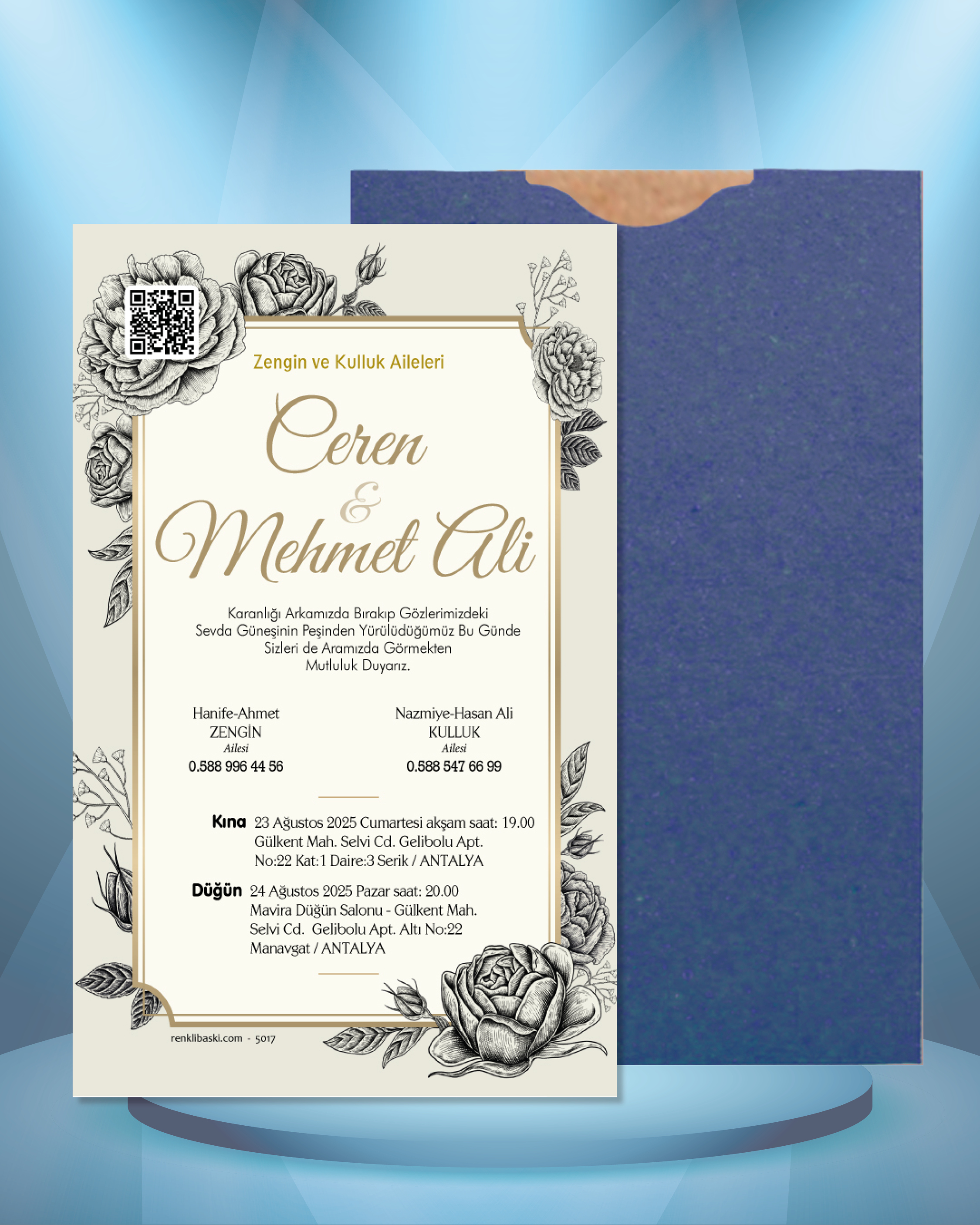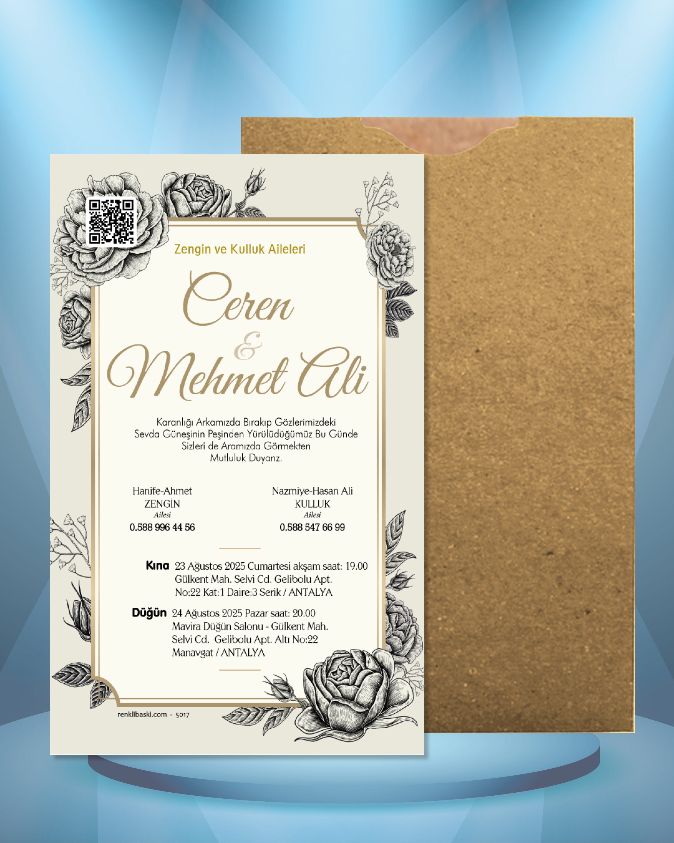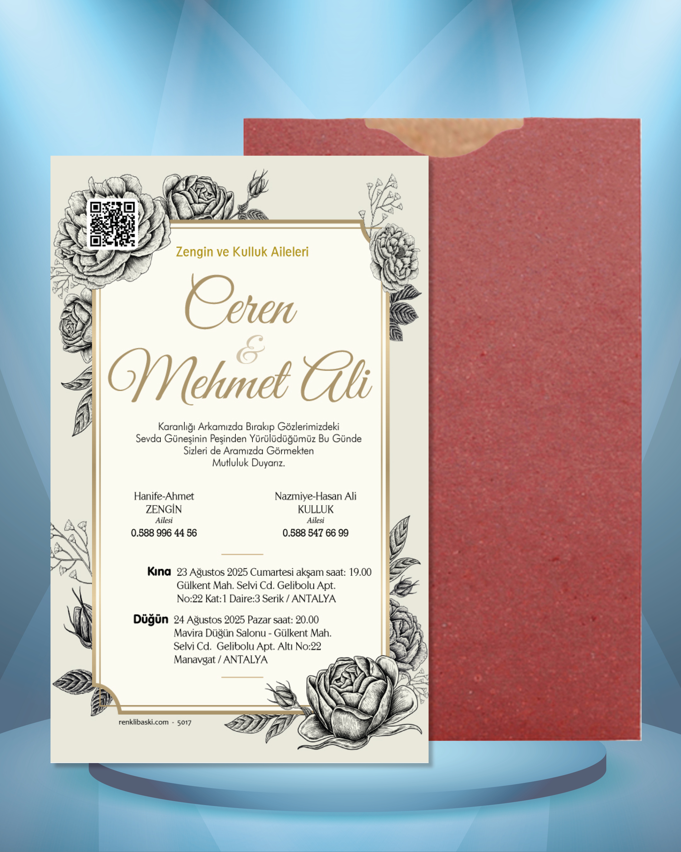 Tasarımda bulunan tüm yazı alanlarının değiştirilmesini talep edebilirsiniz. Hazırlanan davetiye tasarımının onayı alınmadan baskısı yapılmaz. Kargo içerisinde seçtiğiniz adet kadar davetiye kartı, isimlik ve ip gönderilir. İp ile isimliklerin bağlanma işlemi size aittir.